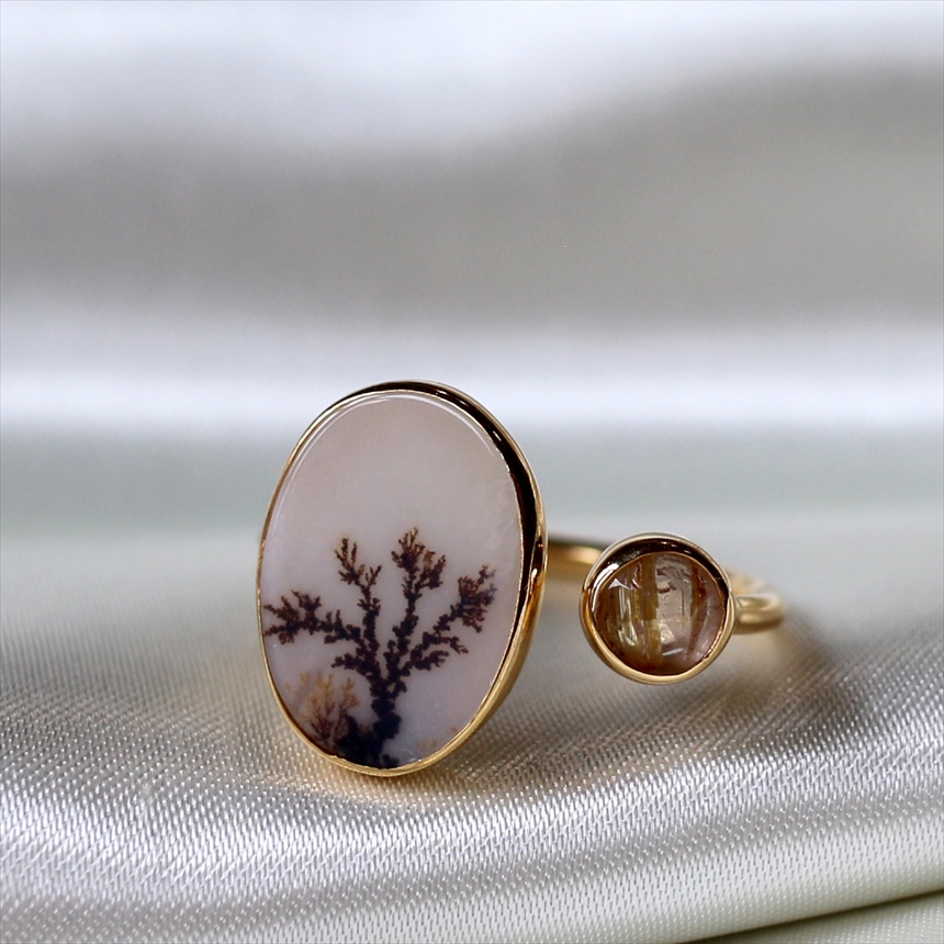 やわらかな乳白色の水晶の中にシダ植物のような模様(内包物)が広がるデンドライトと、黄金の針が輝くルチルクォーツを配した、まるで指先の美術館のようなリングです。一粒ごとに異なる絵画のような天然石の表情が、手元を見るたびに深い癒やしを与えてくれます。