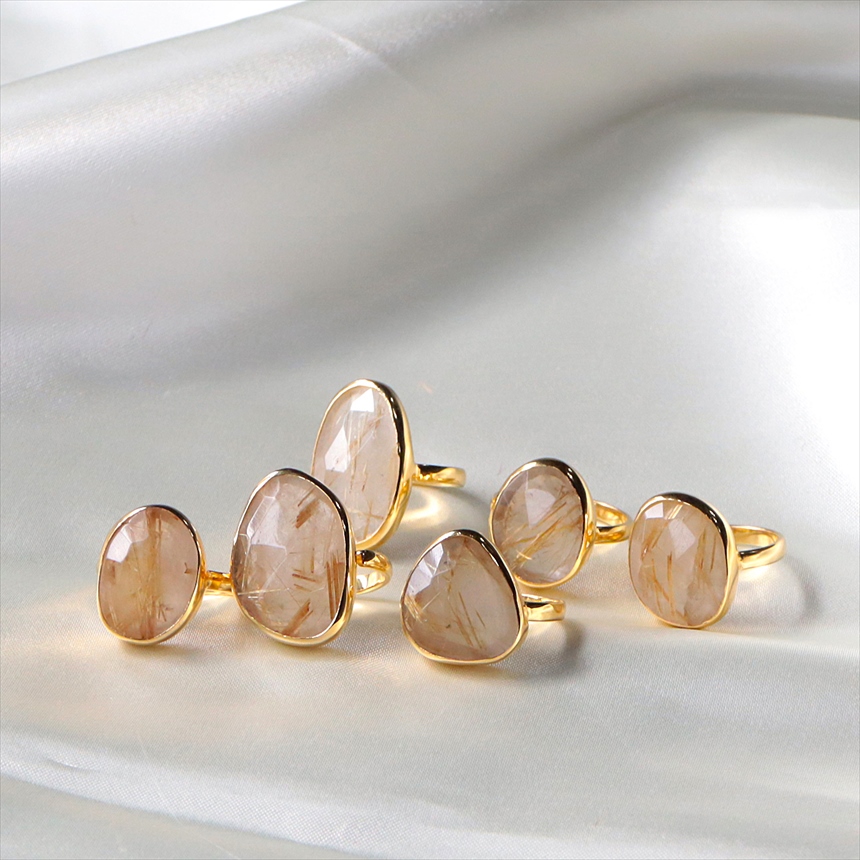 クリアなクォーツの中に繊細なゴールドの針(ルチル)が閉じ込められた、自然が生んだ神秘ともいえる、ルチルクォーツのリングです。肌に溶け込むヌーディーな色調にゴールドが煌めき、手元をより洗練された知的な印象にみせてくれます。