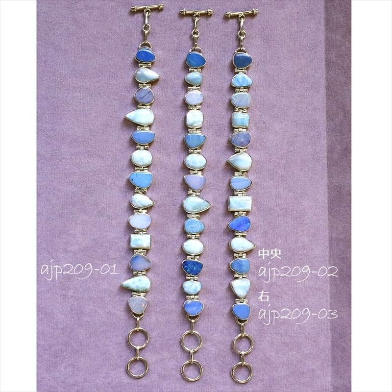 ブレスレットに仕立てられてあるものをインド・ジャイプールの工房から買い付けています。オパールの色は白から水色、やや紫がかったものもあり、それぞれに遊色効果が見られます。※写真の現品をお届けします。オパール7粒、ラリマー6粒。