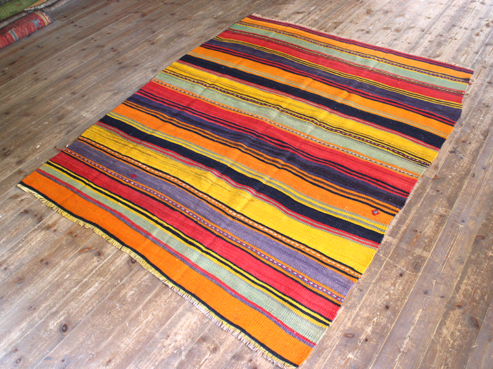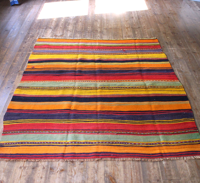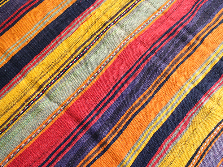シンプルなボーダーキリムです。あまり日焼けしておらず、全体に色が濃くのこっていてきれいな状態です。