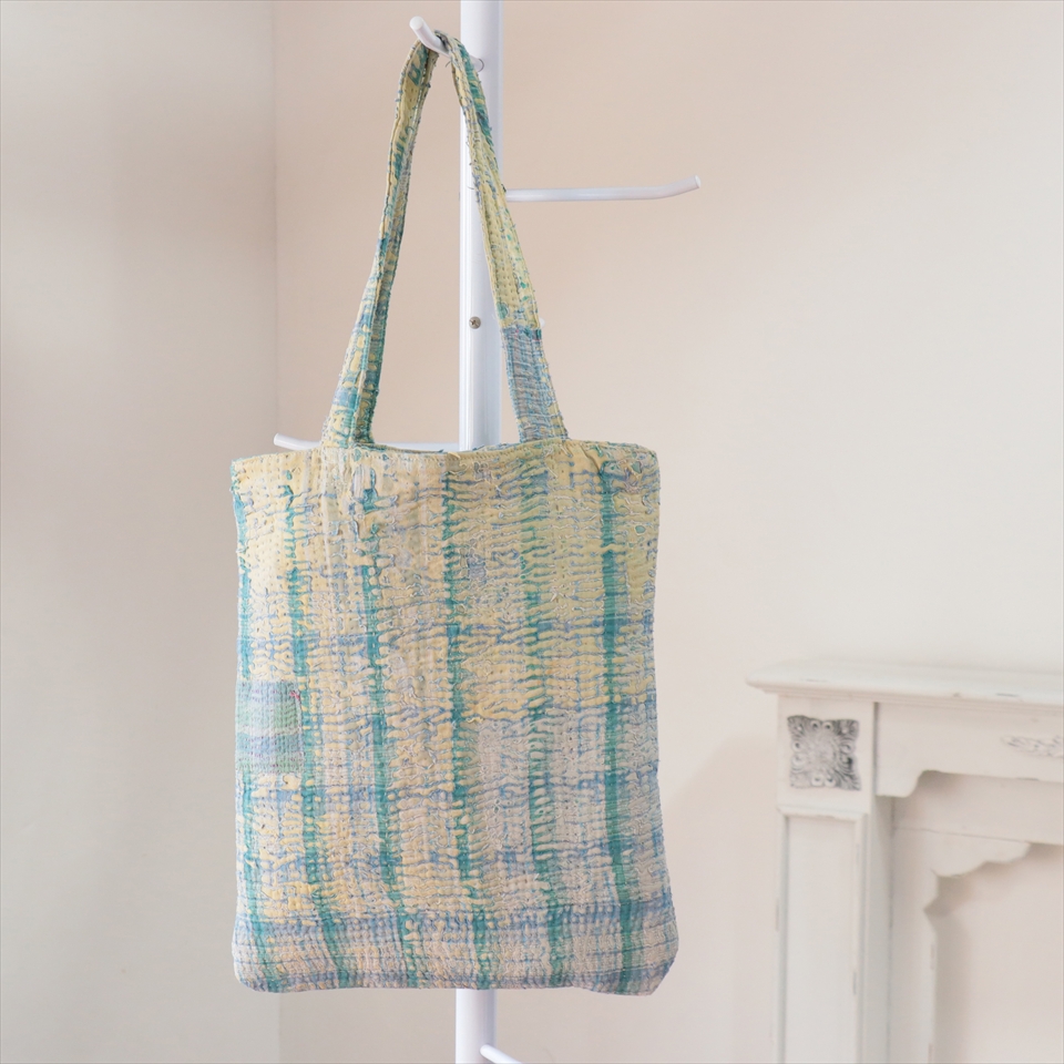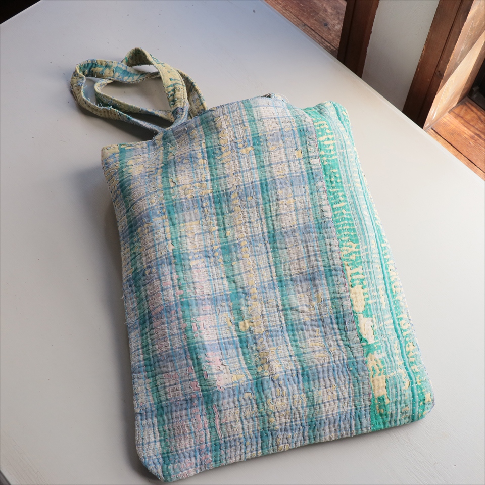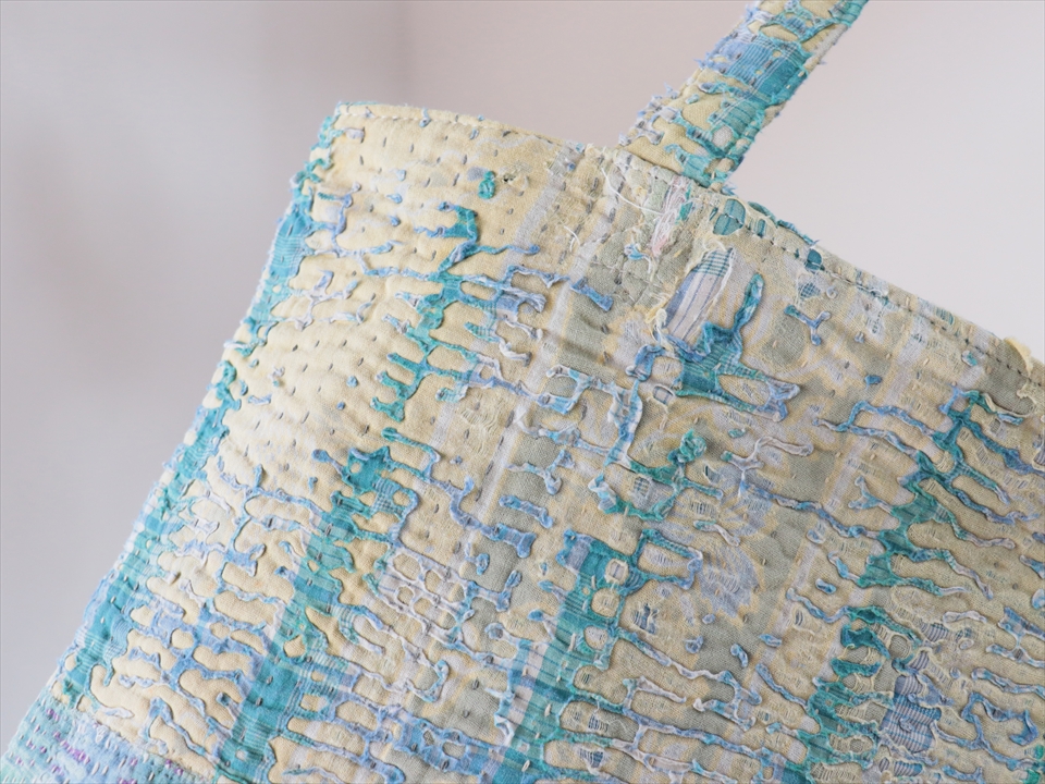 使い古された民族衣装のサリーやドゥパタを重ねて、刺し子刺繍をした伝統的な手仕事の布を使っています。表面のコットンは擦り切れているところもあるほど使い込まれていて、ヴィンテージ感たっぷり。コットンのやわらかな肌触りが心地よく、普段使いのバッグとして活躍してくれそうです。
