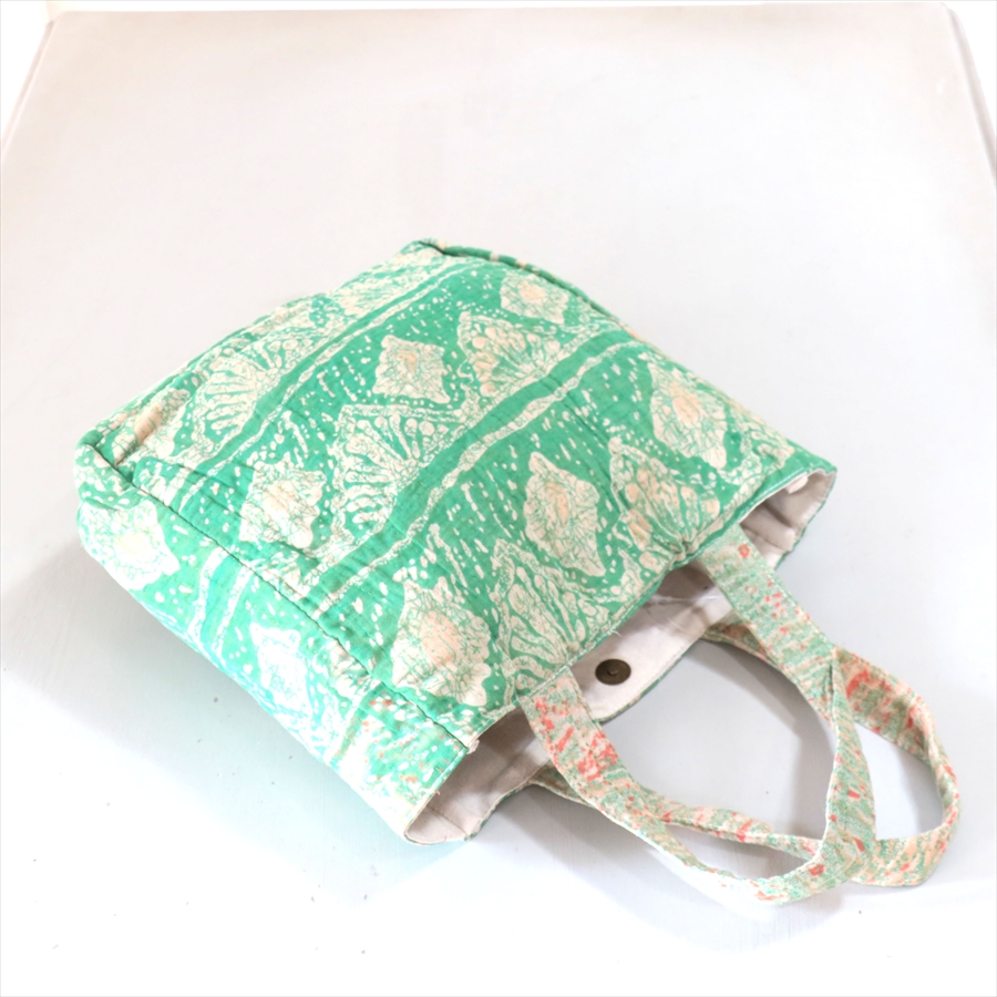 使い古された民族衣装のサリーやドゥパタを重ねて、刺し子刺繍をした伝統的な手仕事の布を使っています。表面のコットンは擦り切れているところもあるほど使い込まれていて、ヴィンテージ感たっぷり。コットンのやわらかな肌触りが心地よく、普段使いのバッグとして活躍してくれそうです。