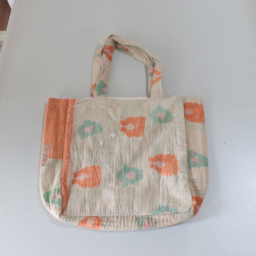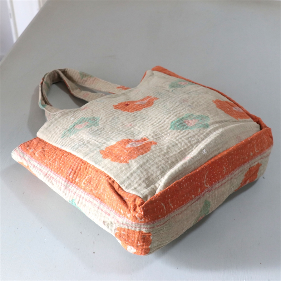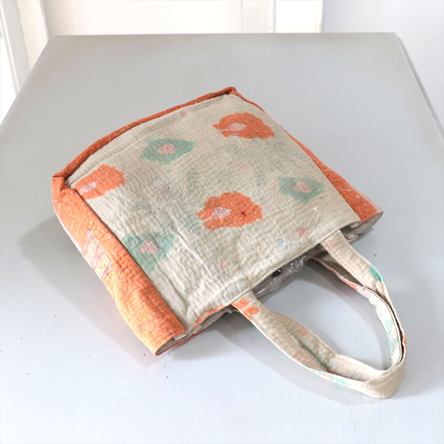 使い古された民族衣装のサリーやドゥパタを重ねて、刺し子刺繍をした伝統的な手仕事の布を使っています。表面のコットンは擦り切れているところもあるほど使い込まれていて、ヴィンテージ感たっぷり。コットンのやわらかな肌触りが心地よく、普段使いのバッグとして活躍してくれそうです。