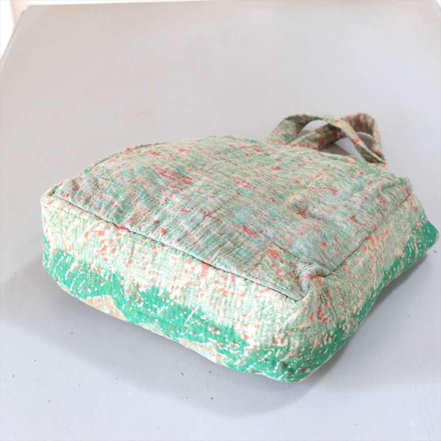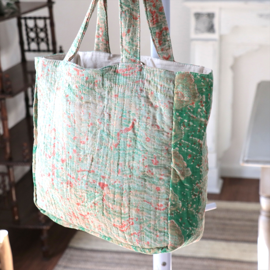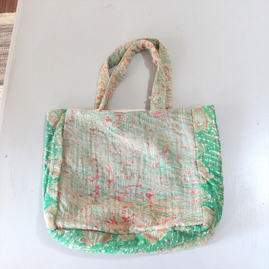 使い古された民族衣装のサリーやドゥパタを重ねて、刺し子刺繍をした伝統的な手仕事の布を使っています。表面のコットンは擦り切れているところもあるほど使い込まれていて、ヴィンテージ感たっぷり。コットンのやわらかな肌触りが心地よく、普段使いのバッグとして活躍してくれそうです。