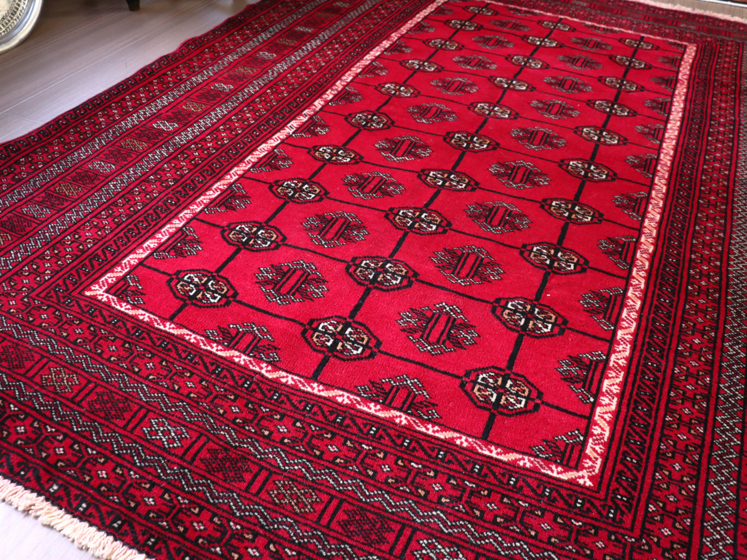 中央アジアからアフガン・パキスタンなどに住むトルクメン族のカーペット。ギュルと呼ばれる文様が連なる伝統的なデザインです。横幅が広い長方形で、使いやすい一枚。赤の色はずっしりと重たい感じではなく、わずかにピンクがかった明るめの色です。