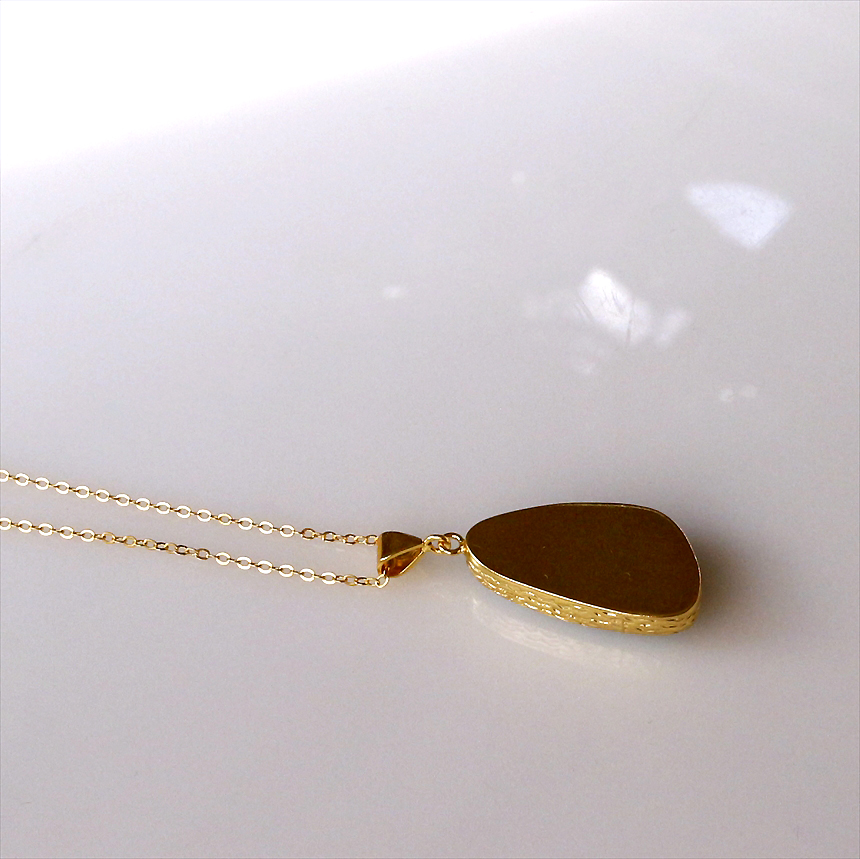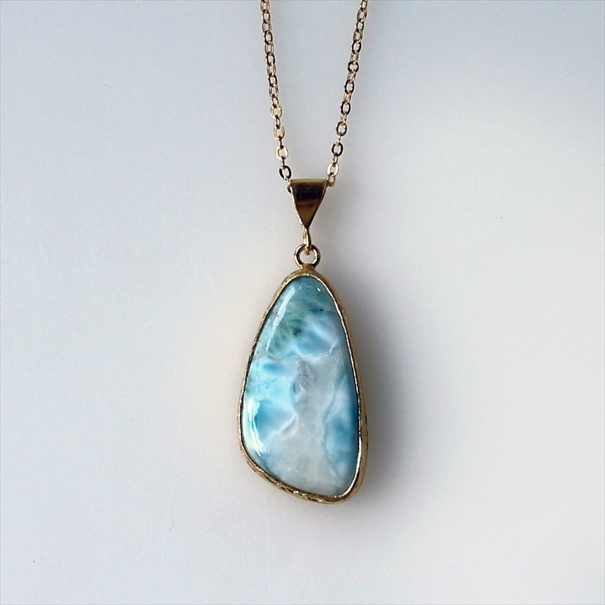 艶やかなブルーと白が何層にも重なり、美しい模様を描く、ラリマーのネックレス。つるんとした質感と、厚みのある立体的なフォルムが魅力です。ゴールドの縁取りが、ラリマーの鮮やかさを上品に引き立てます。