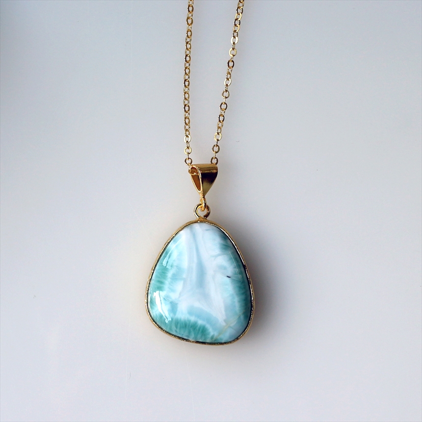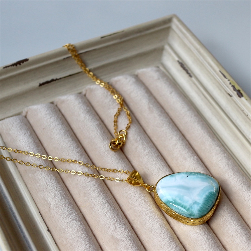 艶やかなブルーと白が何層にも重なり、美しい模様を描く、ラリマーのネックレス。つるんとした質感と、厚みのある立体的なフォルムが魅力です。ゴールドの縁取りが、ラリマーの鮮やかさを上品に引き立てます。