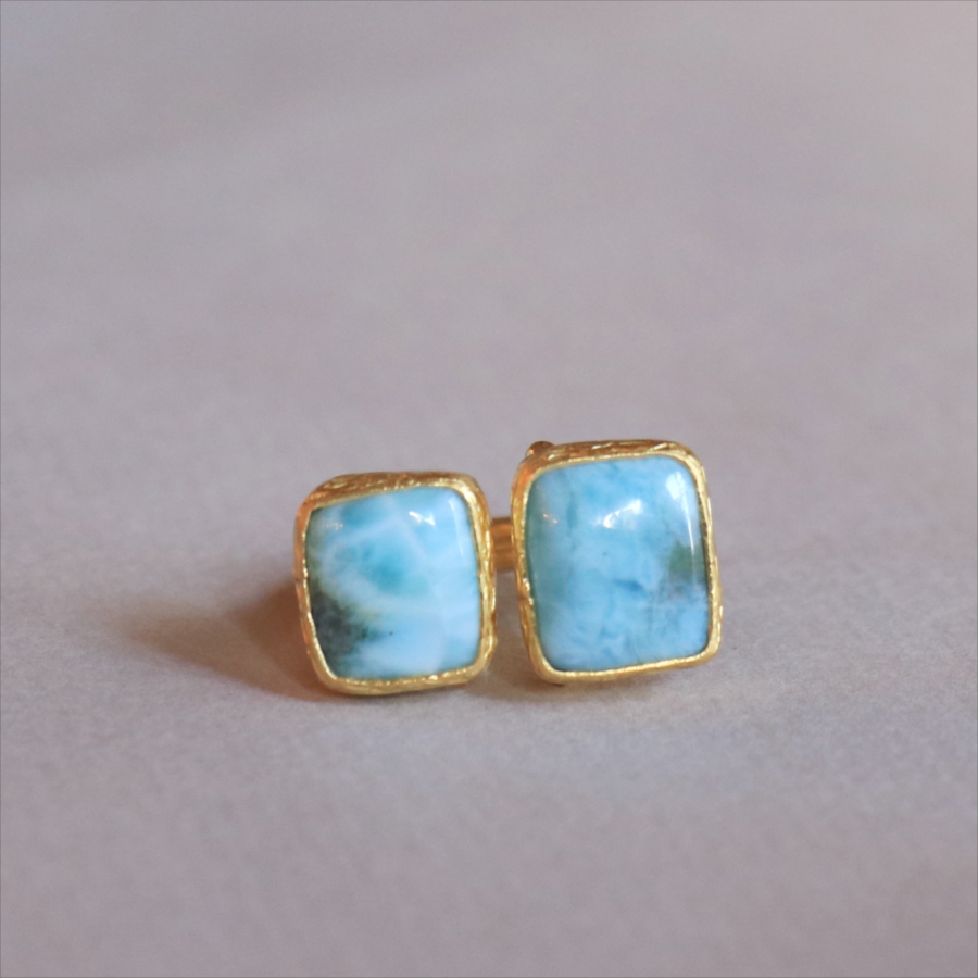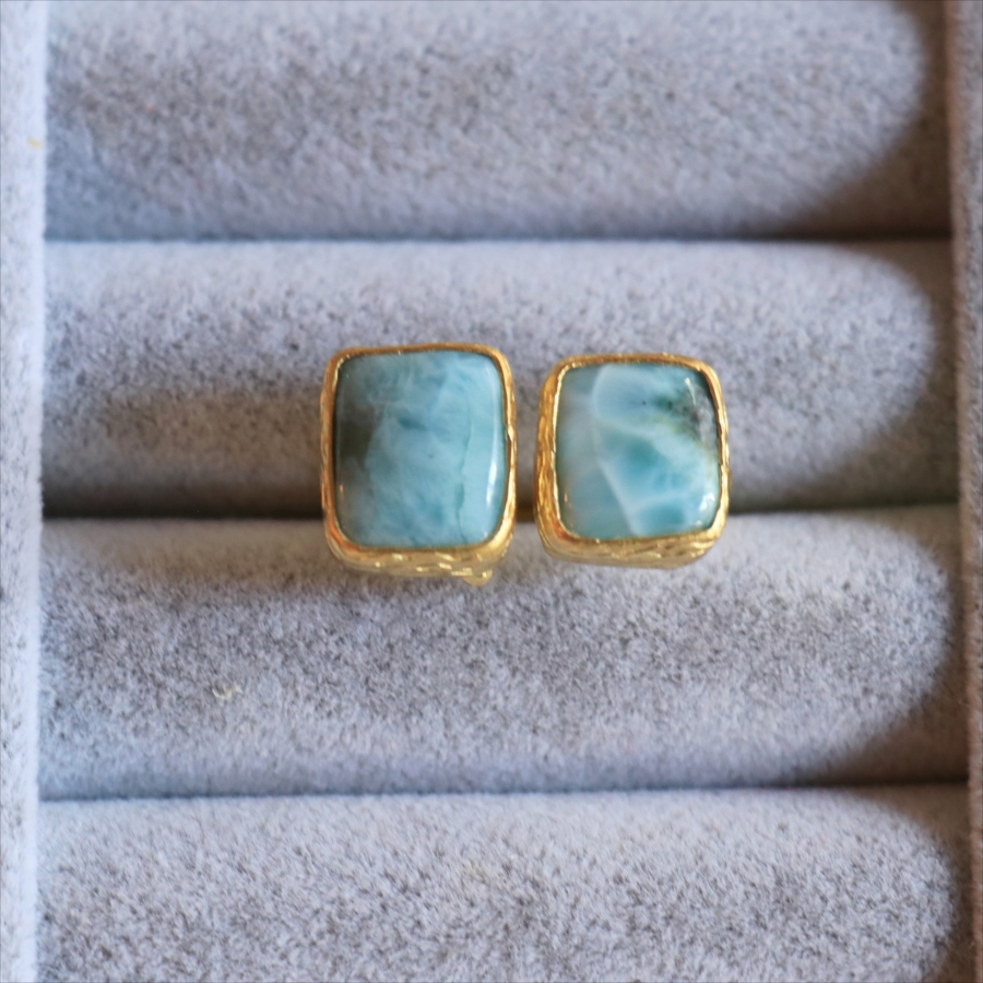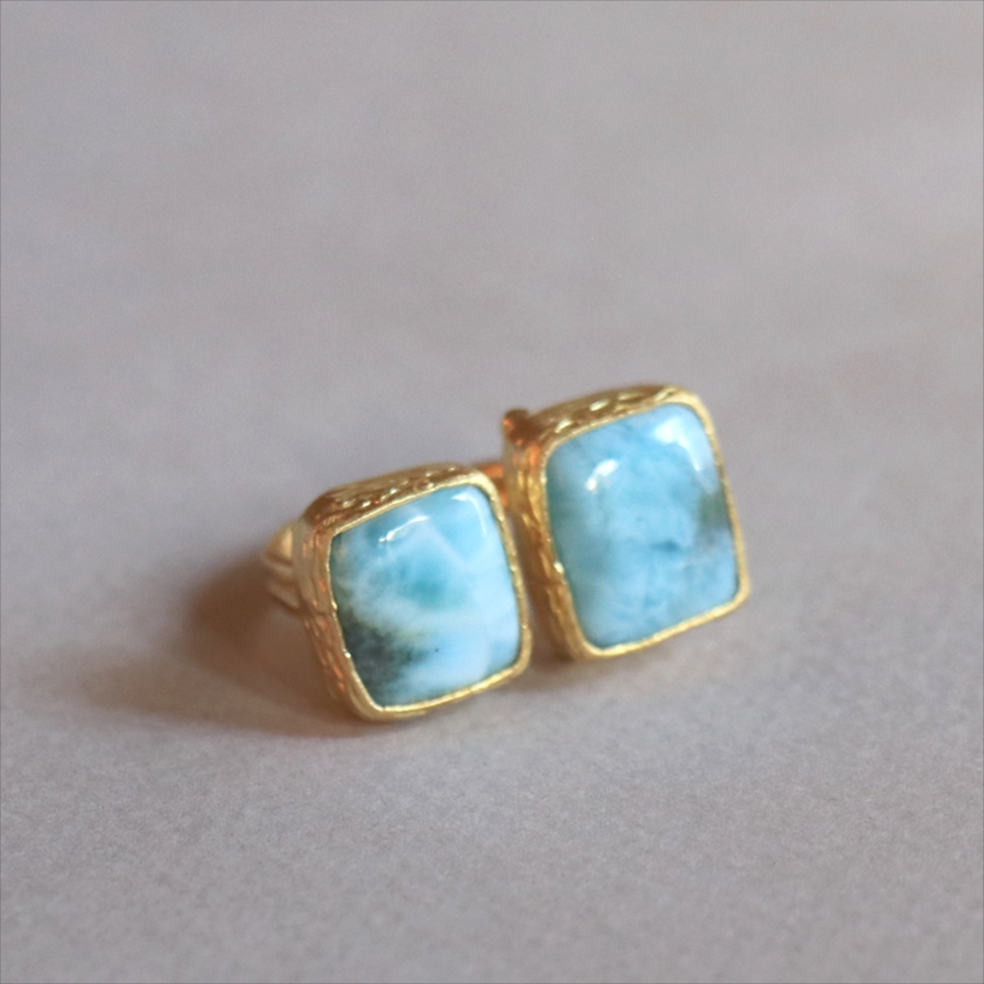 海に映る雲のような模様が広がる、優しいブルーが美しいラリマーダブルリングです。スクエア形のふたつの石が寄り添うように並ぶデザイン。シンプルながらも個性的が光る一点ものジュエリーです。