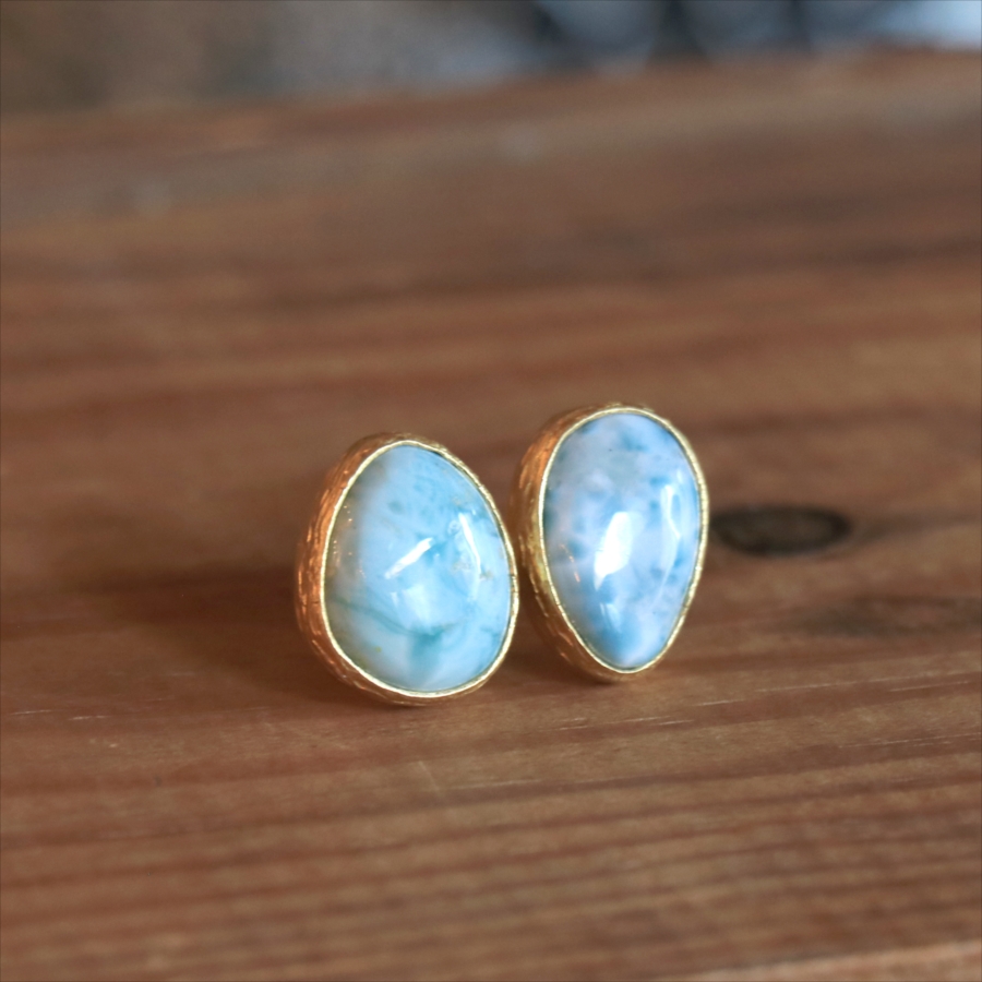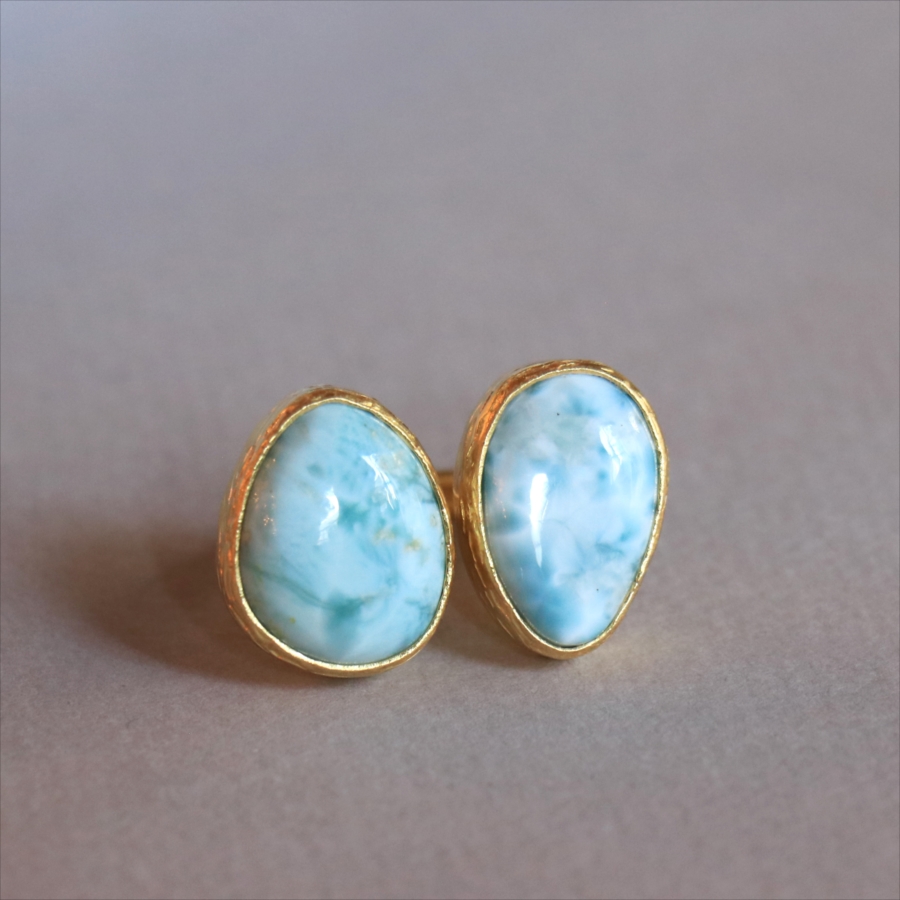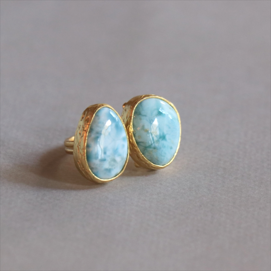海に映る雲のような模様が広がる、優しいブルーが美しいラリマーダブルリングです。形の違うふたつの石が寄り添うように並ぶデザイン。大粒で立体感があり、シンプルながらも個性的が光る一点ものジュエリーです。