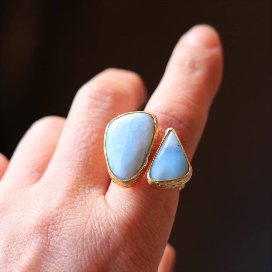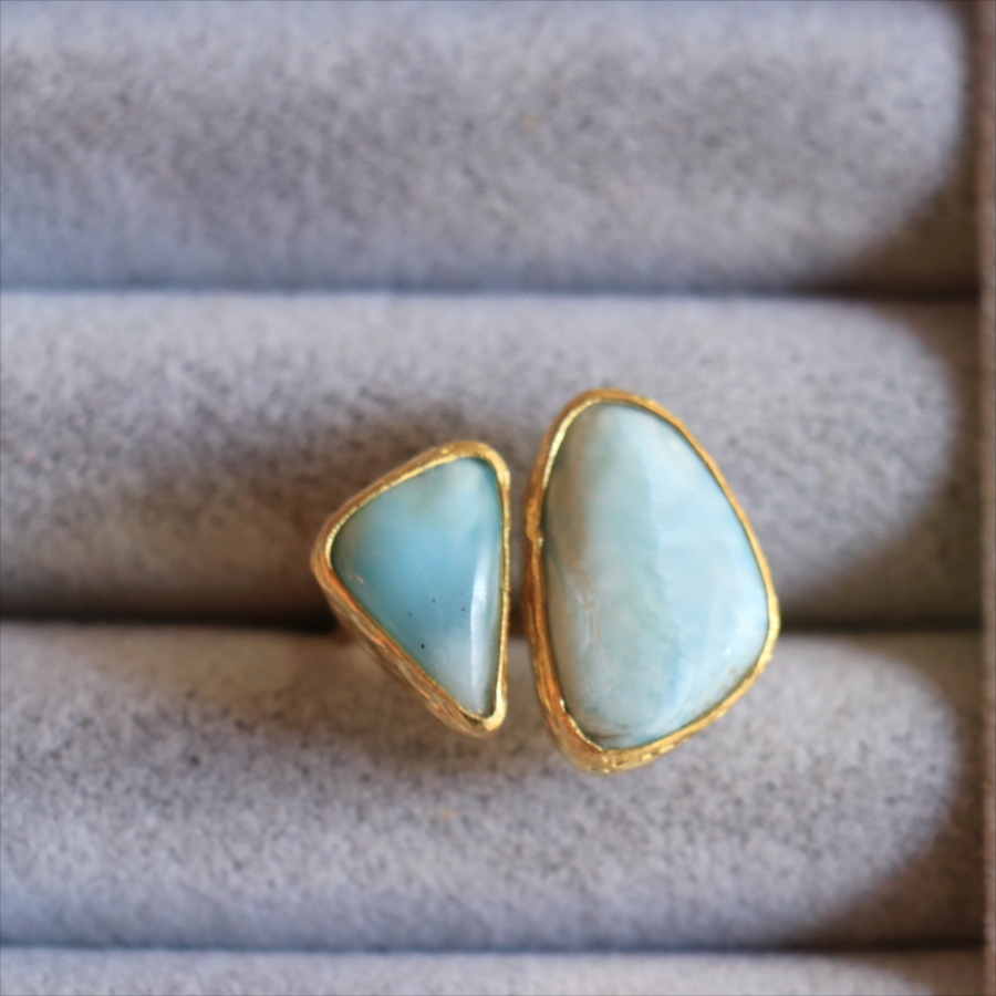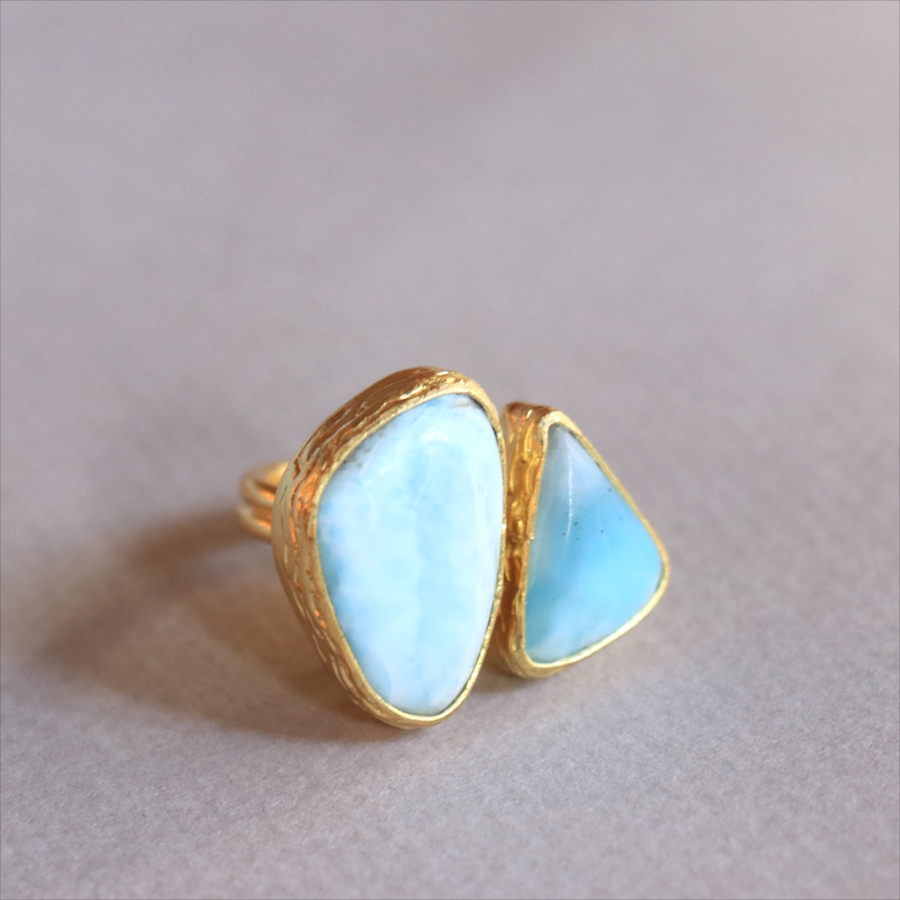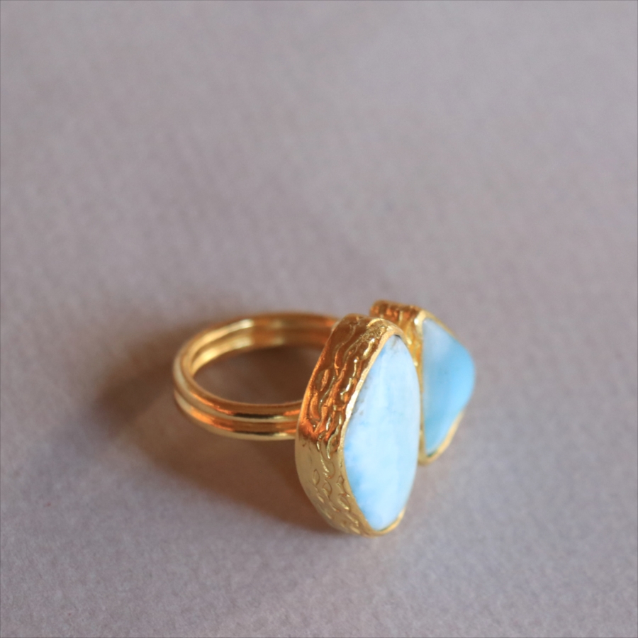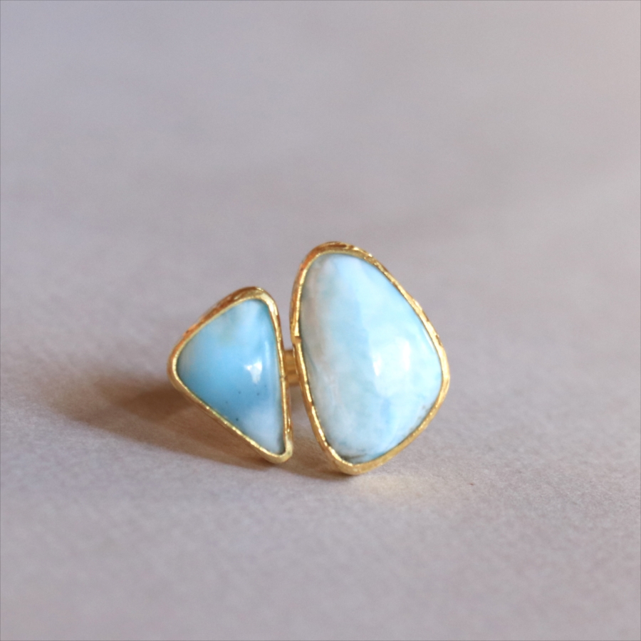 海に映る雲のような模様が広がる、優しいブルーが美しいラリマーダブルリングです。、大粒のラリマーに寄り添うような小さなラリマー。その絶妙なバランスは、シンプルでいて印象的に手元を美しくみせてくれます。
