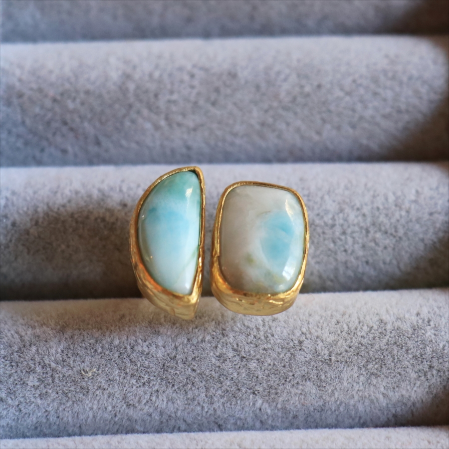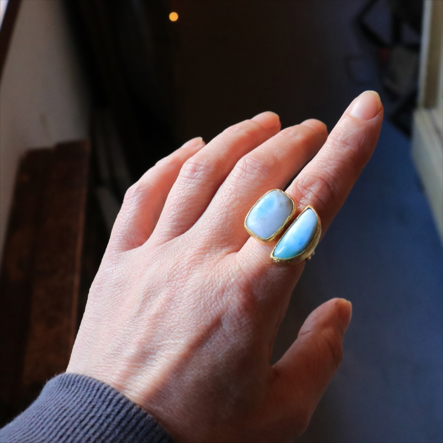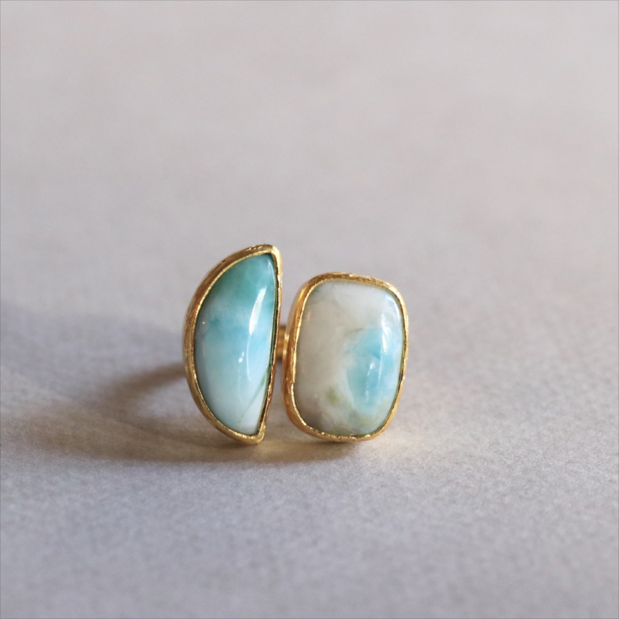 海に映る雲のような模様が広がる、優しいブルーが美しいラリマーダブルリングです。、半月形と丸みのあるスクエア形の2粒のラリマー。その絶妙なバランスは、シンプルでいて印象的に手元を美しくみせてくれます。