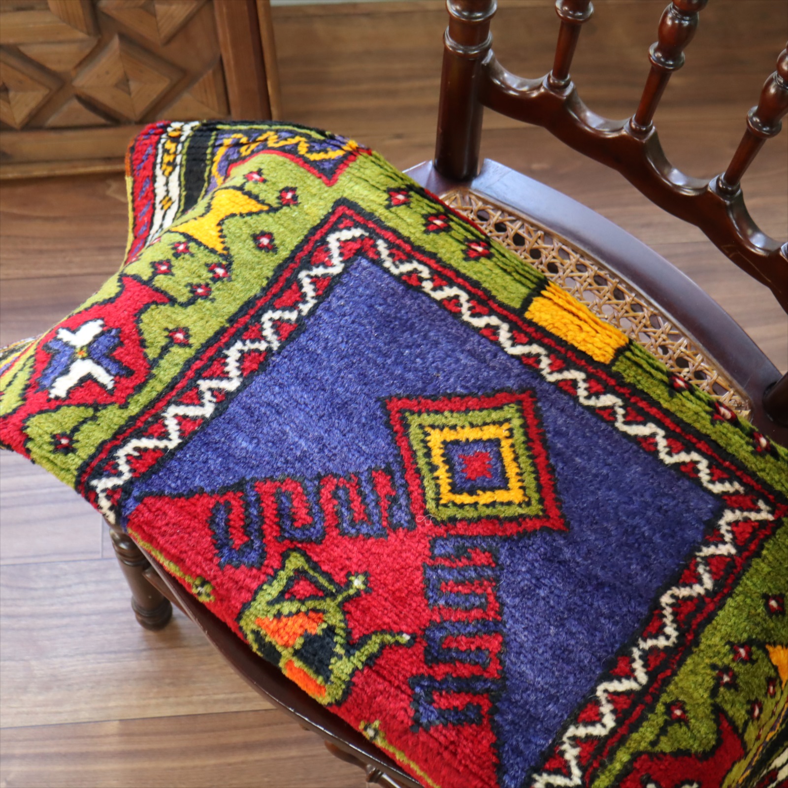 色の変化と日焼けについて-----撮影したときの絨毯の状態は、色鮮やかで織りたてのようですが、お部屋に敷いて長く使っていく間に、少しずつ色褪せてやわらかな色に褪色することが予想されます。特に、紫っぽいブルー、黄緑は色褪せしやすい色です。経年変化を楽しみながら、自分でヴィンテージラグを育てていく感じでお使いください。