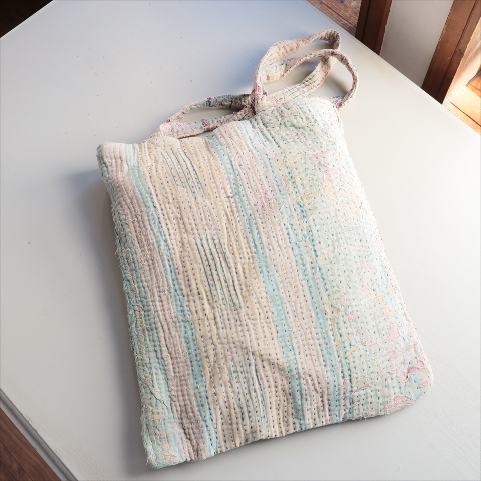 使い古された民族衣装のサリーやドゥパタを重ねて、刺し子刺繍をした伝統的な手仕事の布を使っています。表面のコットンは擦り切れているところもあるほど使い込まれていて、ヴィンテージ感たっぷり。コットンのやわらかな肌触りが心地よく、普段使いのバッグとして活躍してくれそうです。