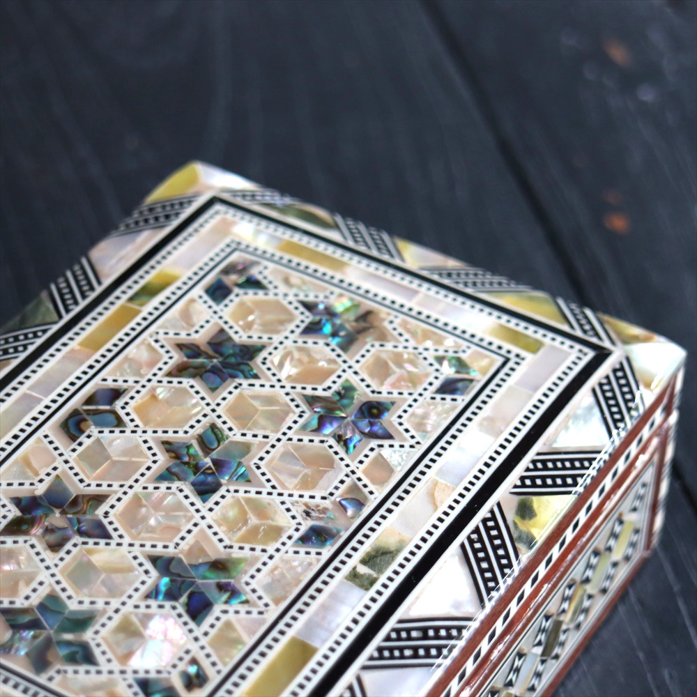 オスマン帝国時代にトルコ南部やシリアから伝えられた伝統工芸品の螺鈿細工。現在はカイロで作られ、中東エリアの広い地域に装飾品として輸出されています。真珠母貝(主にアコヤガイ)の貝殻の内側の真珠質をはめ込んだ煌めく宝石箱です。