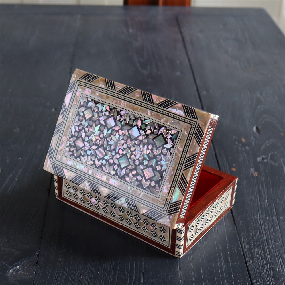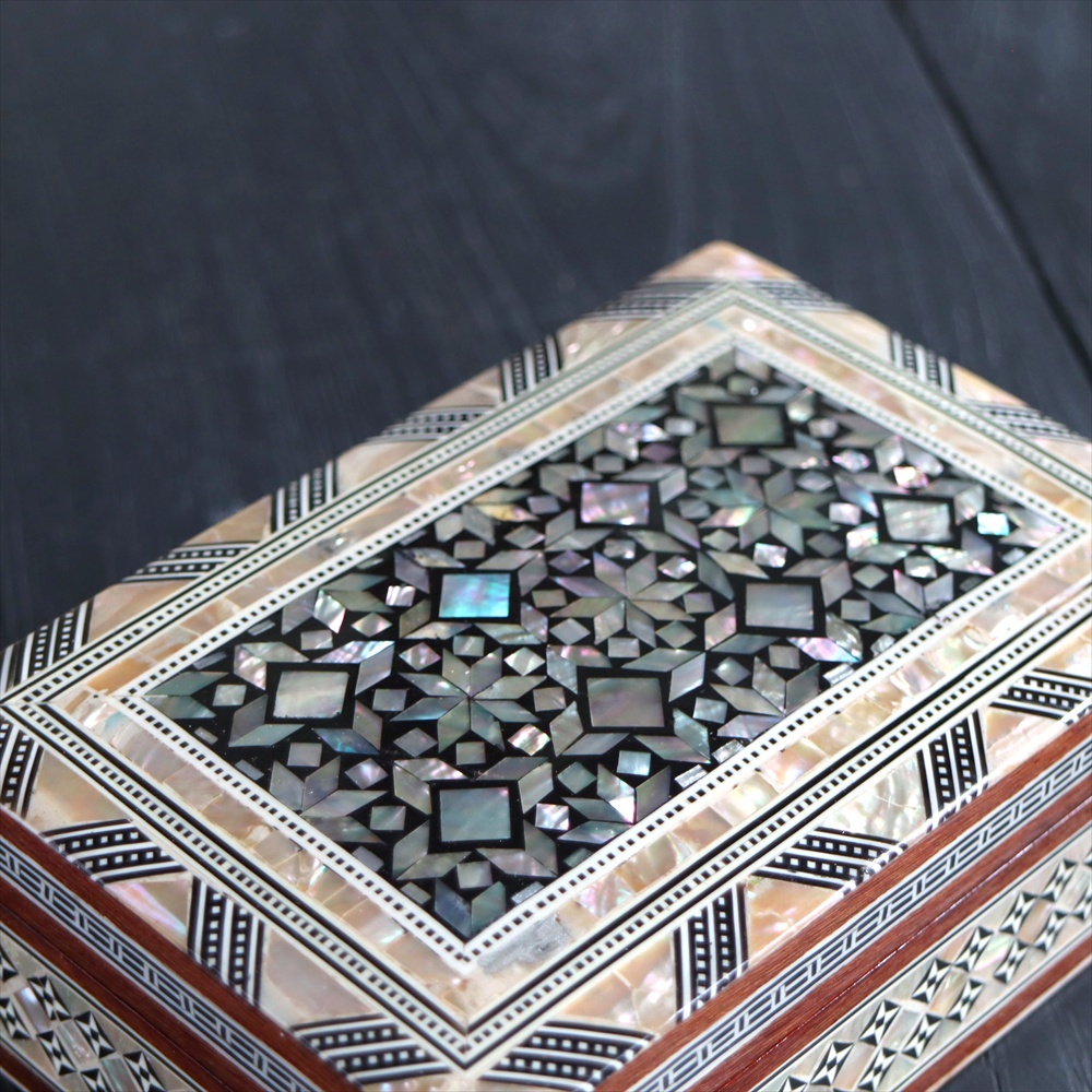 オスマン帝国時代にトルコ南部やシリアから伝えられた伝統工芸品の螺鈿細工。現在はカイロで作られ、中東エリアの広い地域に装飾品として輸出されています。真珠母貝(主にアコヤガイ)の貝殻の内側の真珠質をはめ込んだ煌めく宝石箱です。