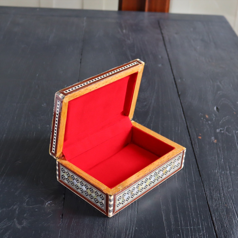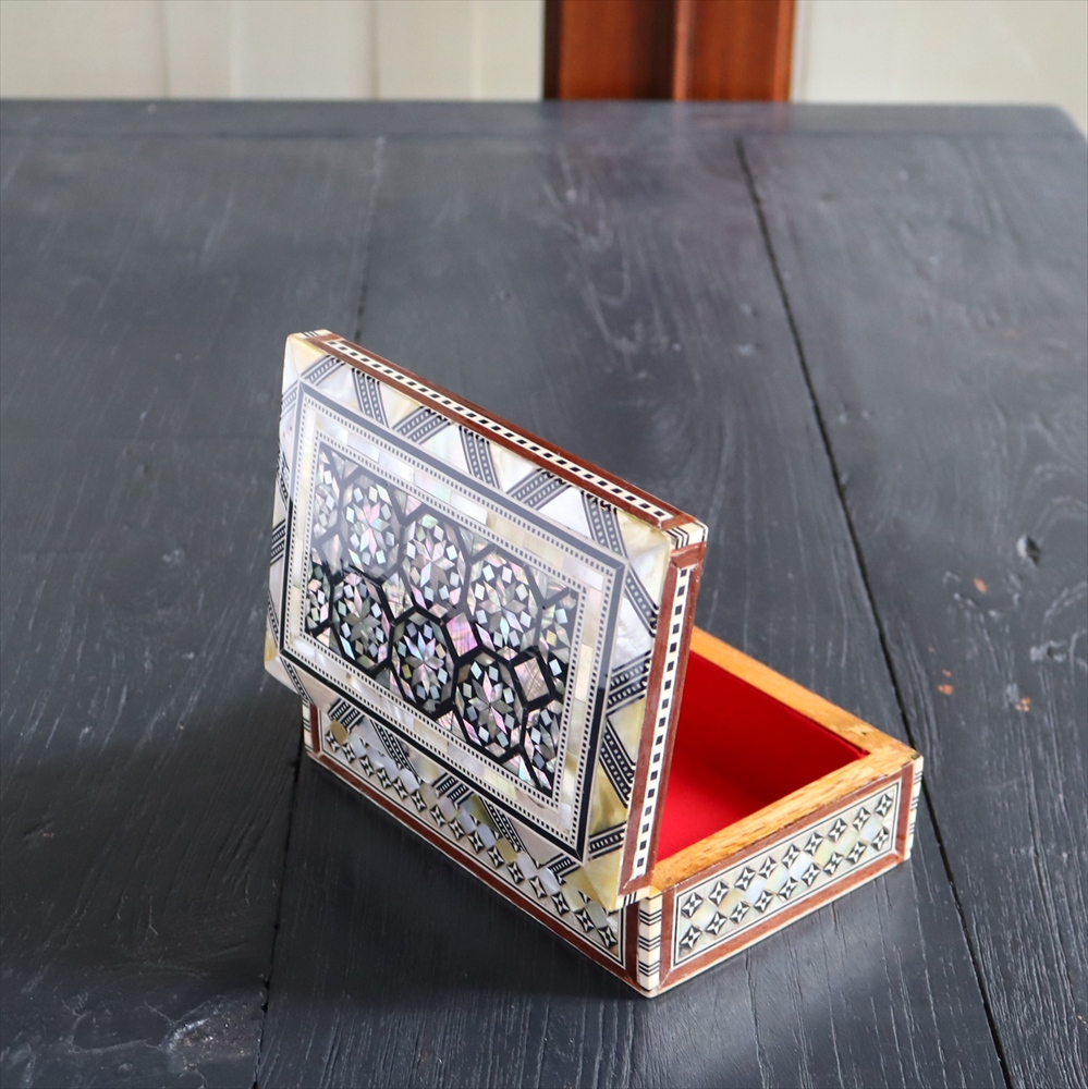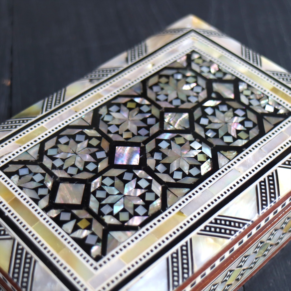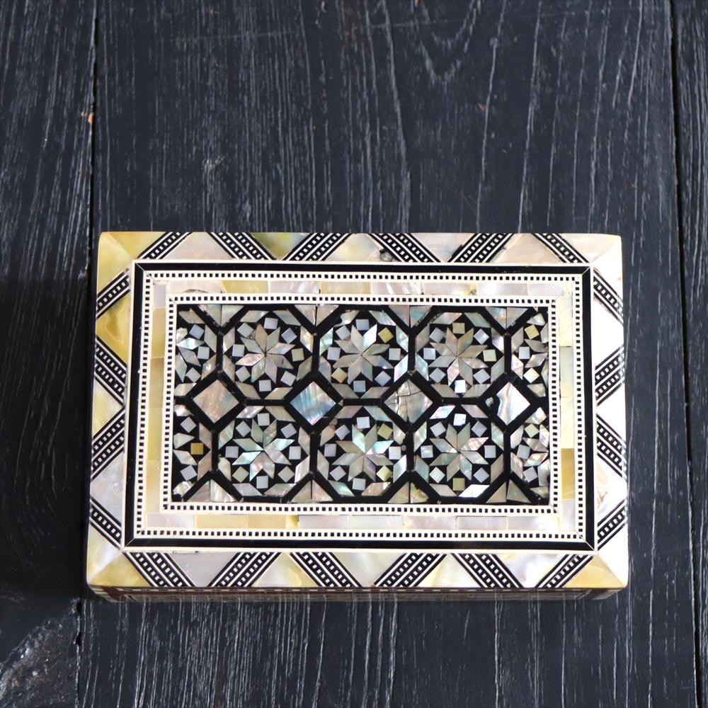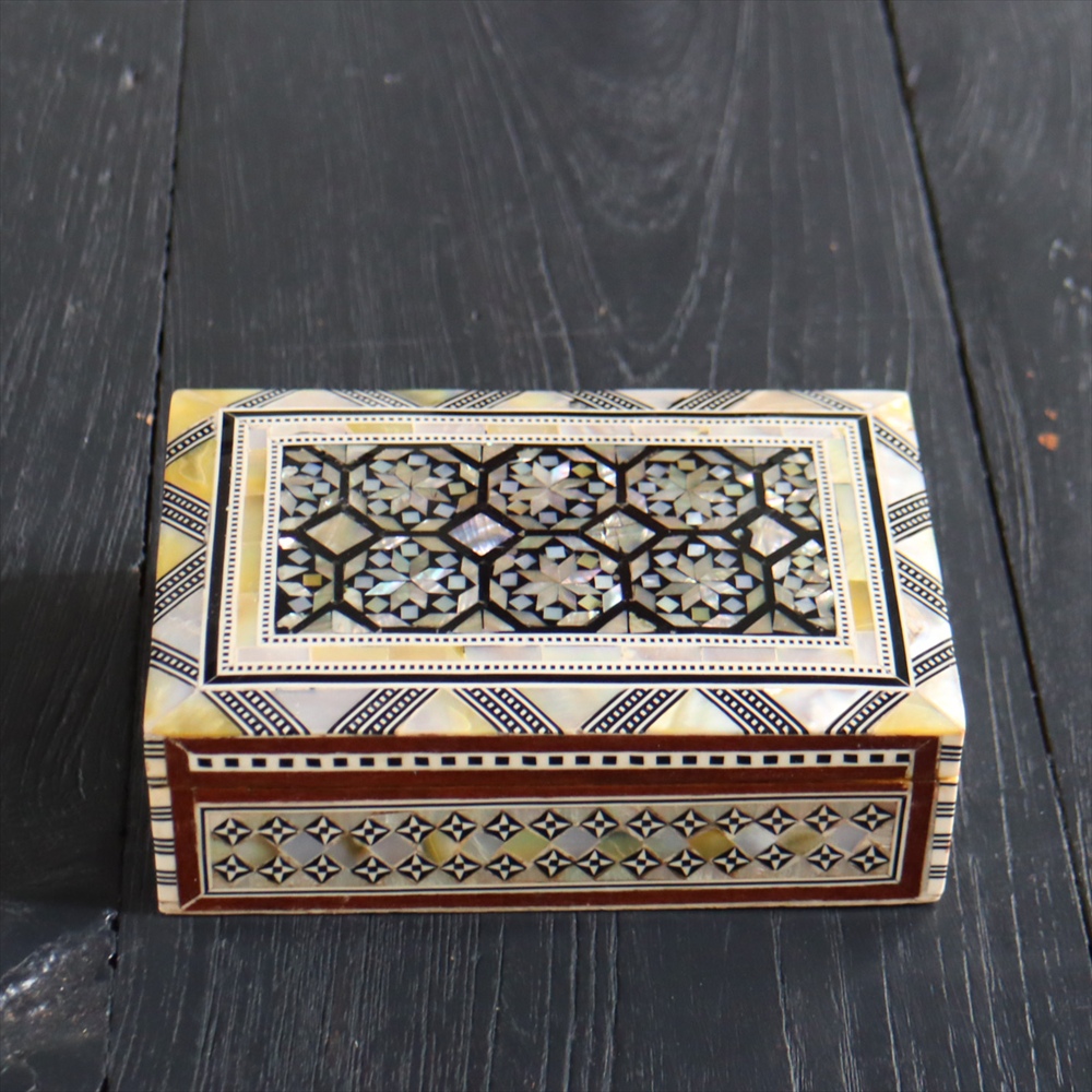 オスマン帝国時代にトルコ南部やシリアから伝えられた伝統工芸品の螺鈿細工。現在はカイロで作られ、中東エリアの広い地域に装飾品として輸出されています。真珠母貝(主にアコヤガイ)の貝殻の内側の真珠質をはめ込んだ煌めく宝石箱です。