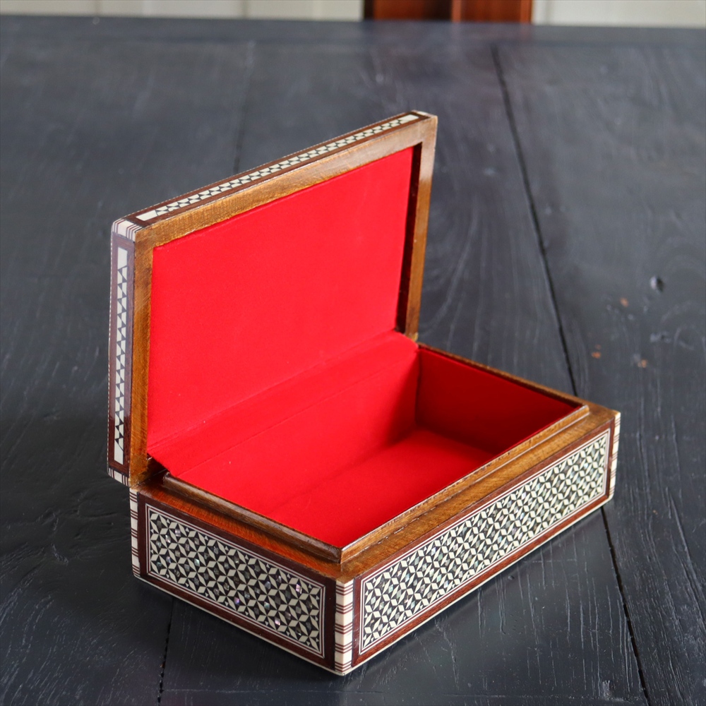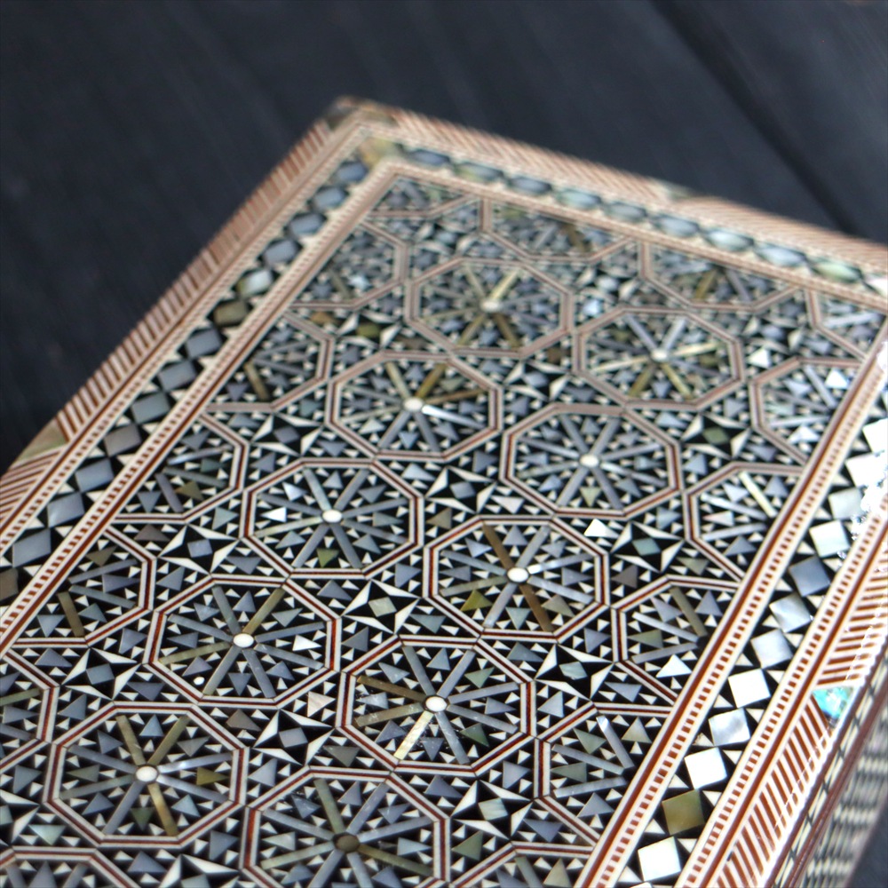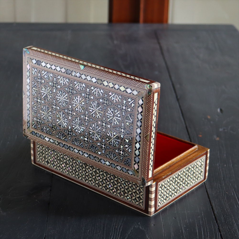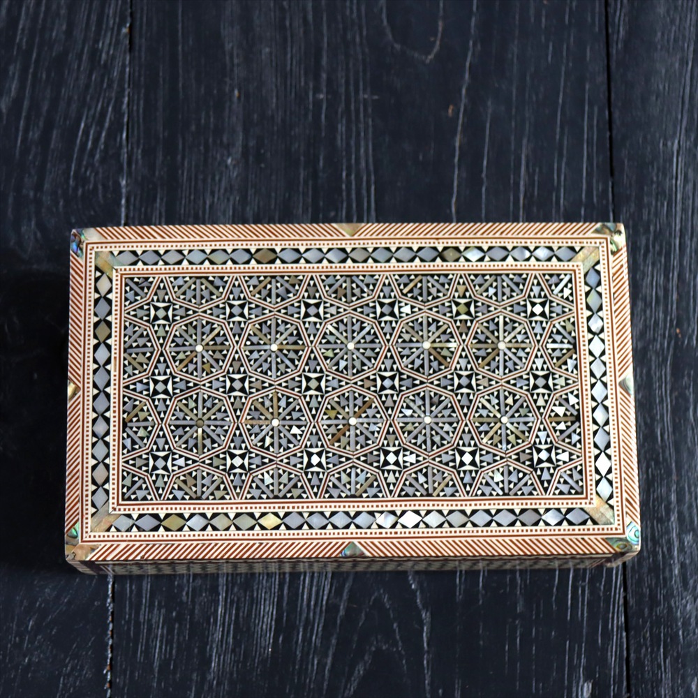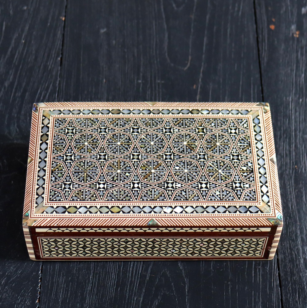 オスマン帝国時代にトルコ南部やシリアから伝えられた伝統工芸品の螺鈿細工。現在はカイロで作られ、中東エリアの広い地域に装飾品として輸出されています。真珠母貝(主にアコヤガイ)の貝殻の内側の真珠質をはめ込んだ煌めく宝石箱です。