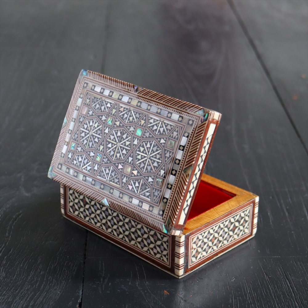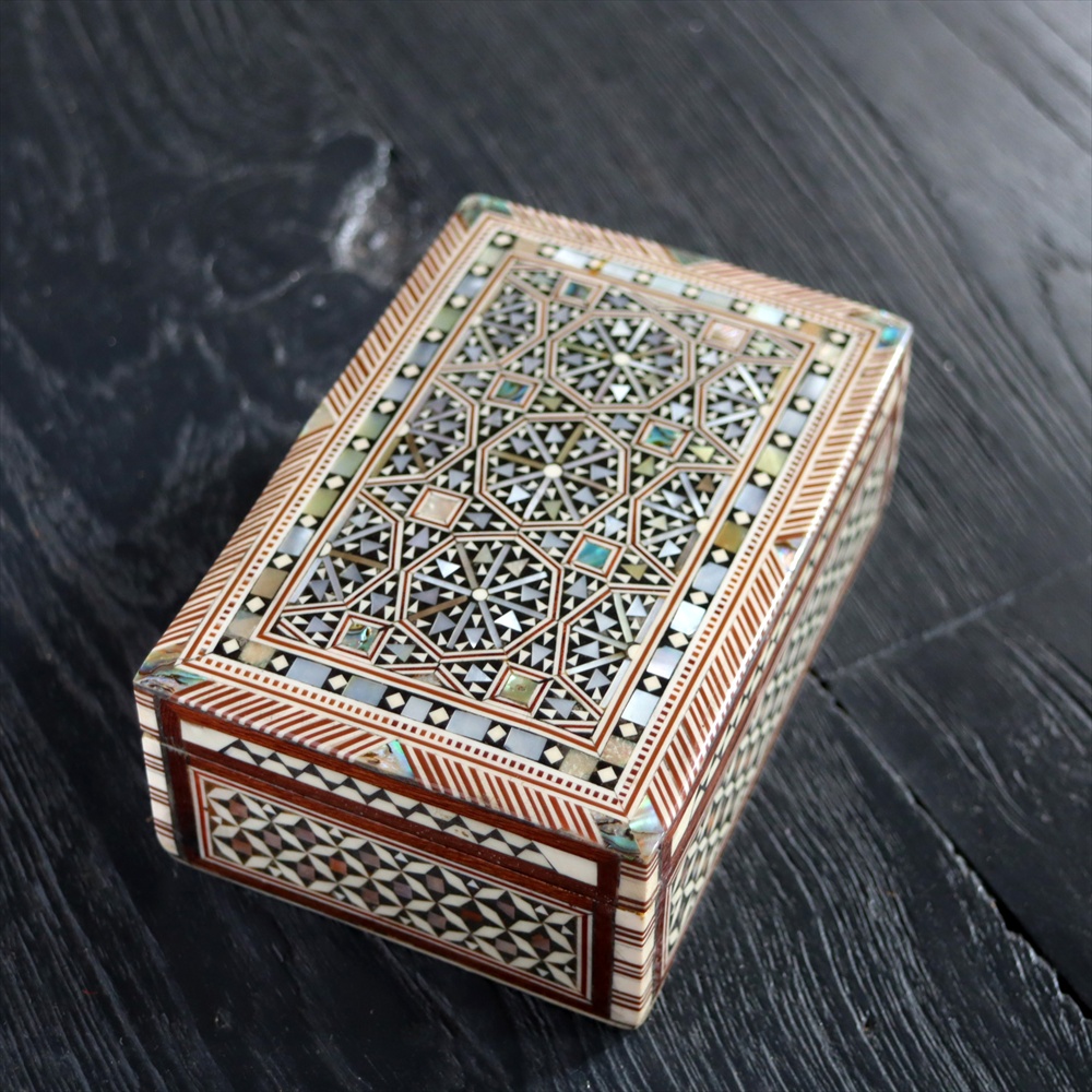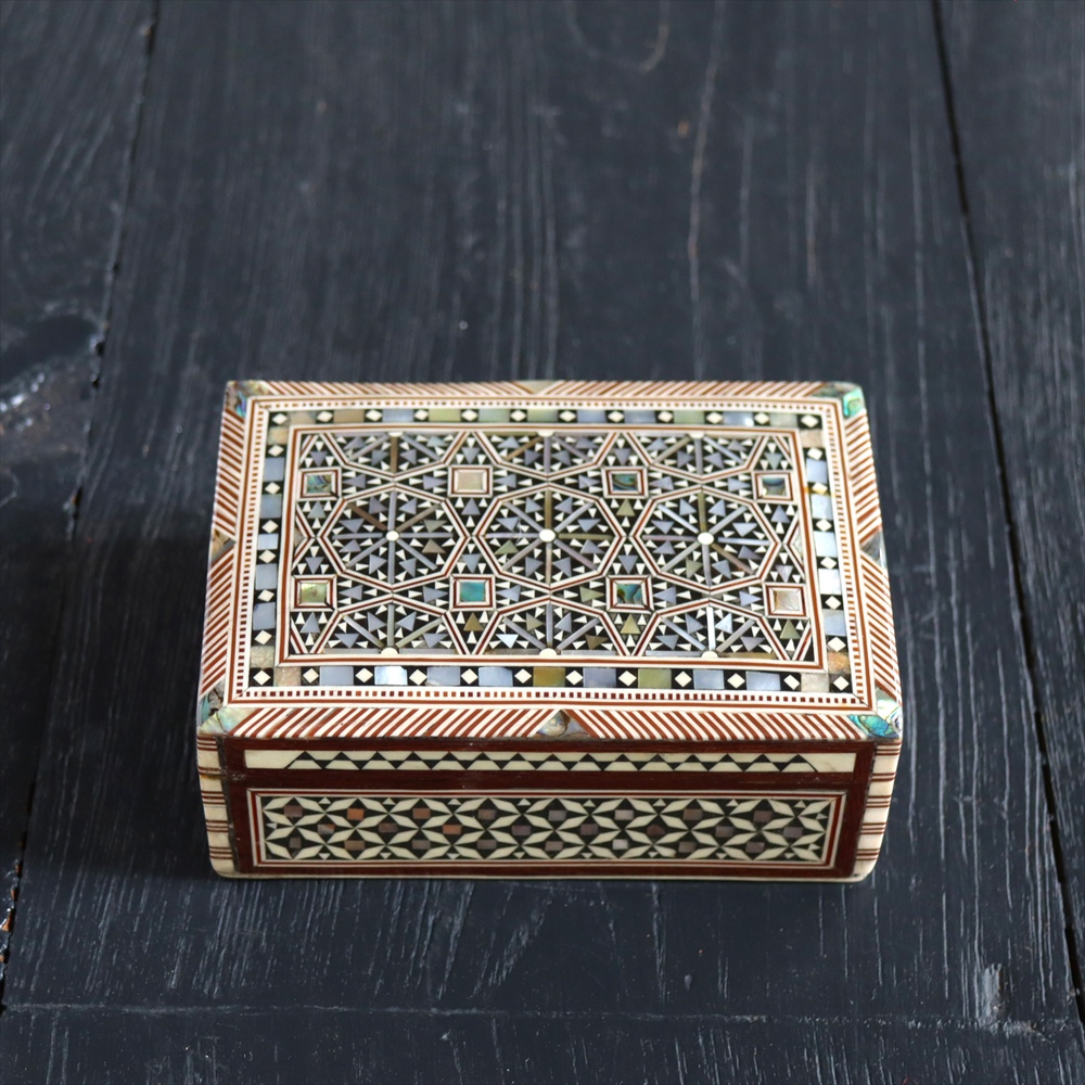 オスマン帝国時代にトルコ南部やシリアから伝えられた伝統工芸品の螺鈿細工。現在はカイロで作られ、中東エリアの広い地域に装飾品として輸出されています。真珠母貝(主にアコヤガイ)の貝殻の内側の真珠質をはめ込んだ煌めく宝石箱です。
