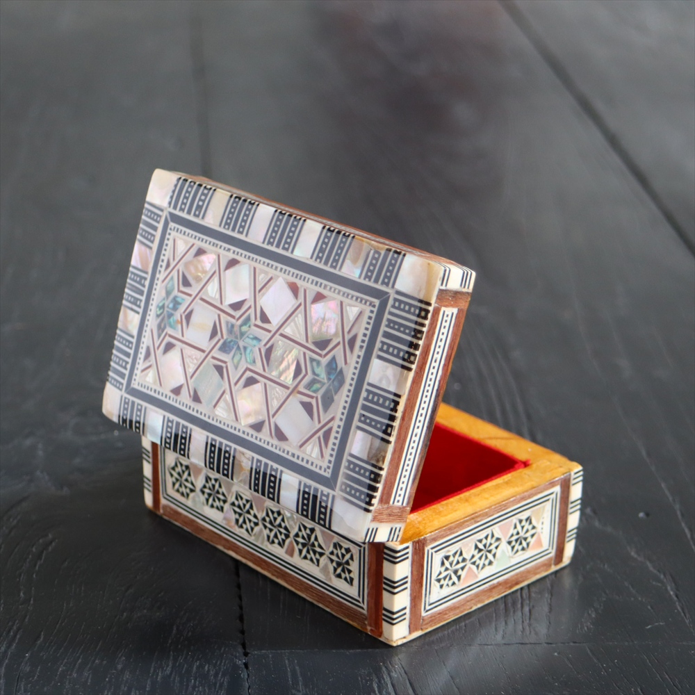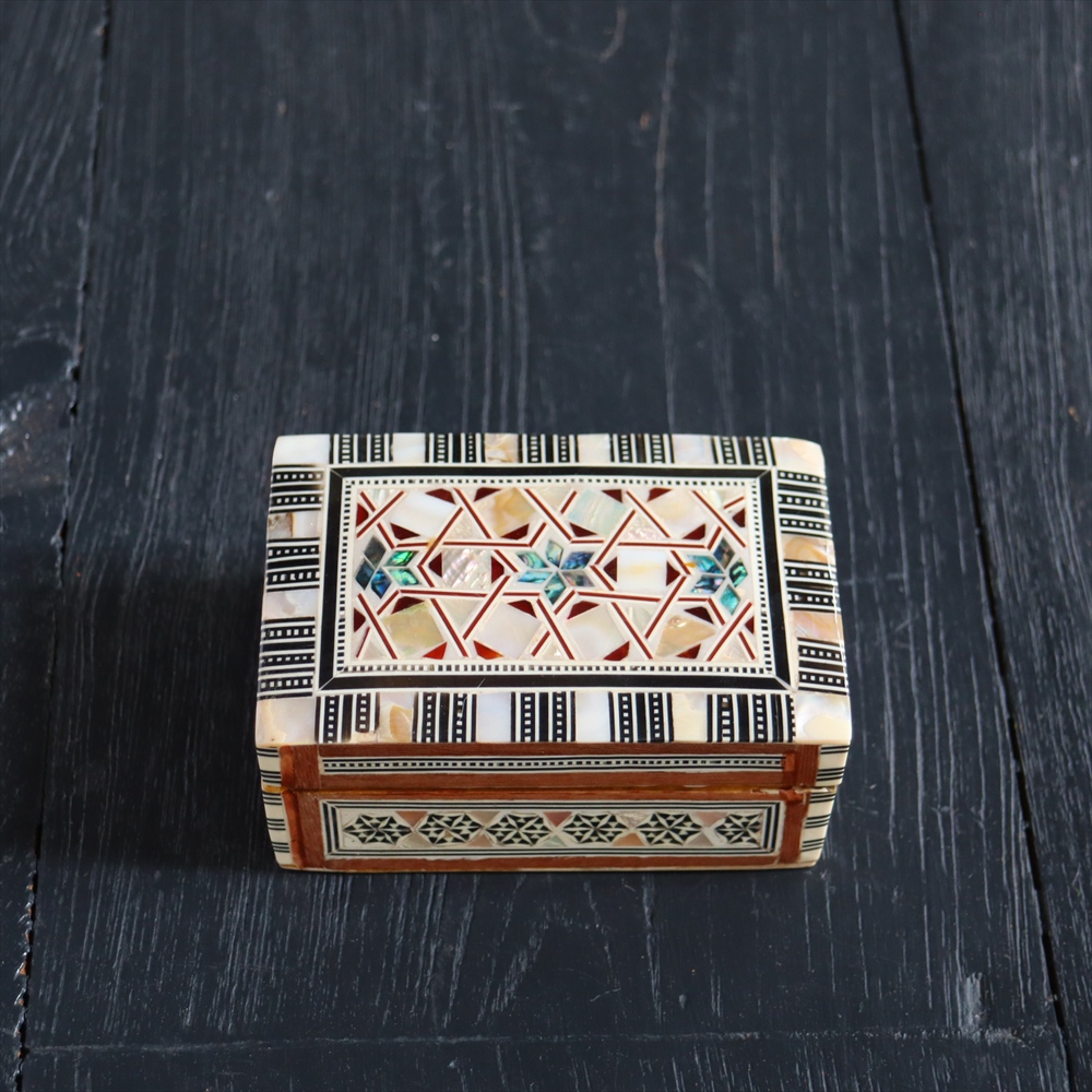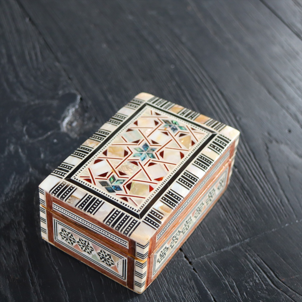 オスマン帝国時代にトルコ南部やシリアから伝えられた伝統工芸品の螺鈿細工。現在はカイロで作られ、中東エリアの広い地域に装飾品として輸出されています。真珠母貝(主にアコヤガイ)の貝殻の内側の真珠質をはめ込んだ煌めく宝石箱です。