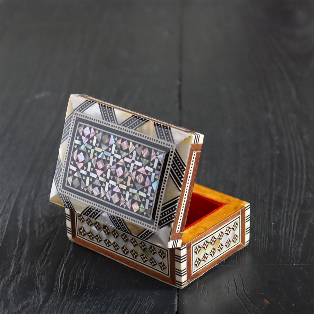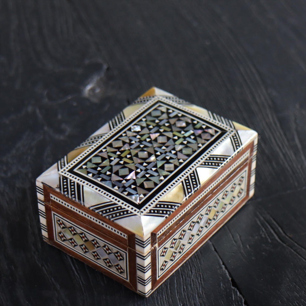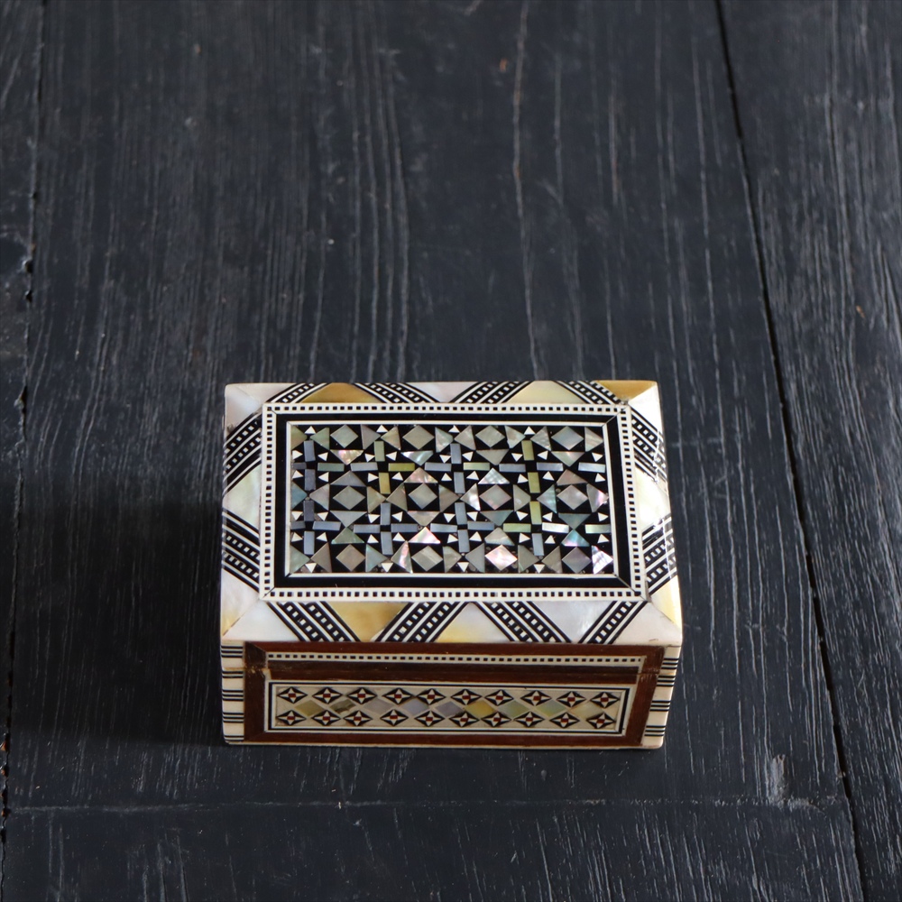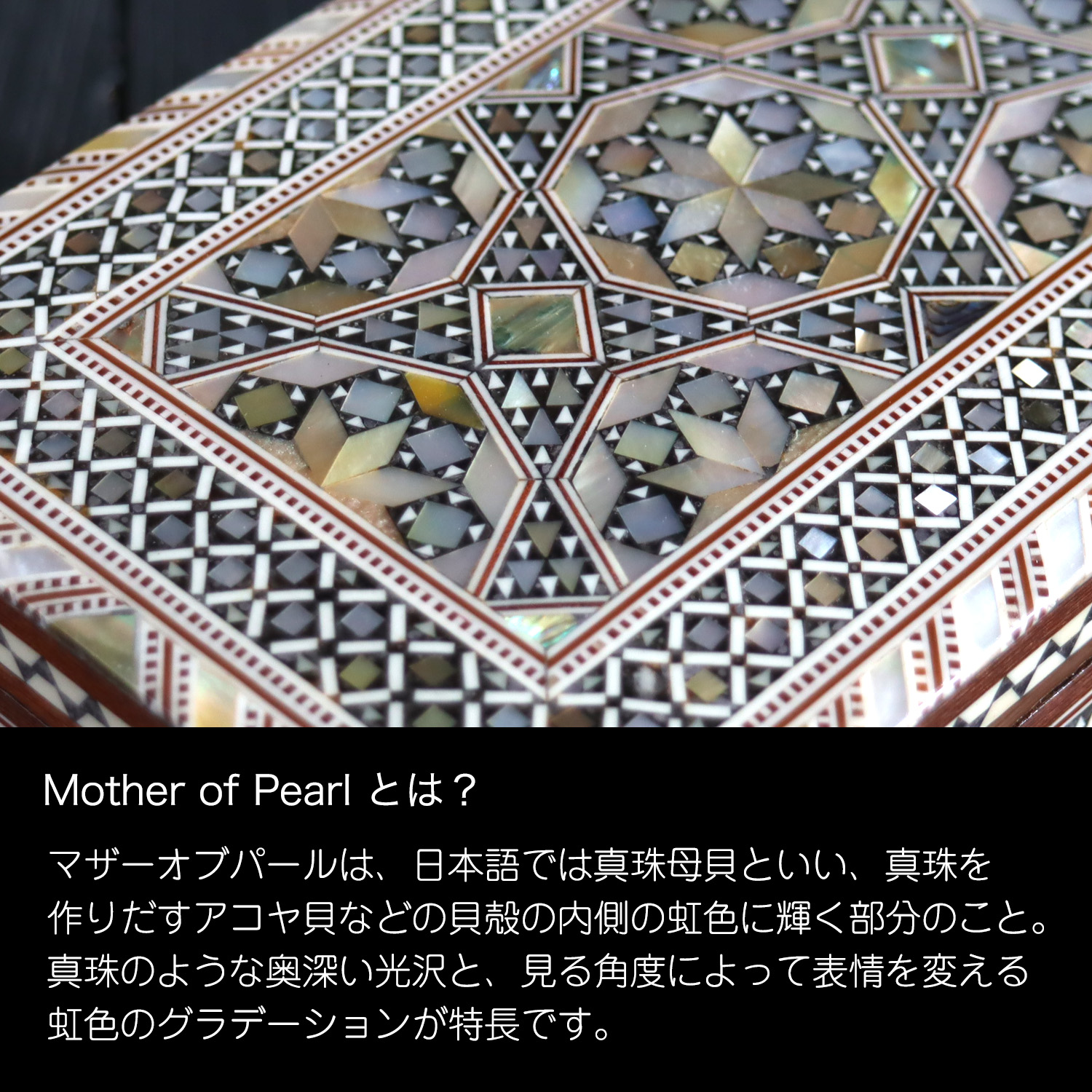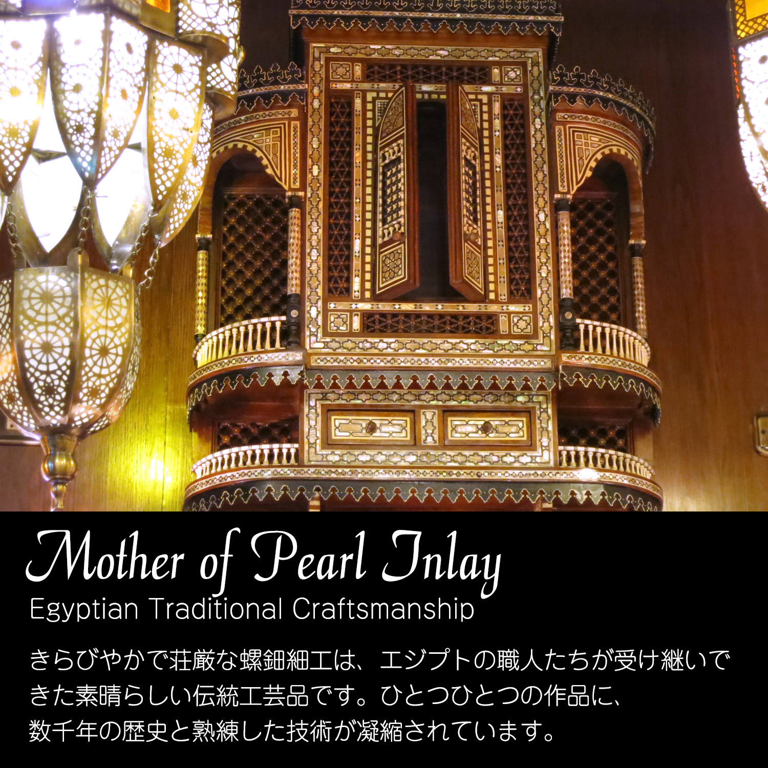 オスマン帝国時代にトルコ南部やシリアから伝えられた伝統工芸品の螺鈿細工。現在はカイロで作られ、中東エリアの広い地域に装飾品として輸出されています。真珠母貝(主にアコヤガイ)の貝殻の内側の真珠質をはめ込んだ煌めく宝石箱です。