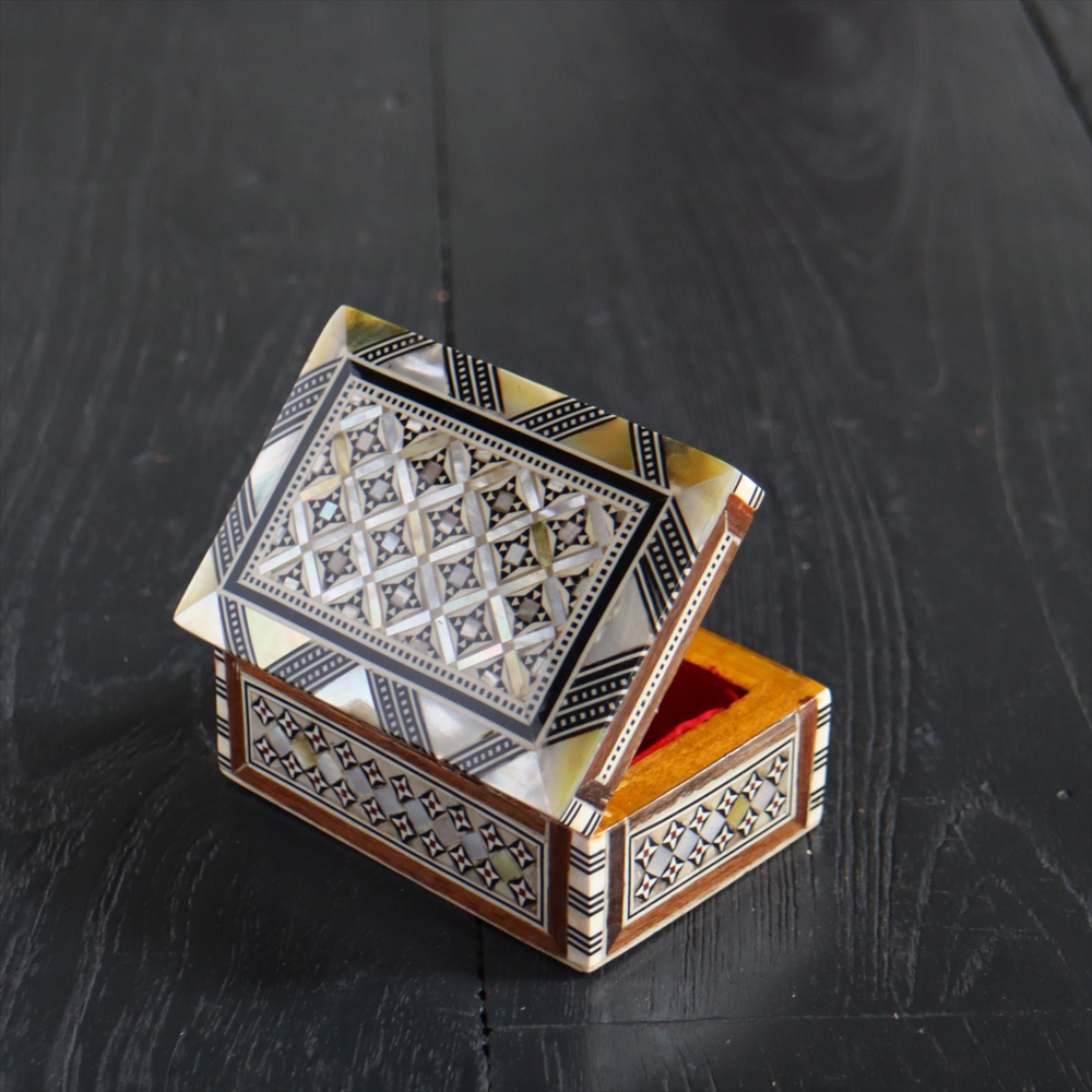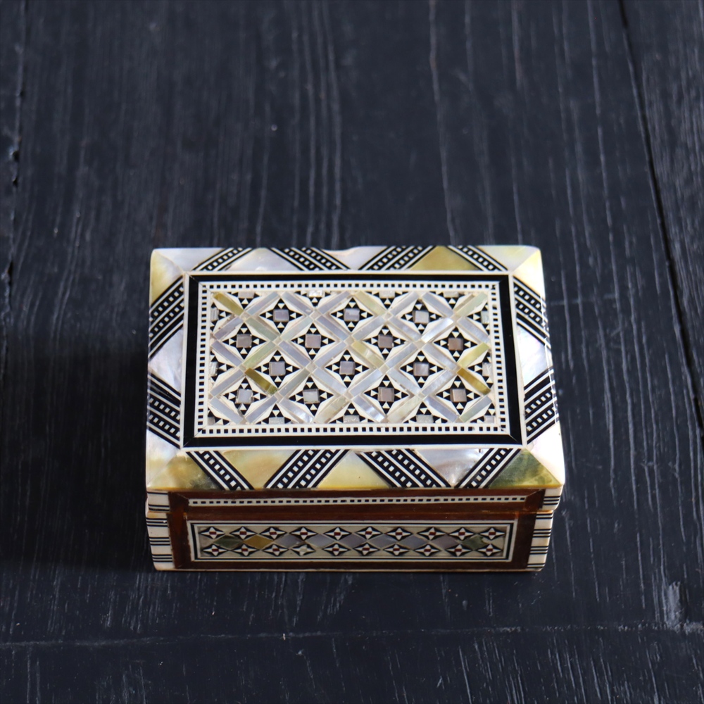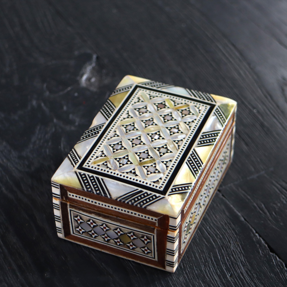 オスマン帝国時代にトルコ南部やシリアから伝えられた伝統工芸品の螺鈿細工。現在はカイロで作られ、中東エリアの広い地域に装飾品として輸出されています。真珠母貝(主にアコヤガイ)の貝殻の内側の真珠質をはめ込んだ煌めく宝石箱です。