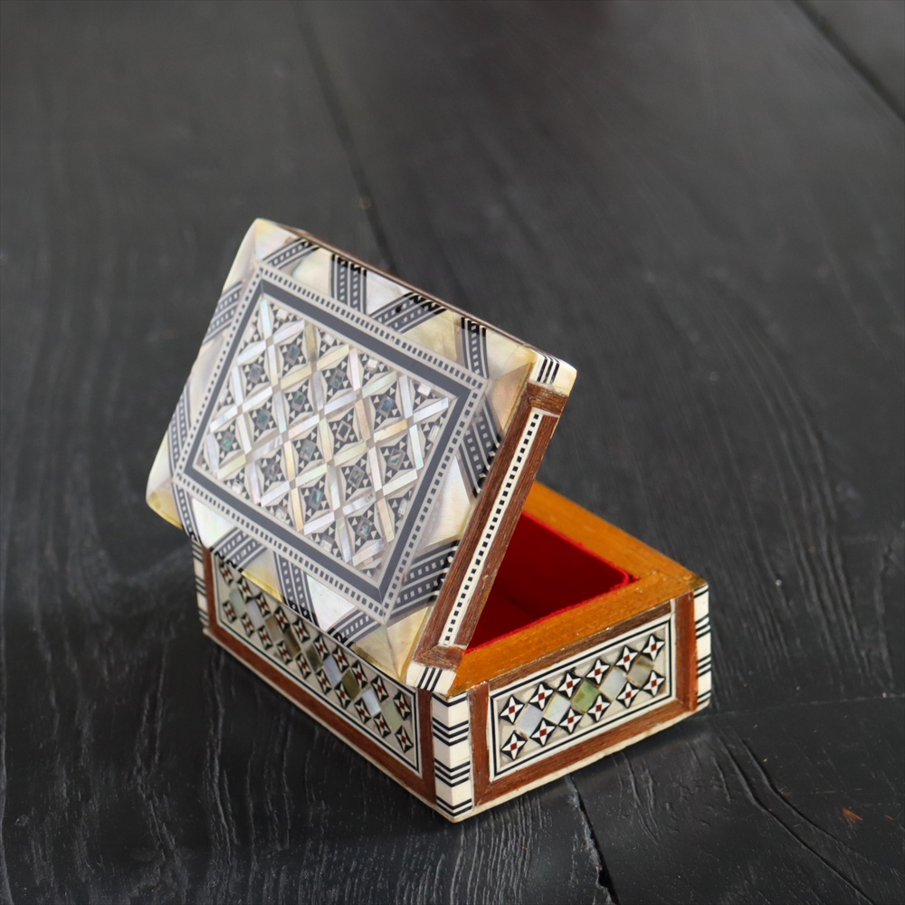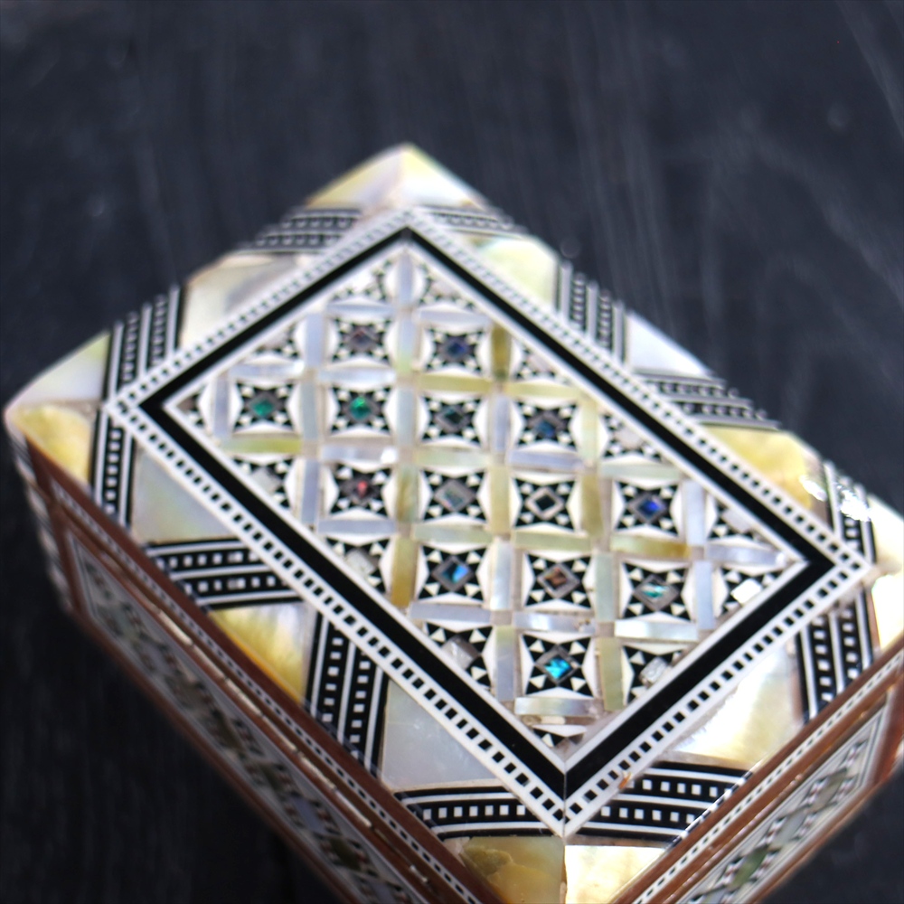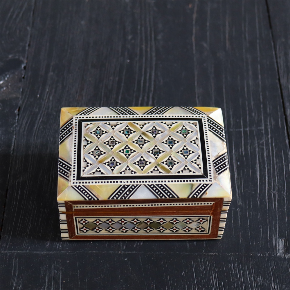 オスマン帝国時代にトルコ南部やシリアから伝えられた伝統工芸品の螺鈿細工。現在はカイロで作られ、中東エリアの広い地域に装飾品として輸出されています。真珠母貝(主にアコヤガイ)の貝殻の内側の真珠質をはめ込んだ煌めく宝石箱です。