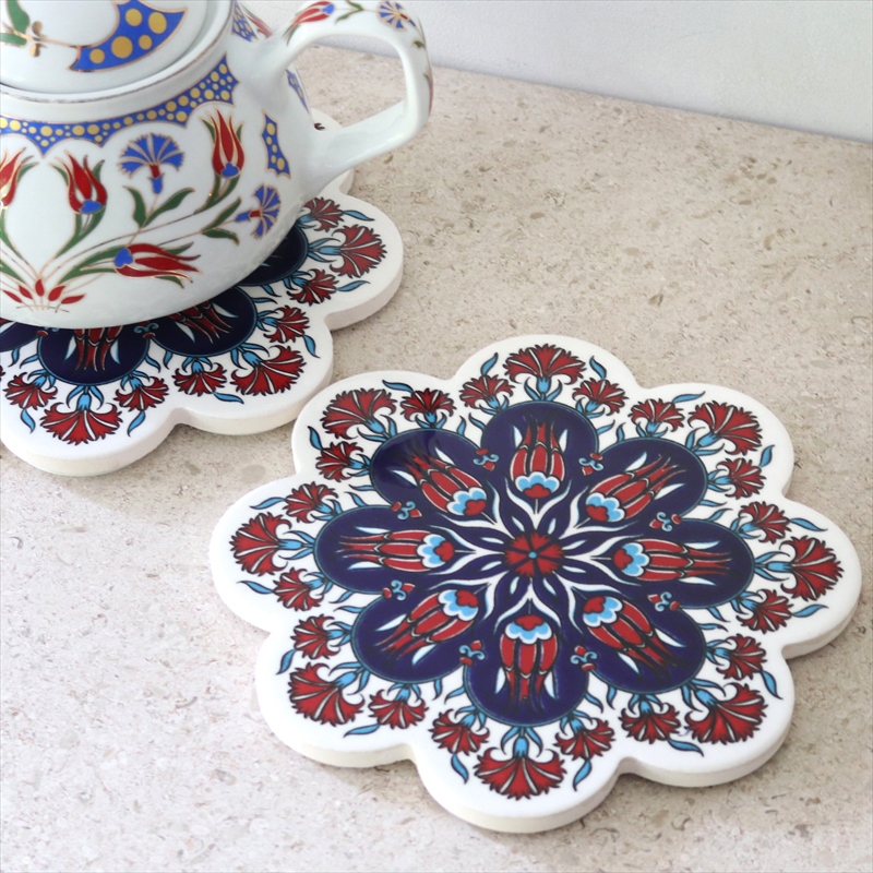トルコの伝統的なイズニック(IZNIK)セラミックアートを再現した鍋敷きです。チューリップなどの花模様を中心に、色鮮やかな陶器に仕上がっています。コースターやインテリアとしても楽しめるアイテムです。トルコを代表する花、チューリップとカーネーションをモチーフにした伝統的な美しさのあるデザイン。