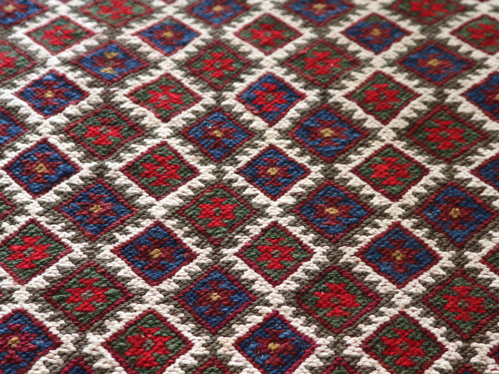 箱型の収納ケースのサイド部分に使われていた小さなキリム。カットされたものではなく、オリジナルのサイズです。