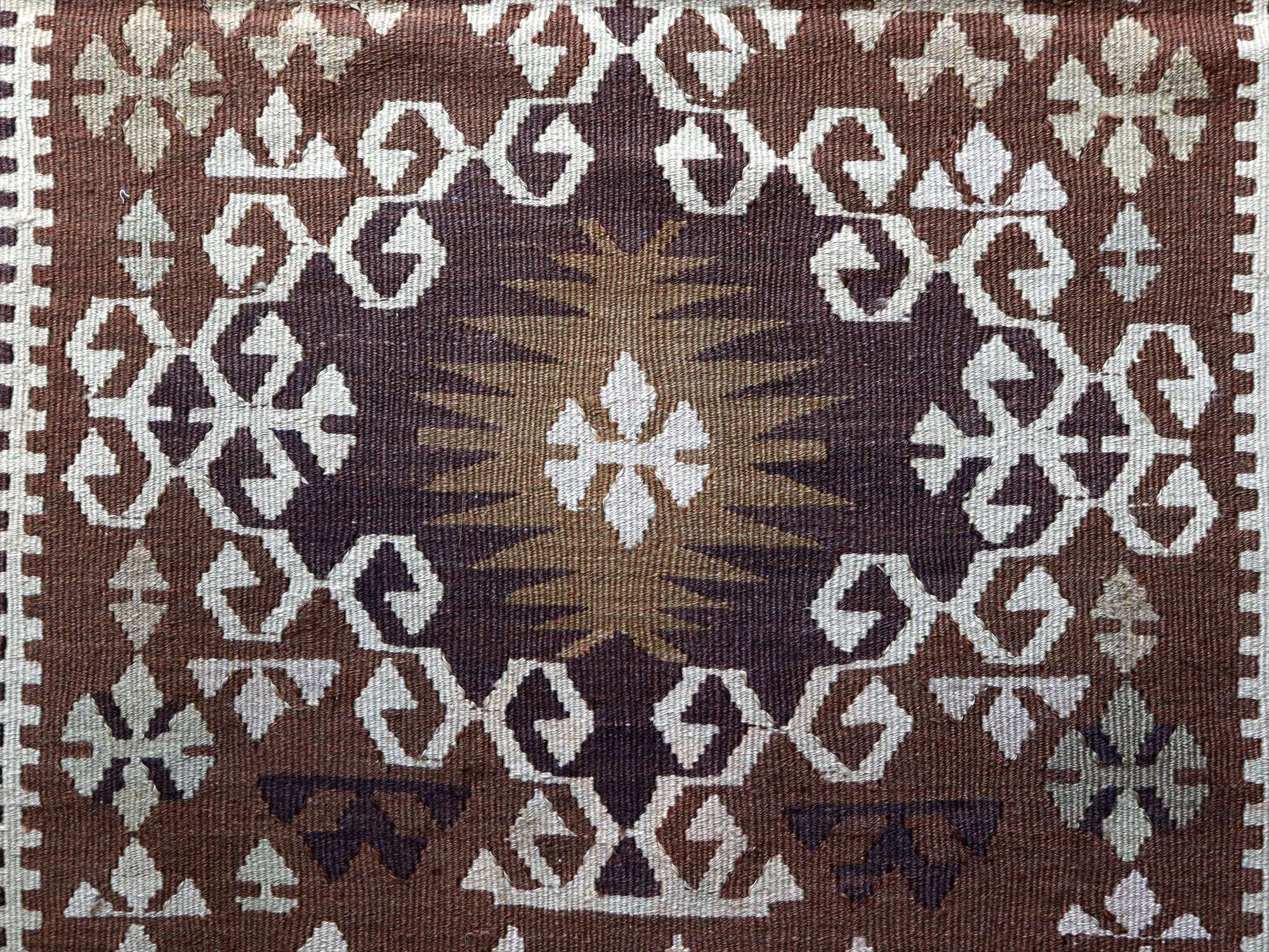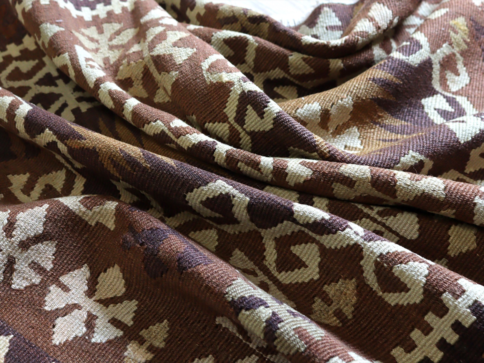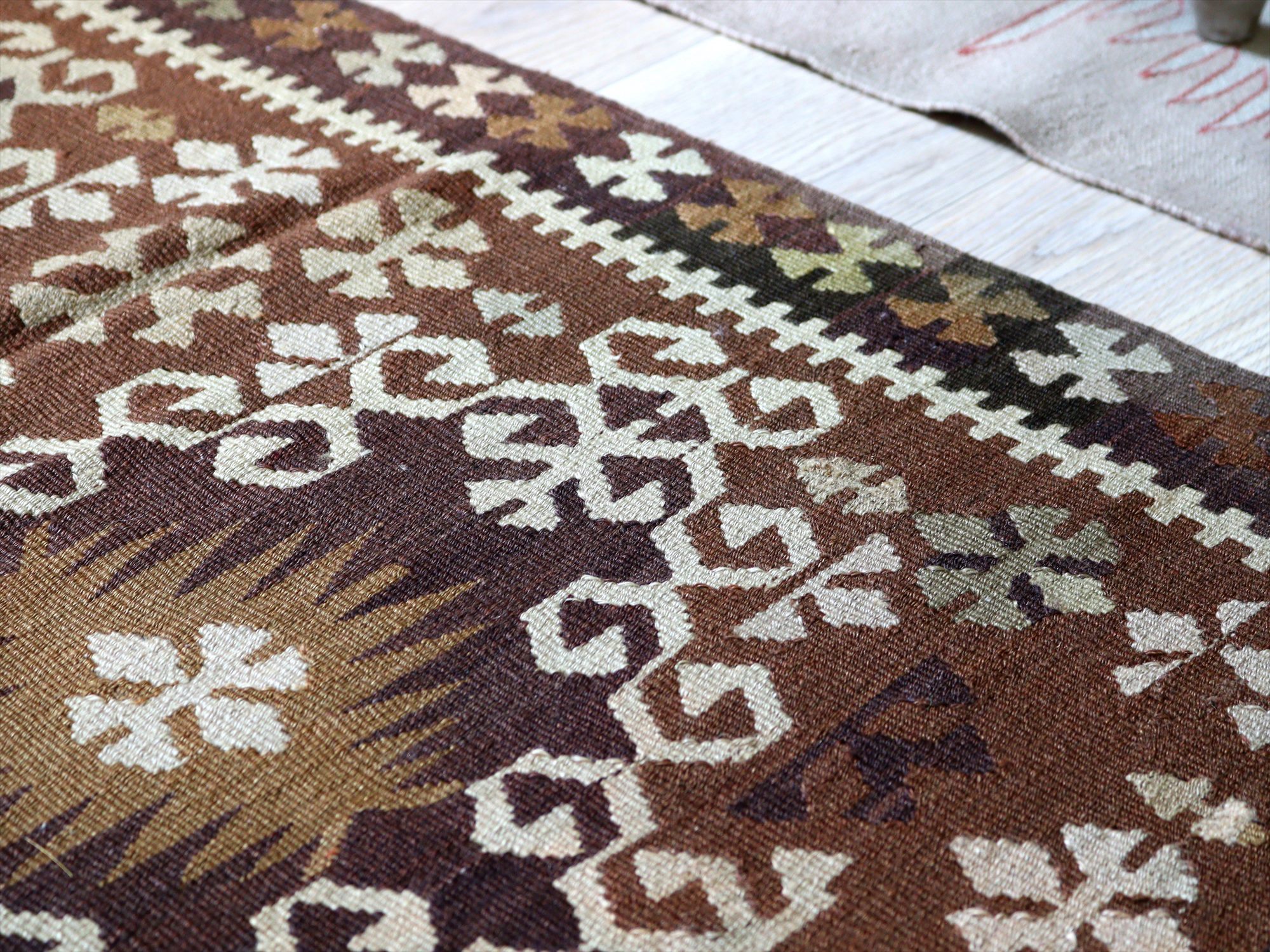 カイセリ地方の小さな村、ヤイヤルで織られたキリム。異なるトーンのブラウンで構成された落ち着いた色合いです。