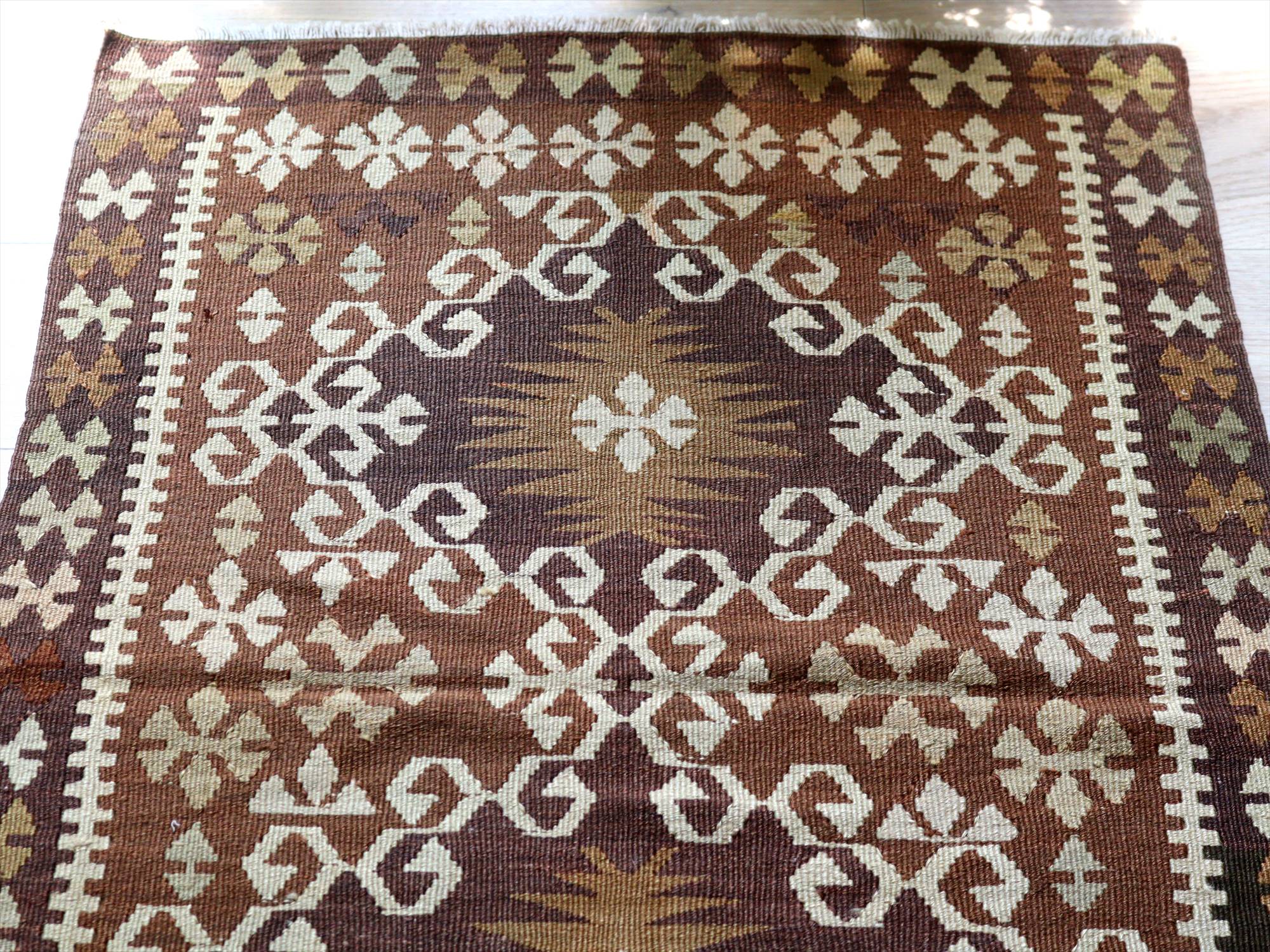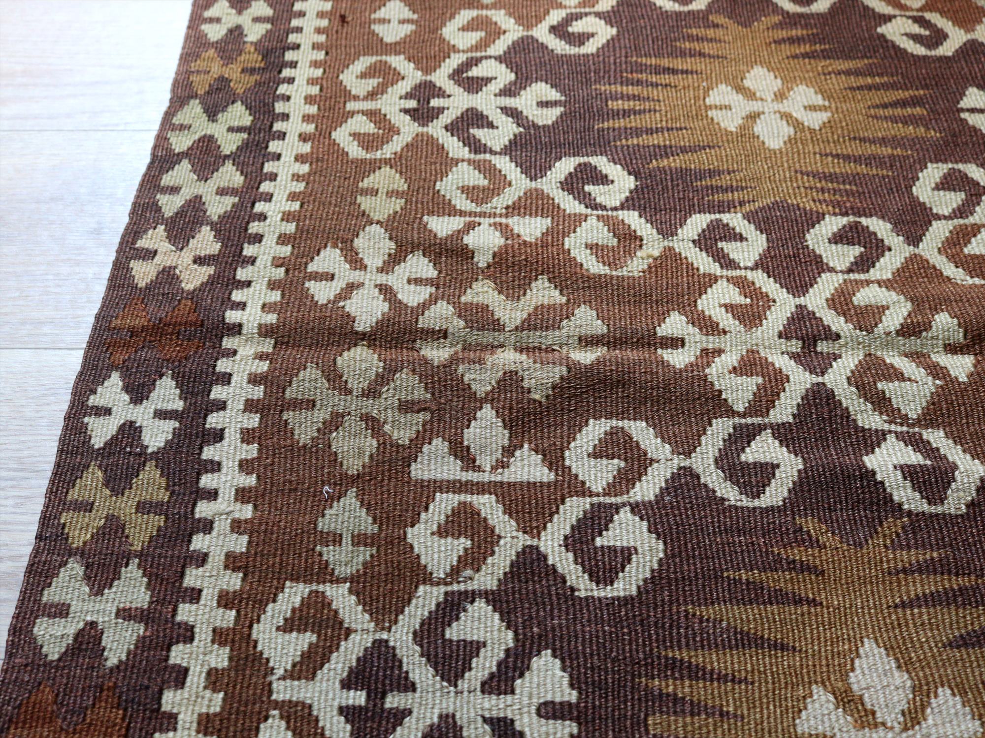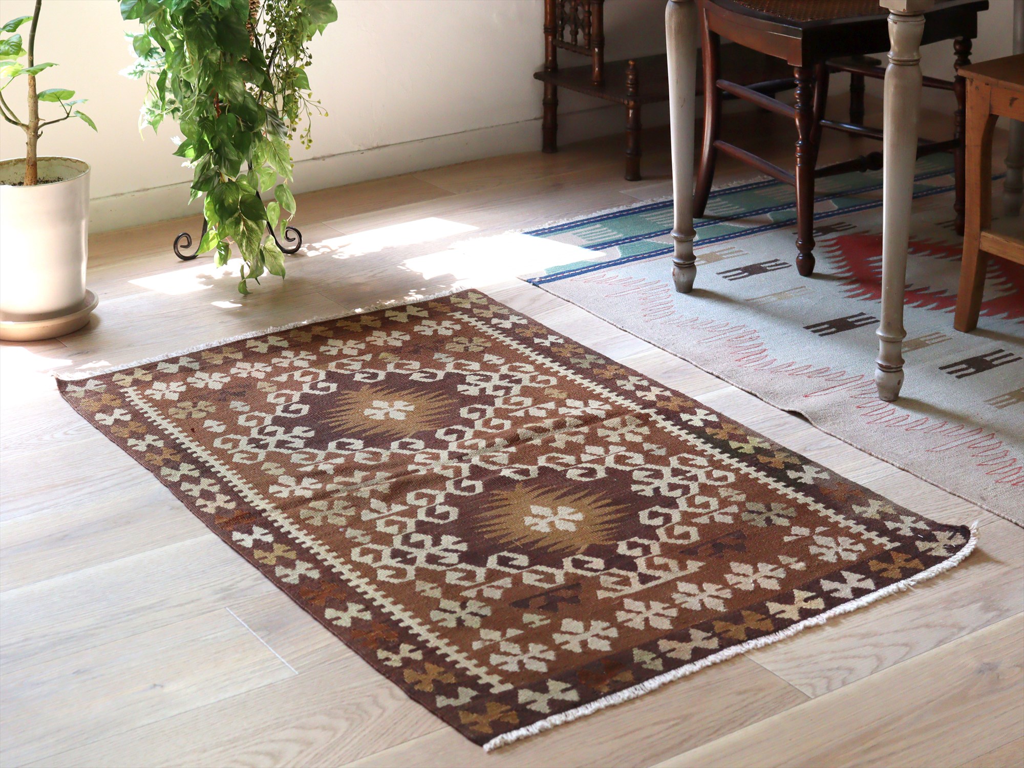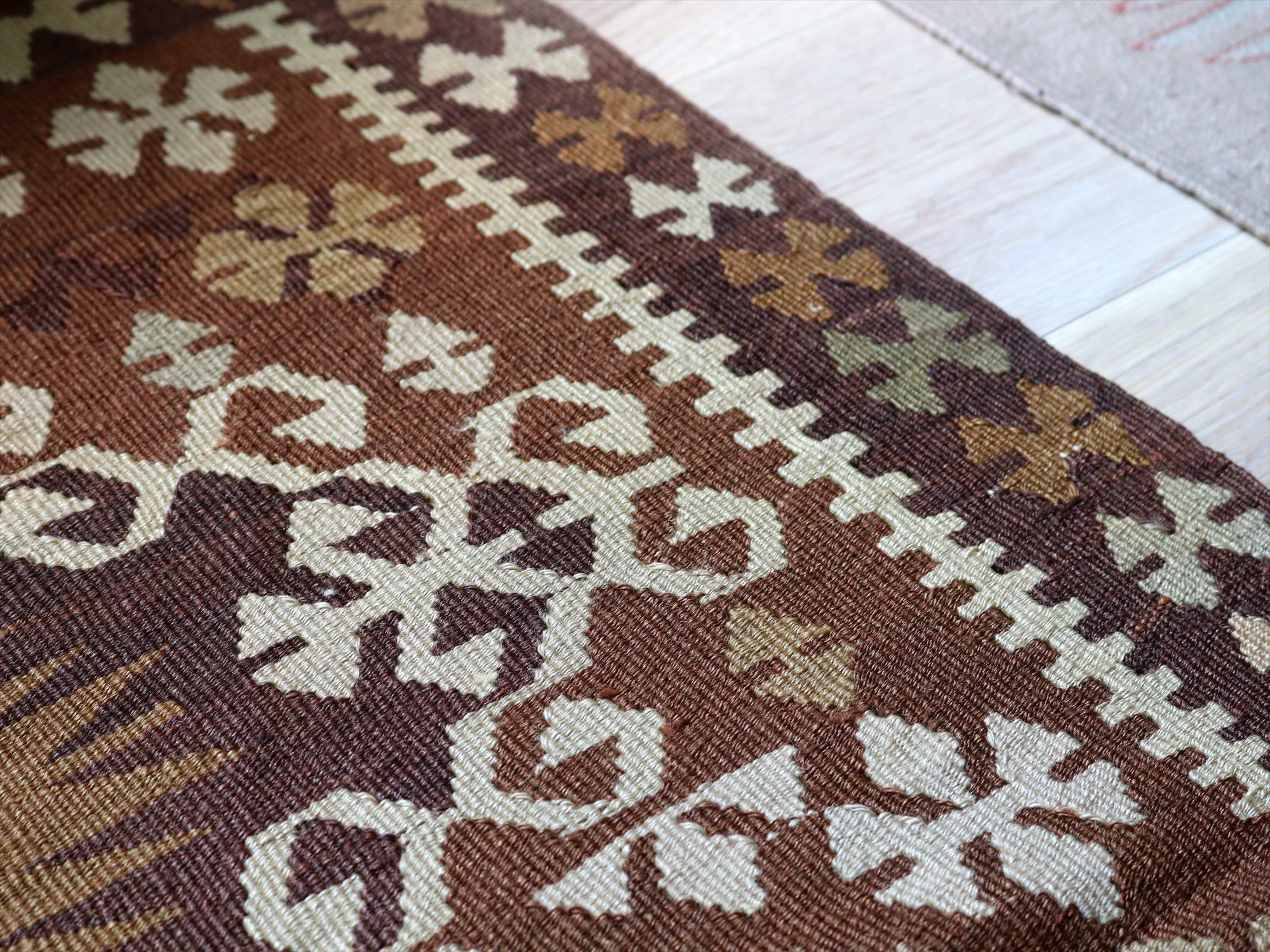 カイセリ地方の小さな村、ヤイヤルで織られたキリム。異なるトーンのブラウンで構成された落ち着いた色合いです。