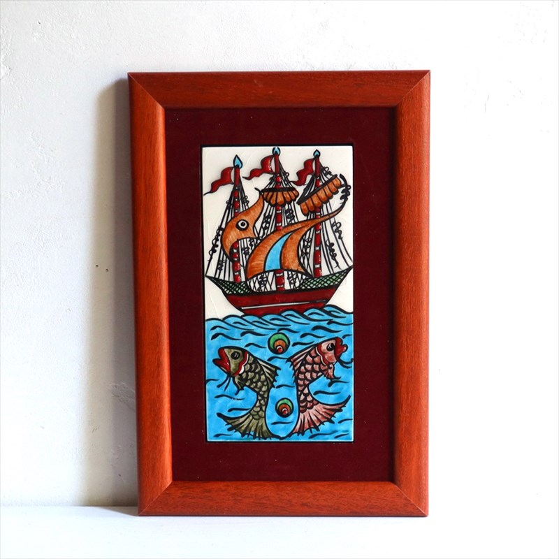 【15%OFF】手書きタイル トルコ陶器 ミニタイル1枚額 H29.5×W19.5×D1.5cm チャナッカレ・トロイの船と魚 Turkish Hand Paint Tile