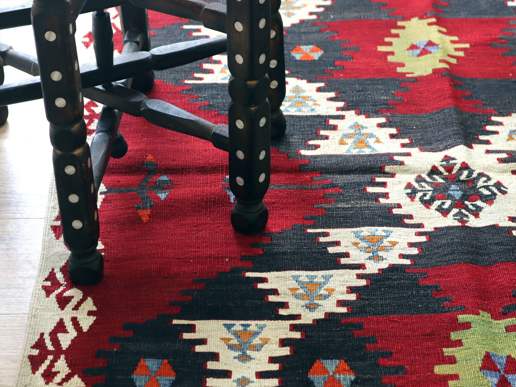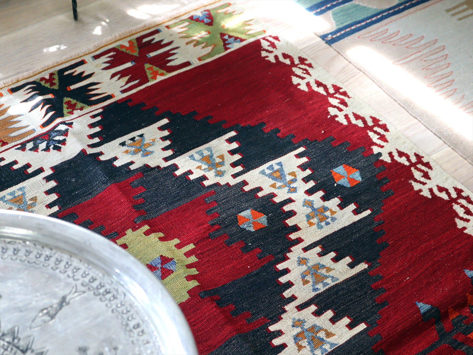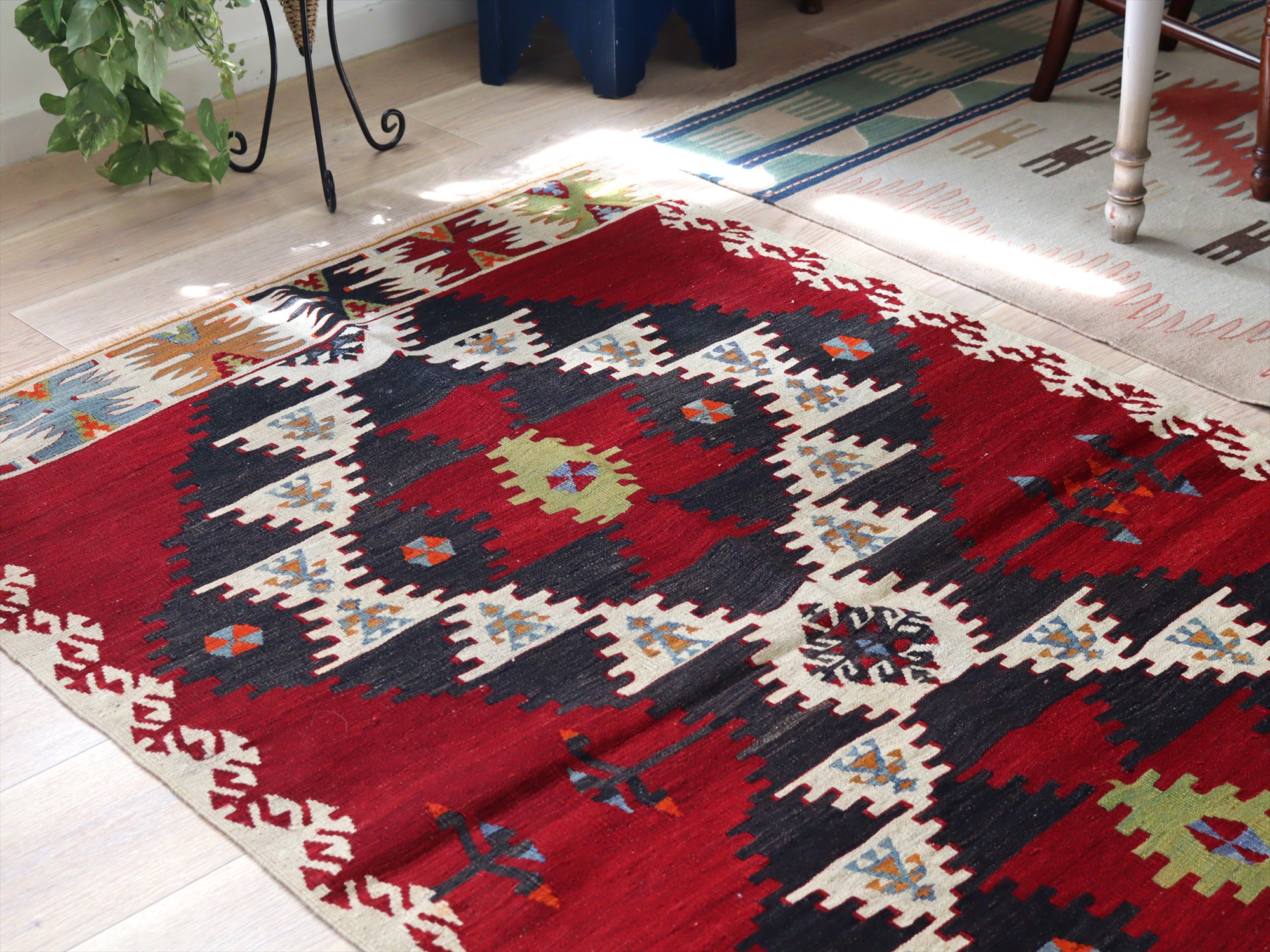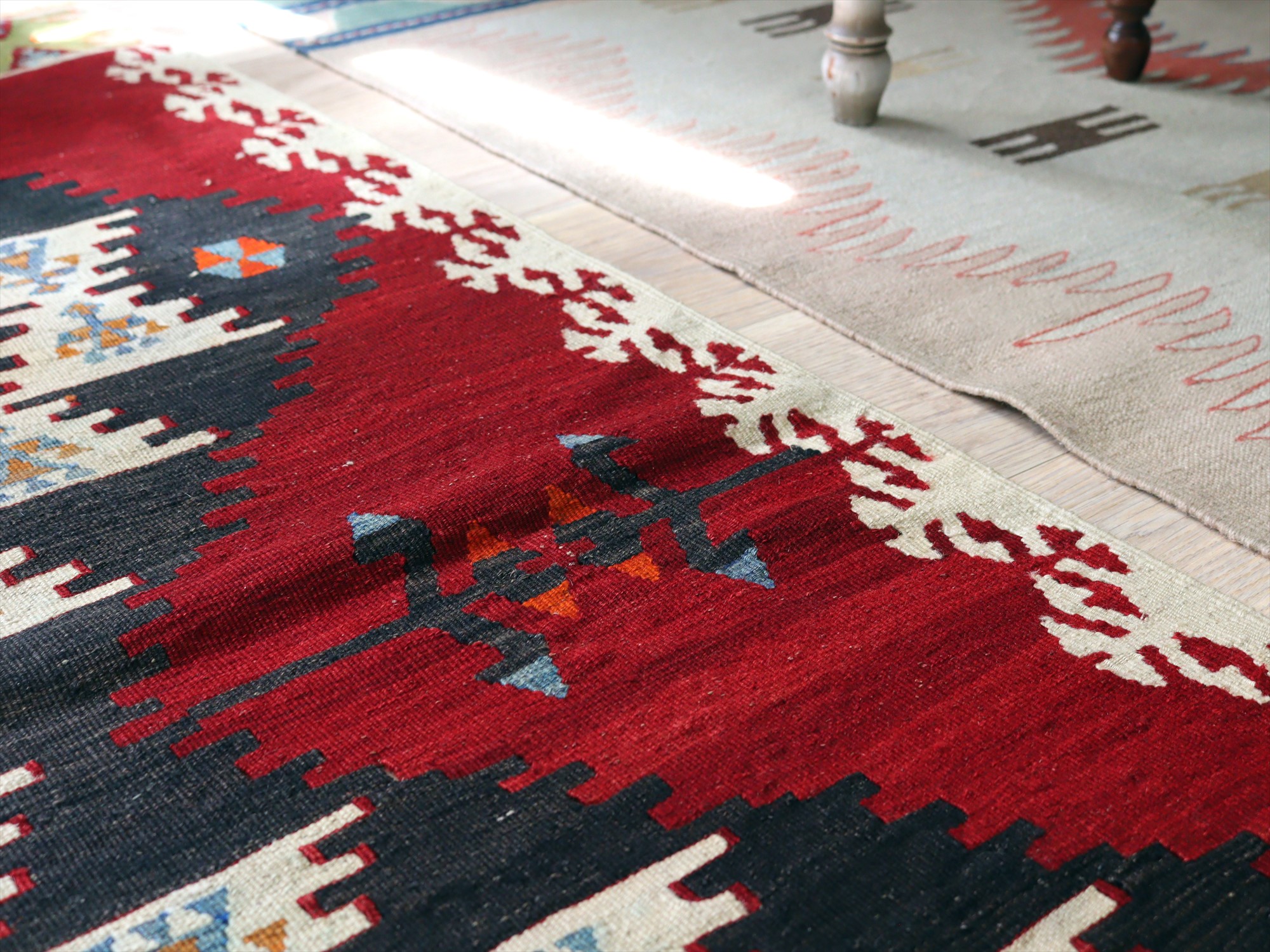トルコのカイセリ地方に位置する小さな村、ヤイヤルから出たキリムです。発色の良い赤のグラデーションベースに、小さいモチーフの組み合わせでメダリオンが構成されています。