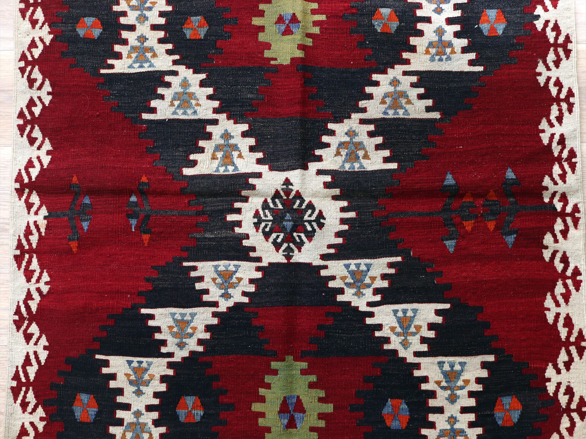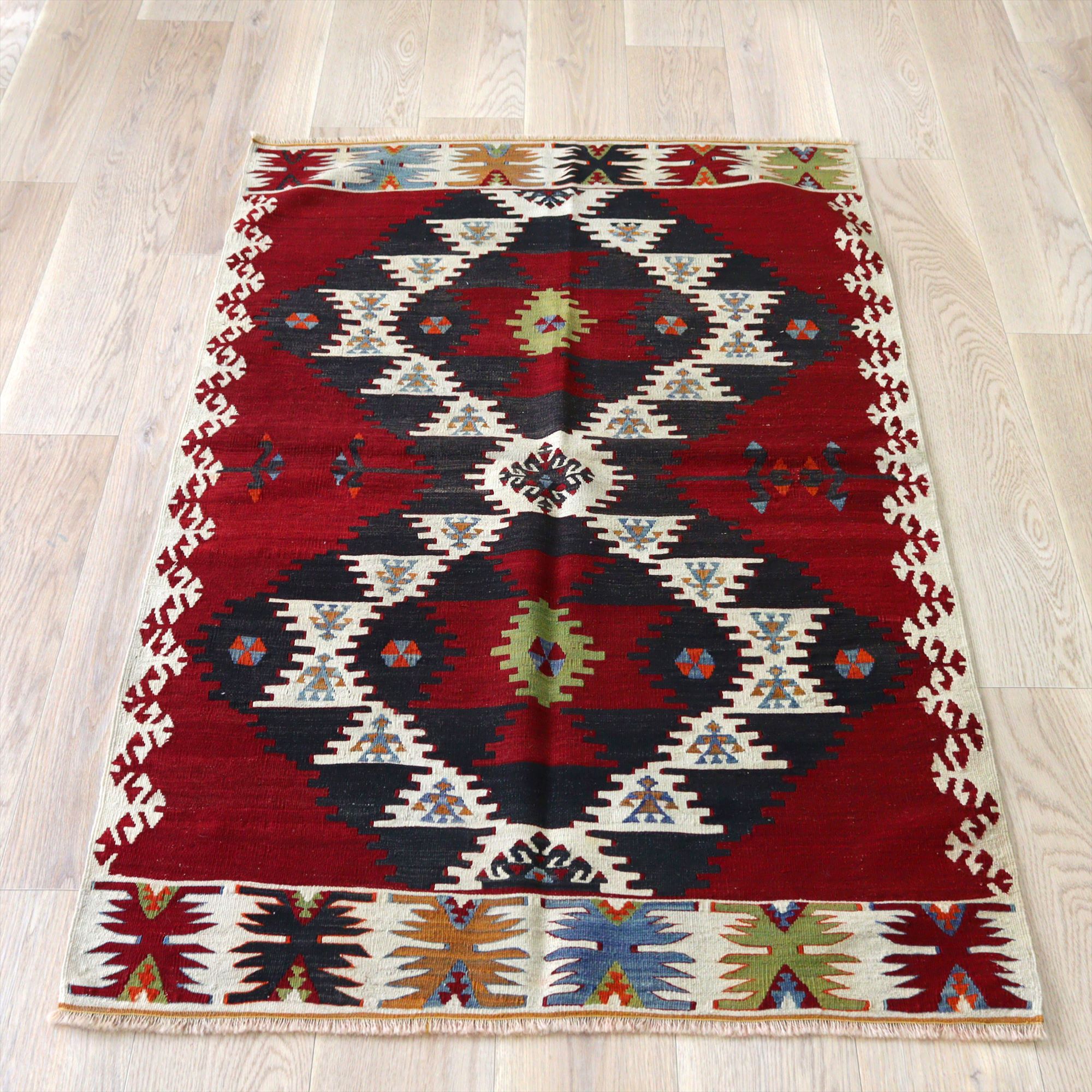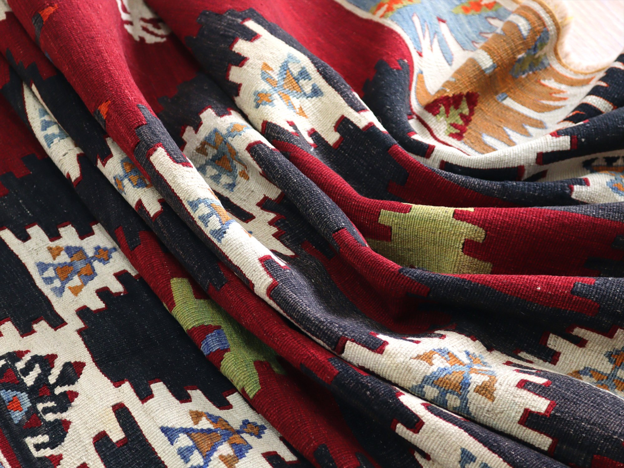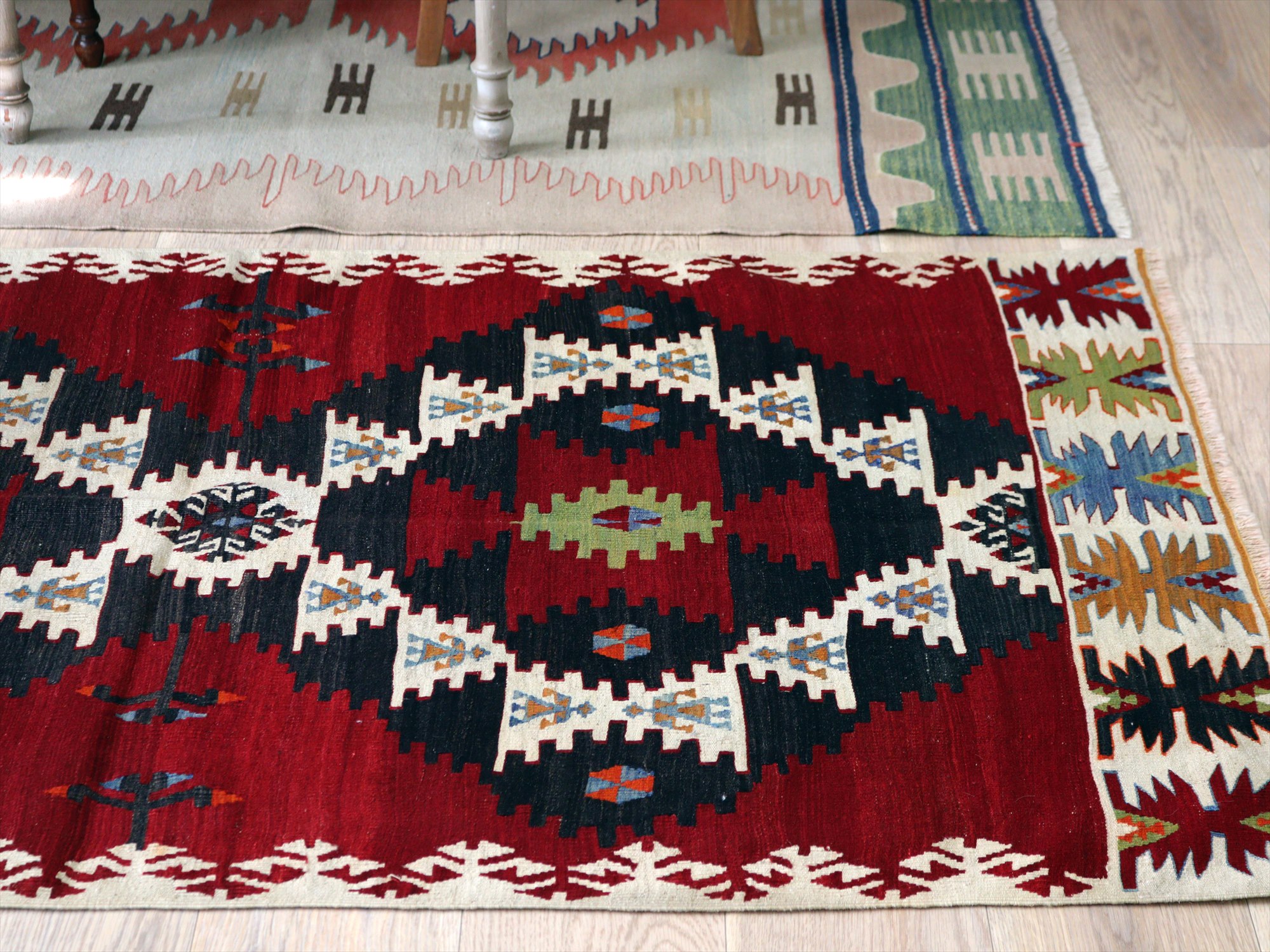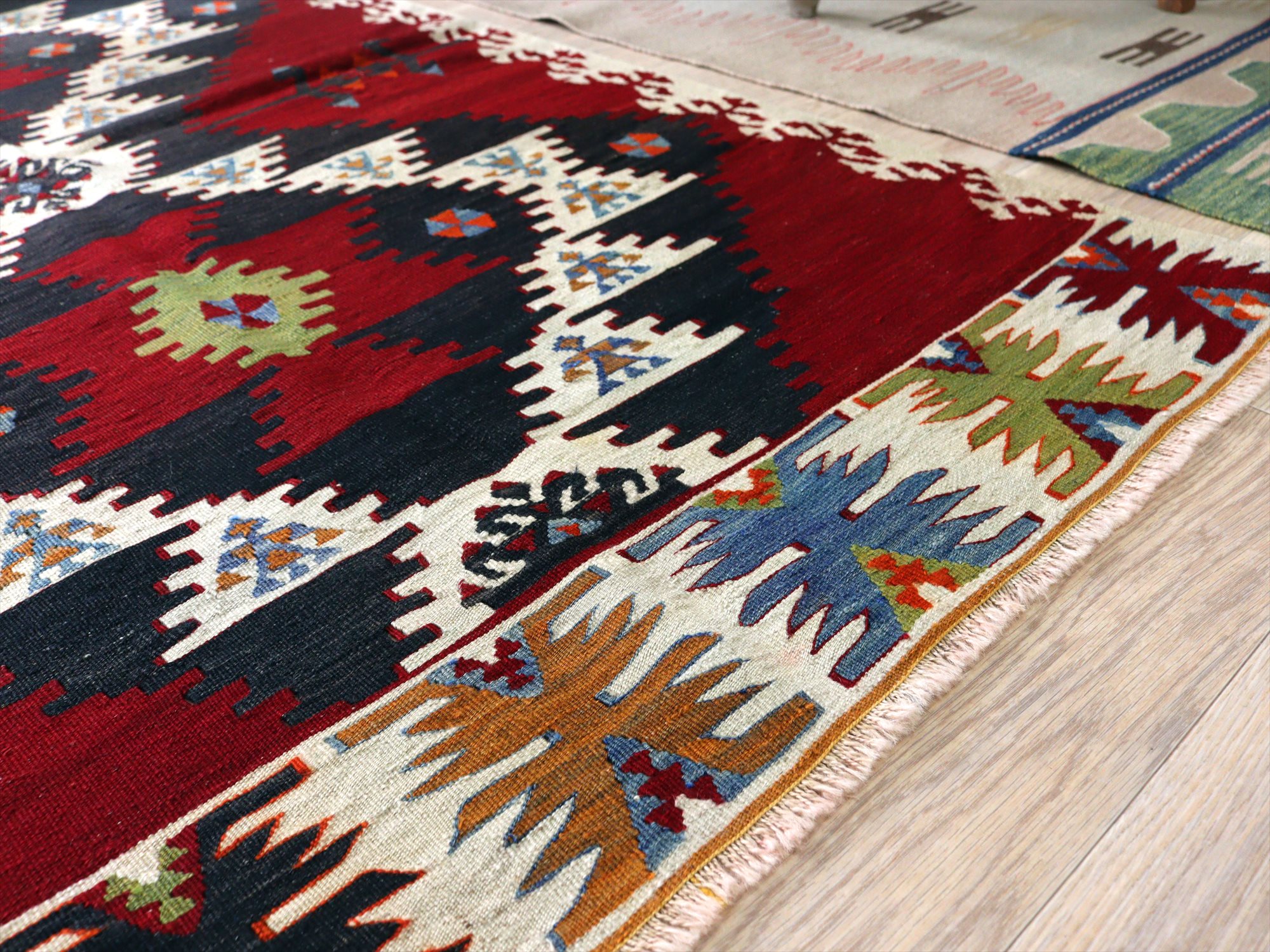 トルコのカイセリ地方に位置する小さな村、ヤイヤルから出たキリムです。発色の良い赤のグラデーションベースに、小さいモチーフの組み合わせでメダリオンが構成されています。