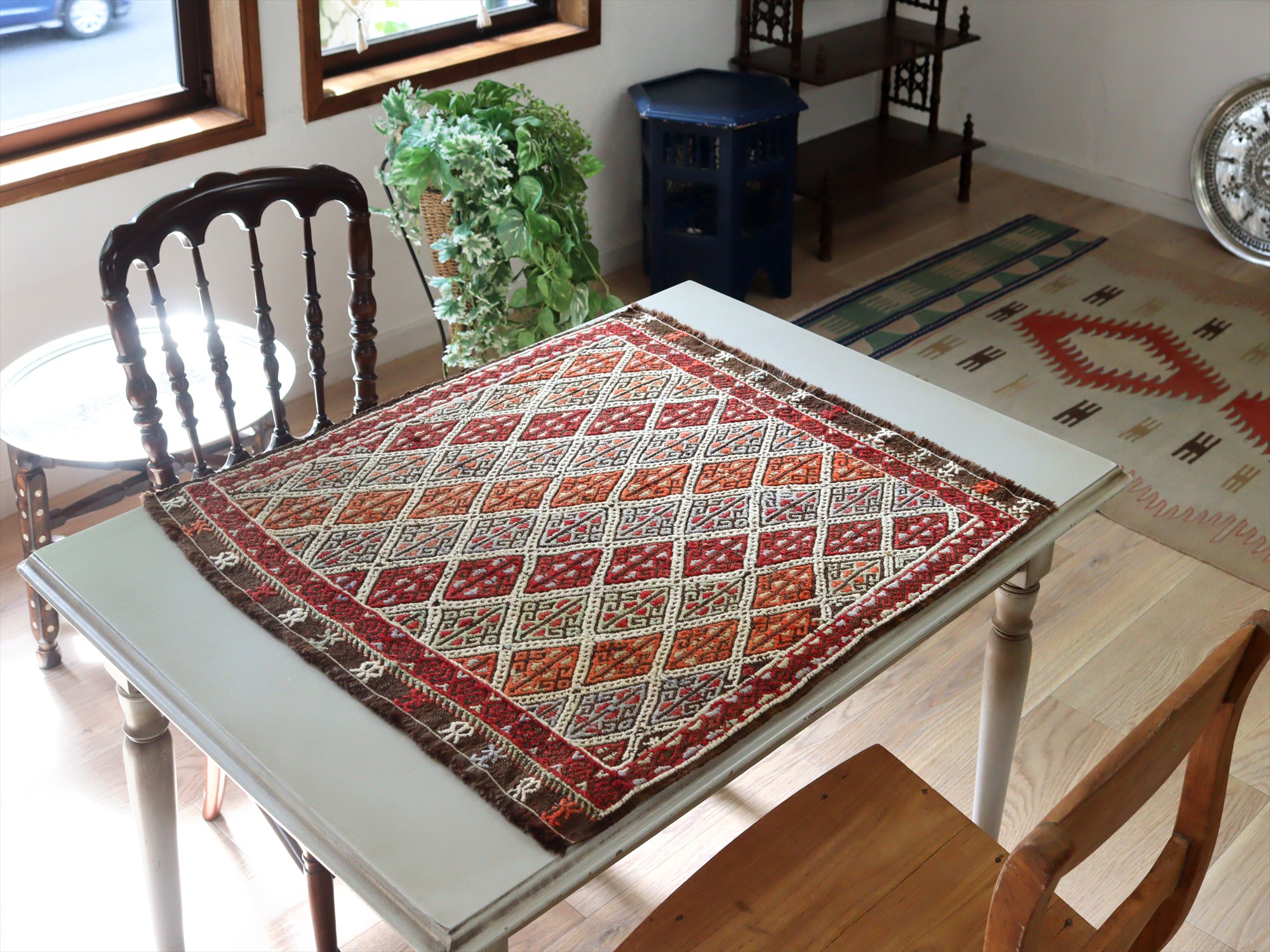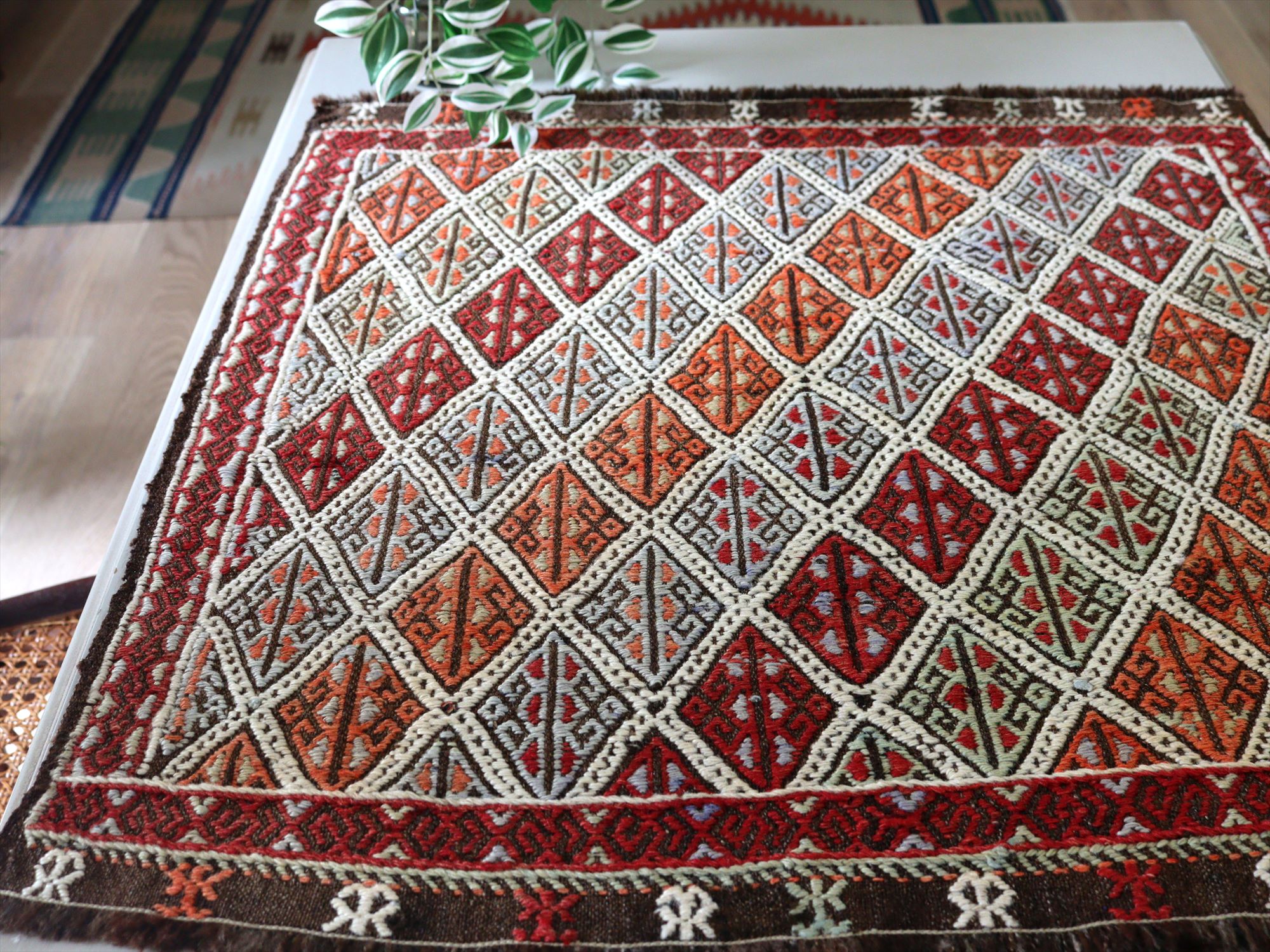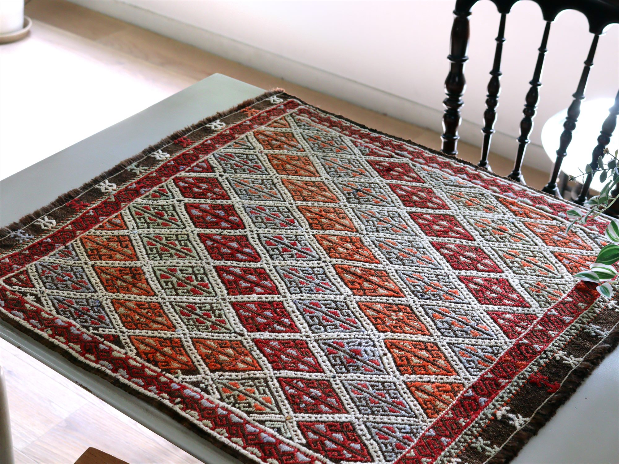 一面がジジム織りのキリム。連なるように織られたダイヤの中には、手足を伸ばすドラゴンのモチーフが表現されています。スクエアサイズで大きすぎず、アクセント使いにも丁度良いサイズです。