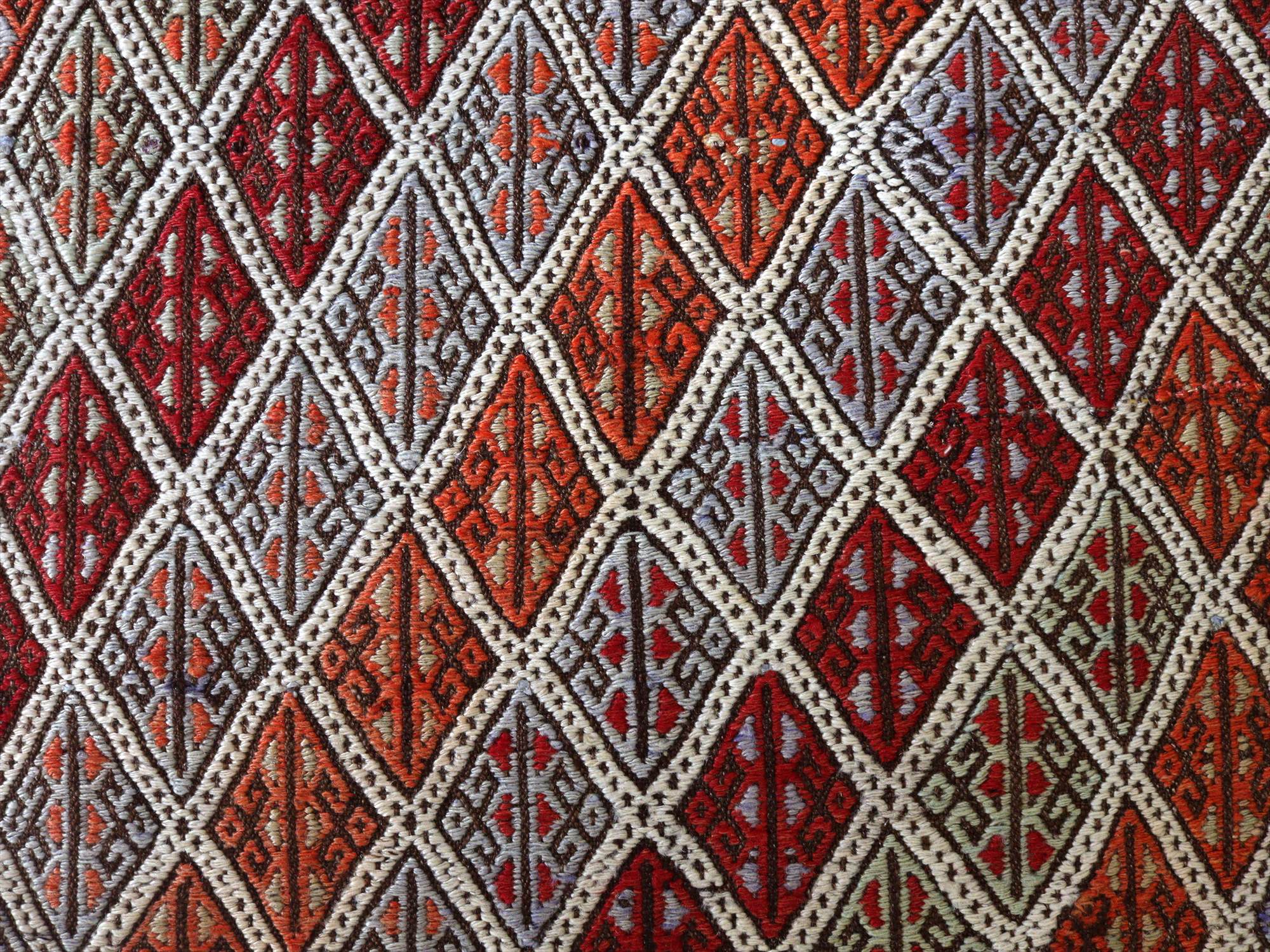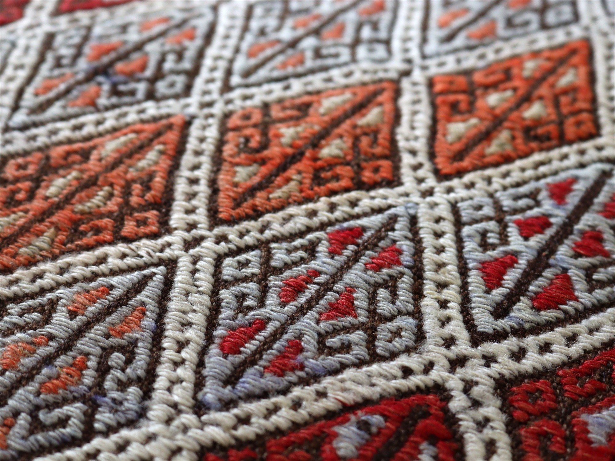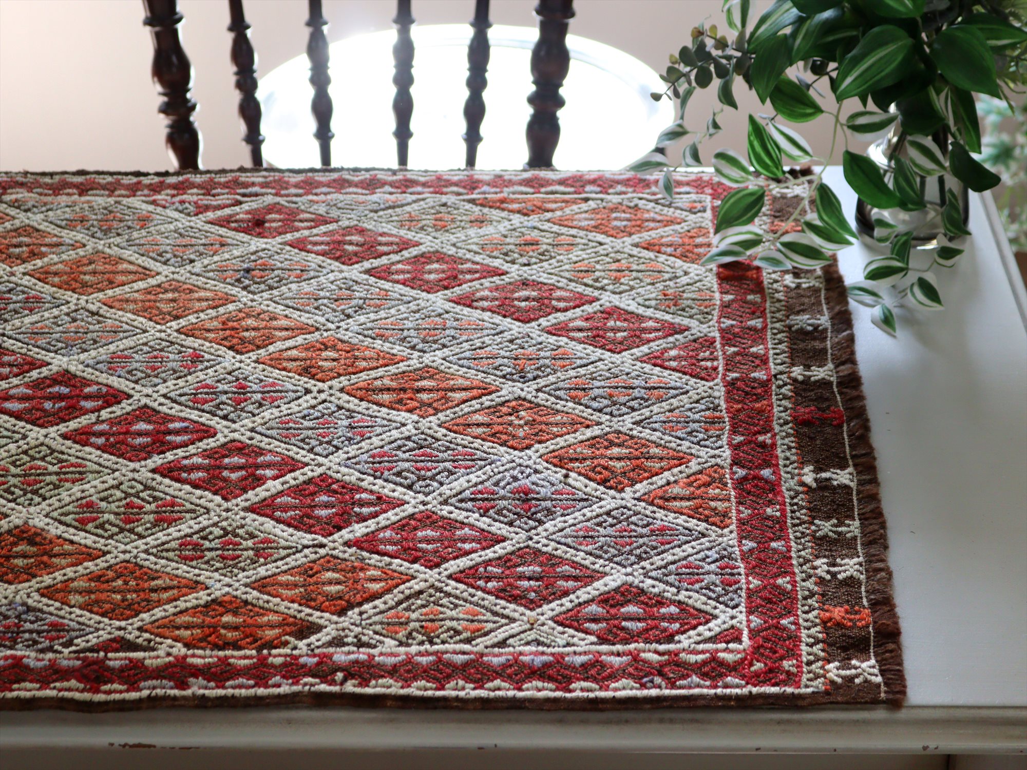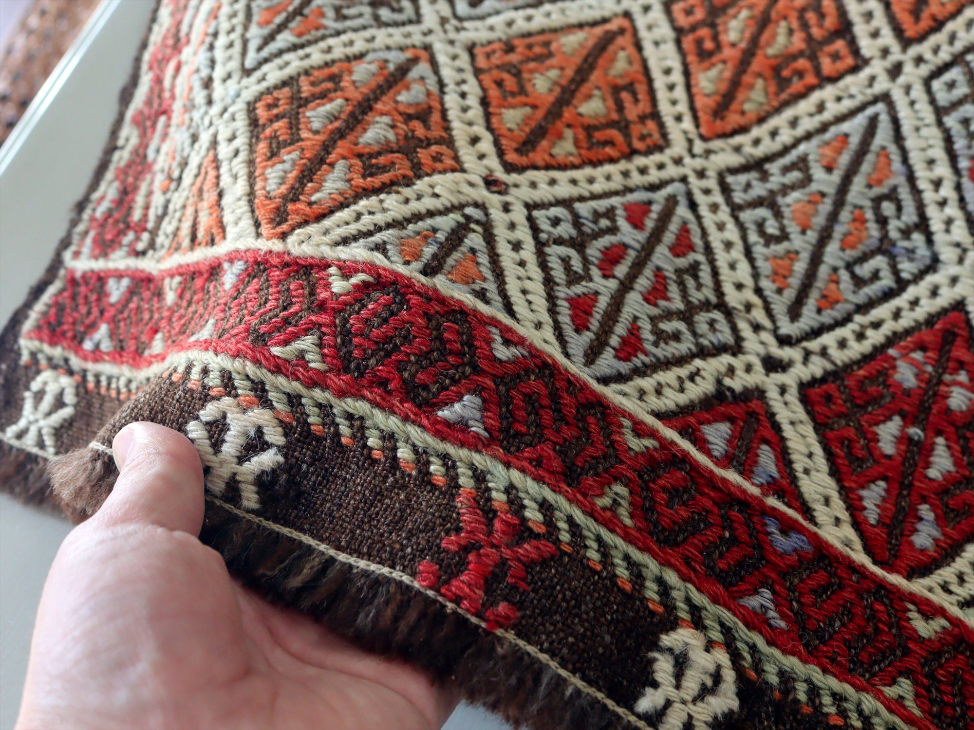 一面がジジム織りのキリム。連なるように織られたダイヤの中には、手足を伸ばすドラゴンのモチーフが表現されています。スクエアサイズで大きすぎず、アクセント使いにも丁度良いサイズです。