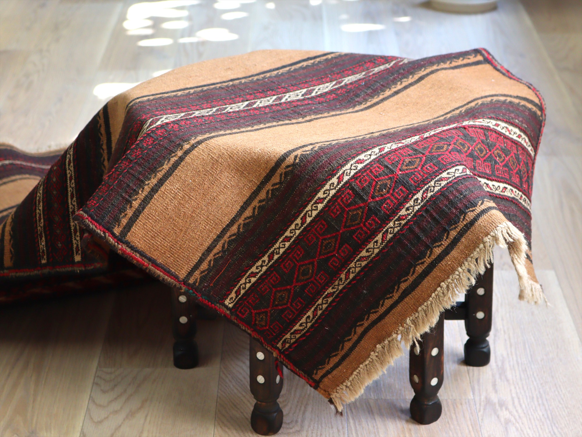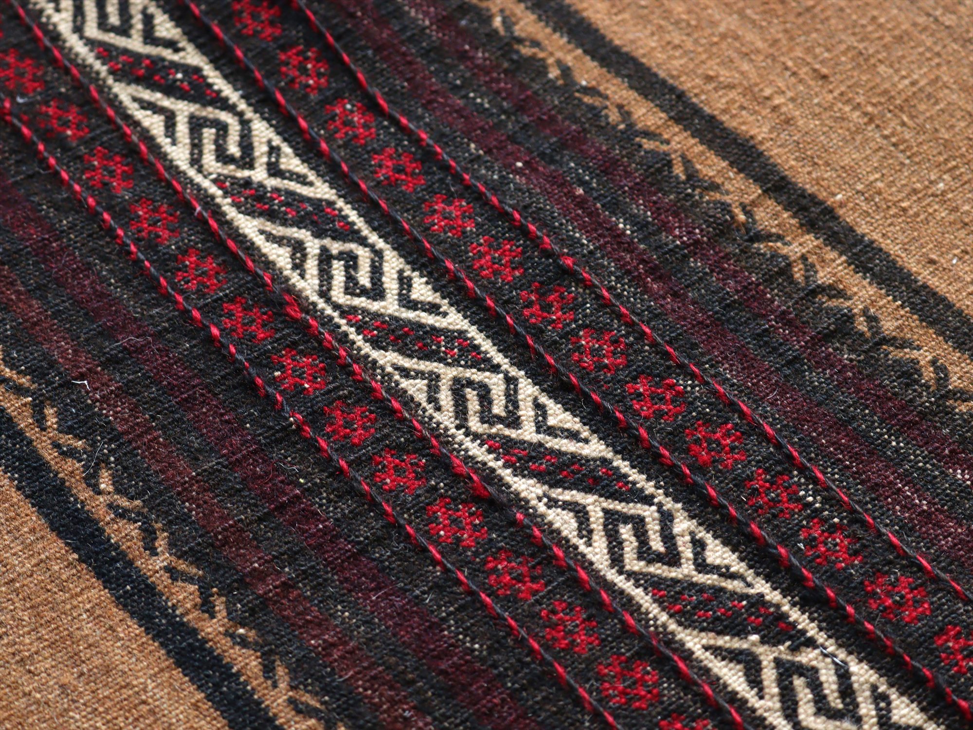 平織りとスザンニ織りのミックスで織られたバルーチ族のキリムです。刺繍のように織られている部分は、スザンニ織りが成されていて、緻密で丁寧に幾何学模様が織られています。