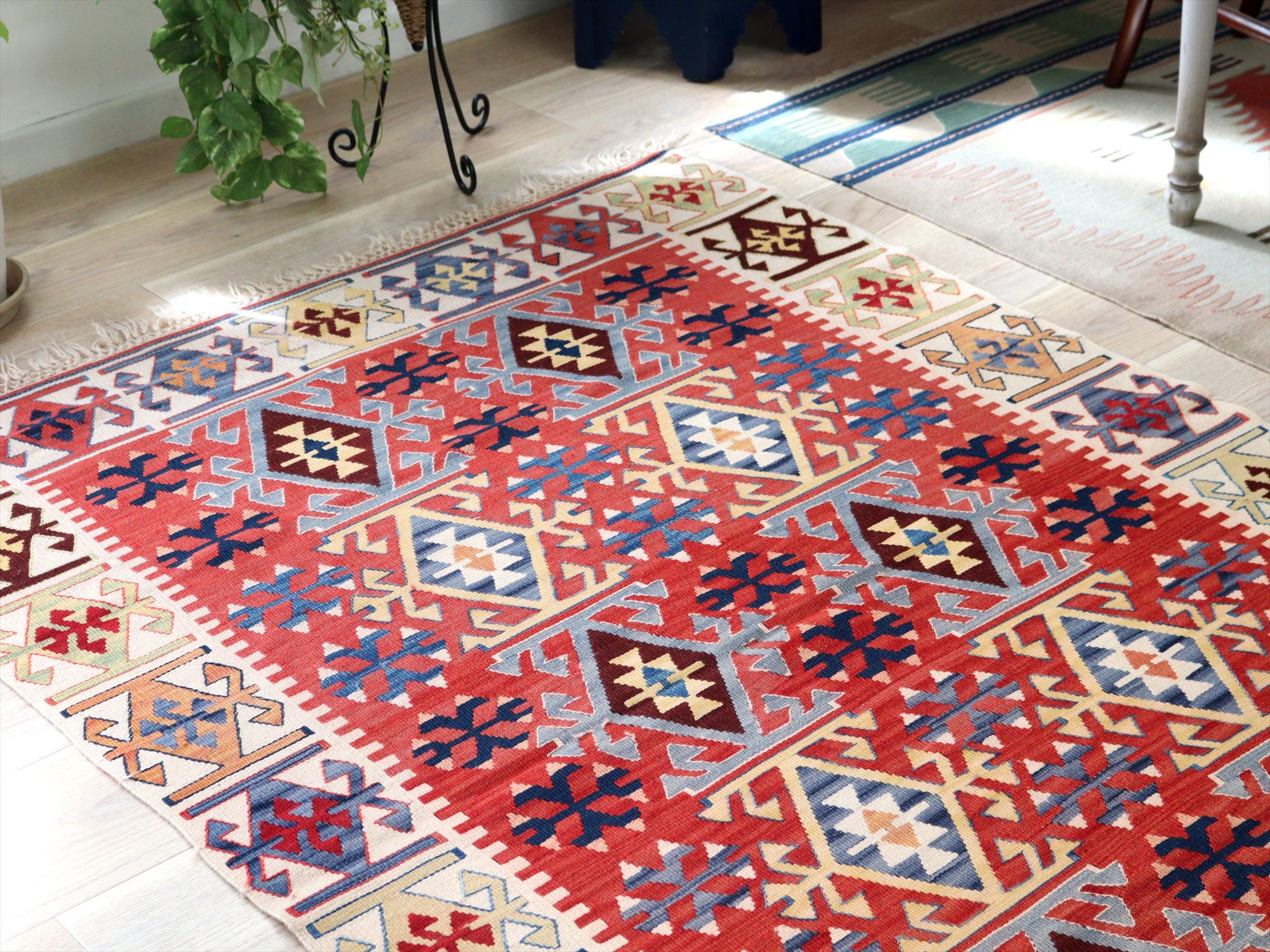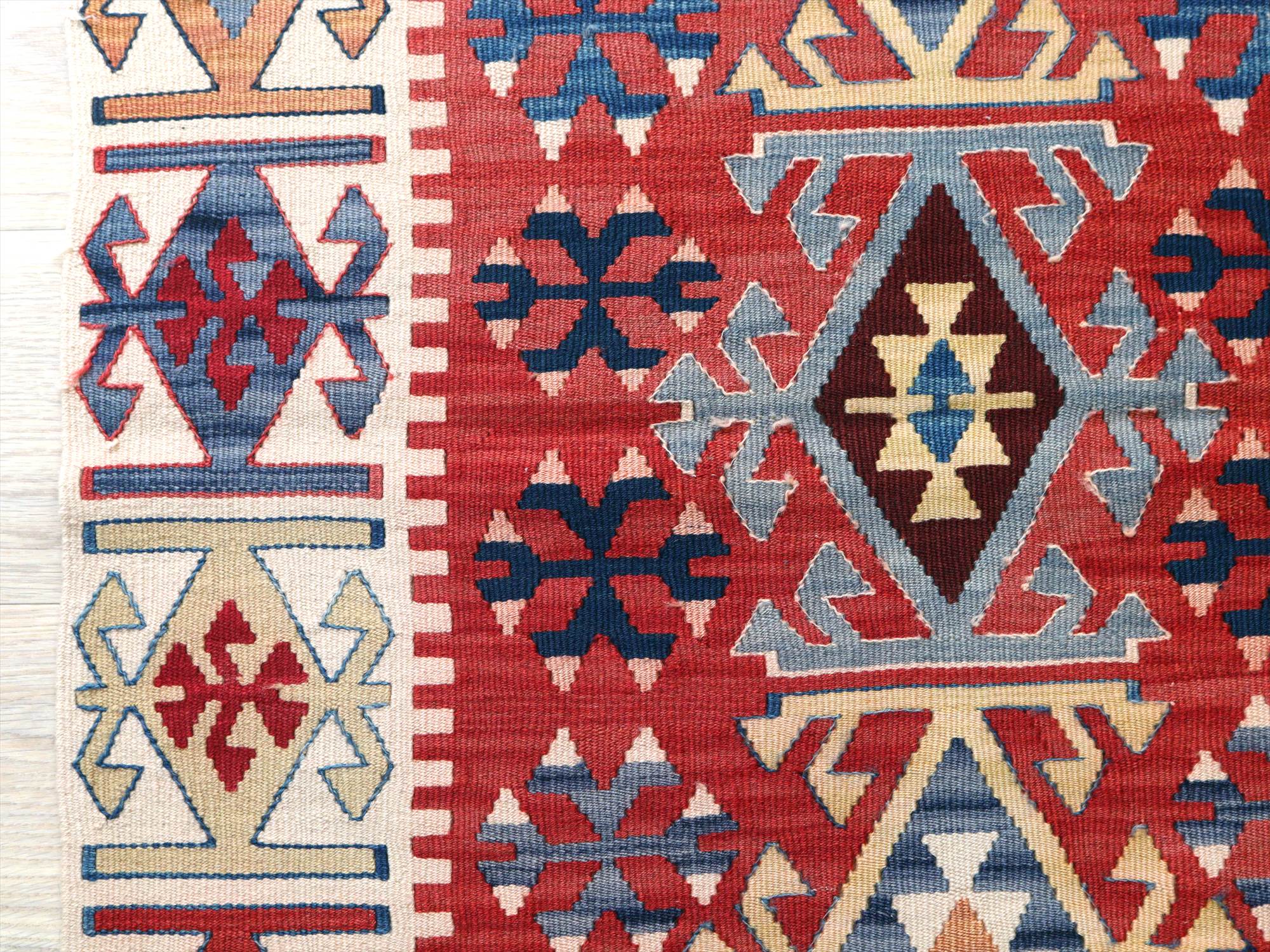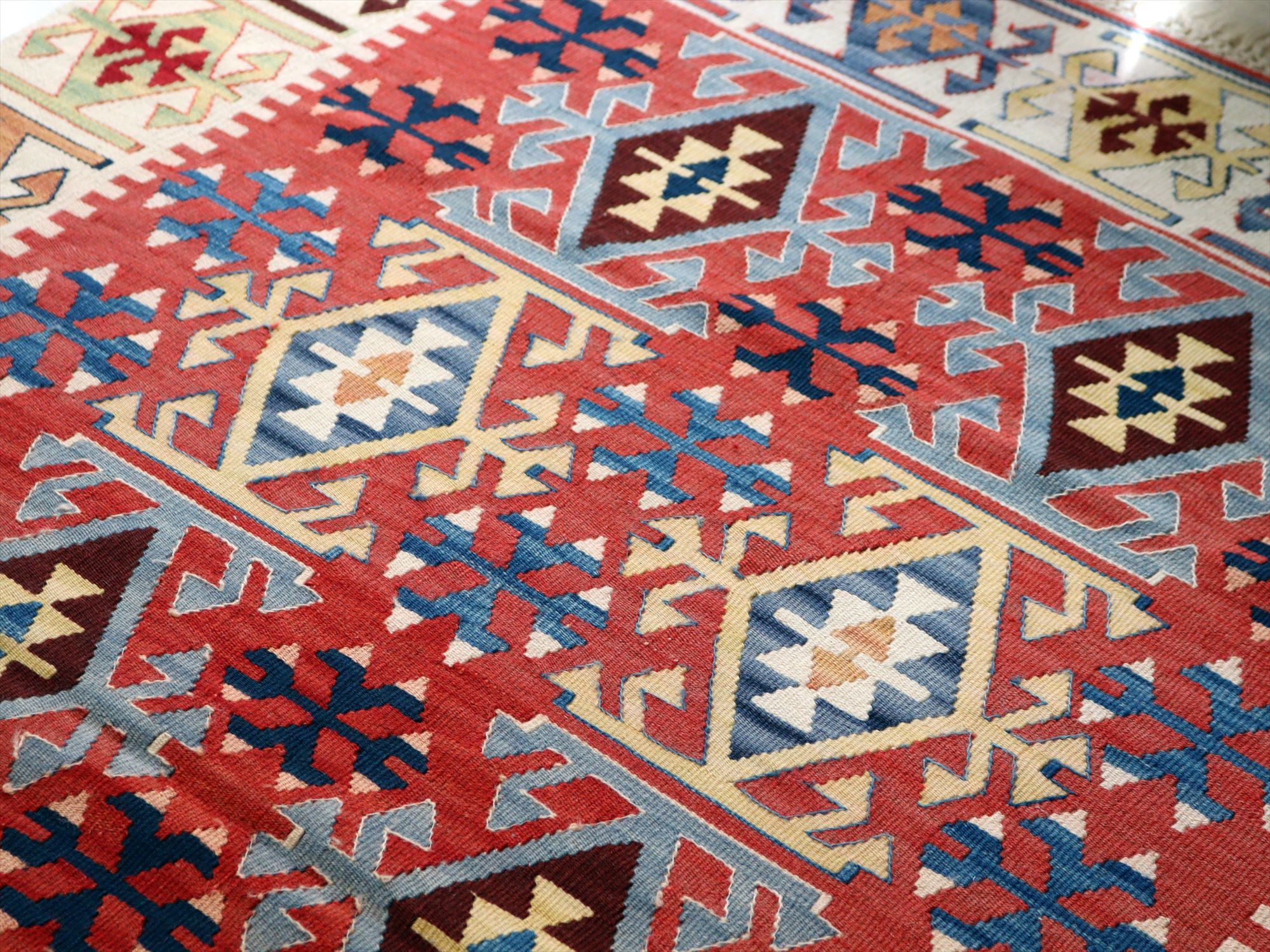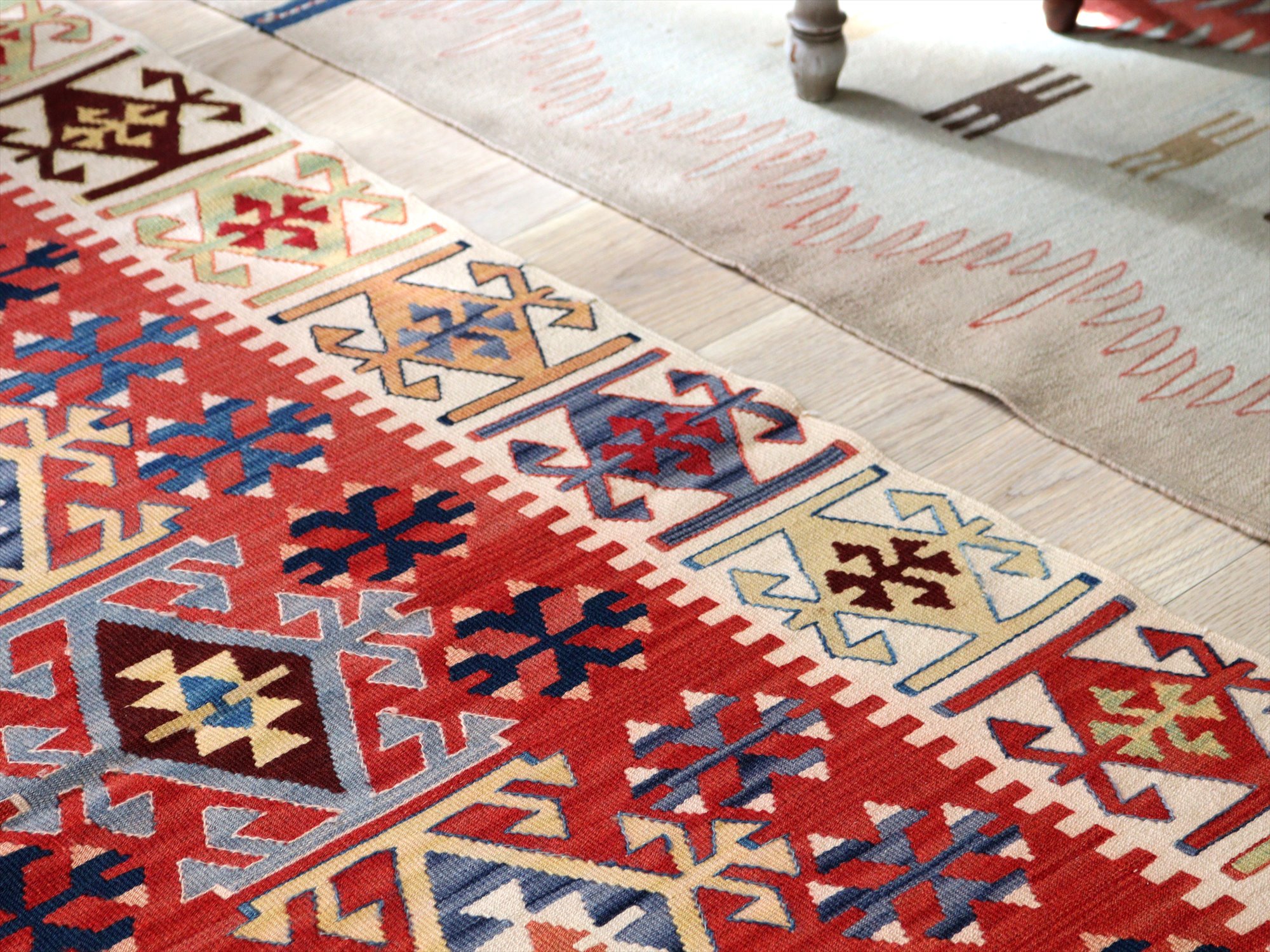雄羊の角や、狼の口、イーブルアイなど様々なモチーフが一面に織り込まれたカイセリ産のキリムです。色使いも華やかで、とてもあたたかみの感じられる1枚です。