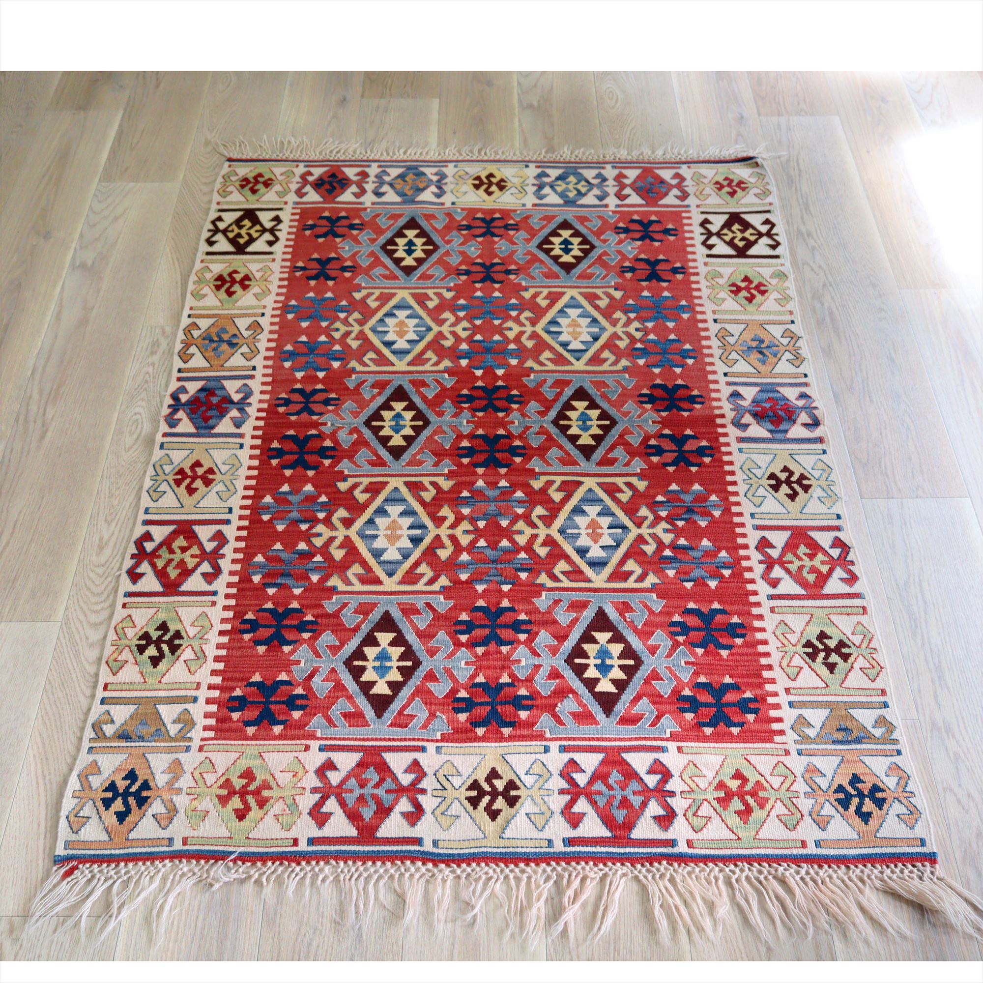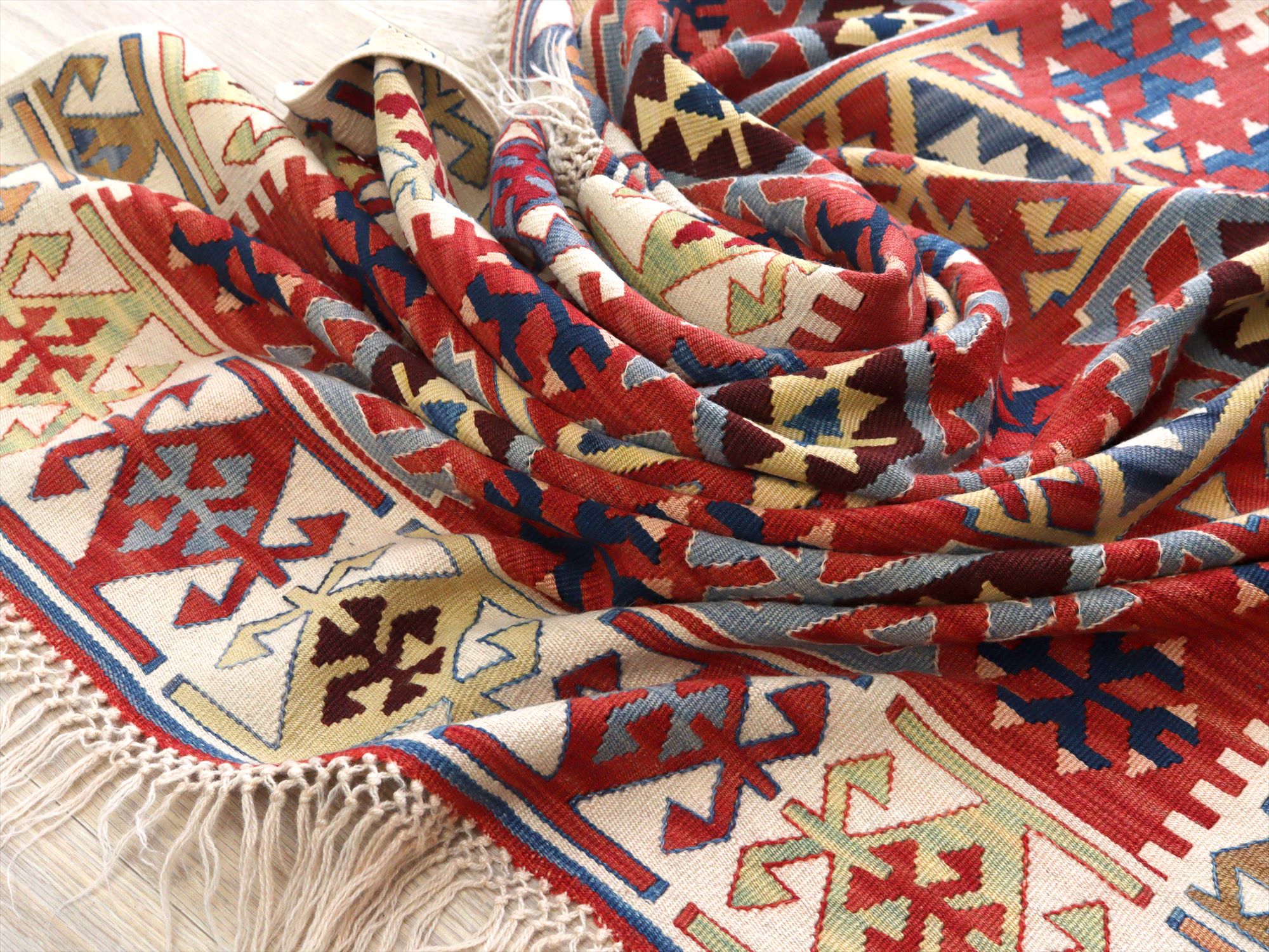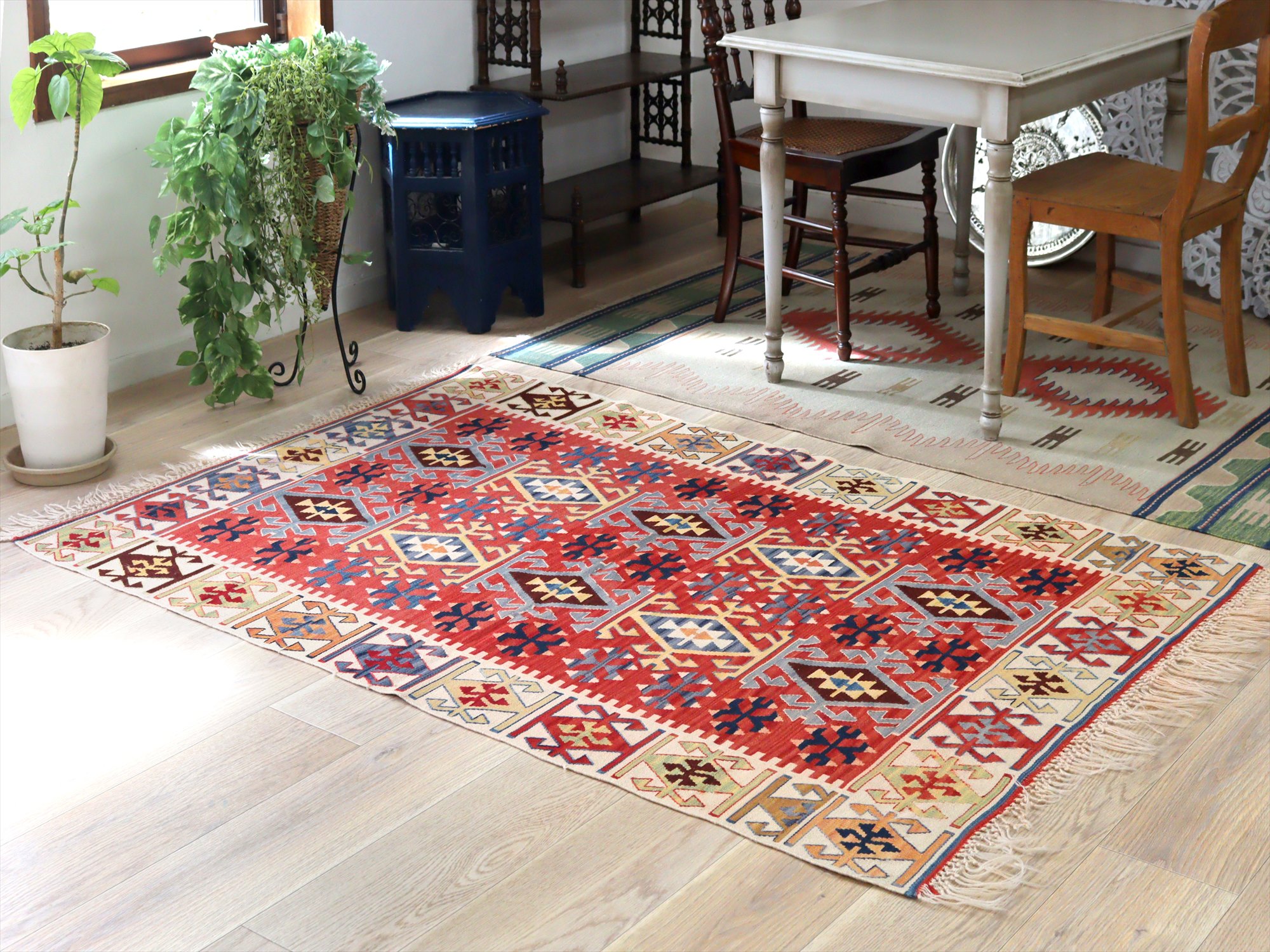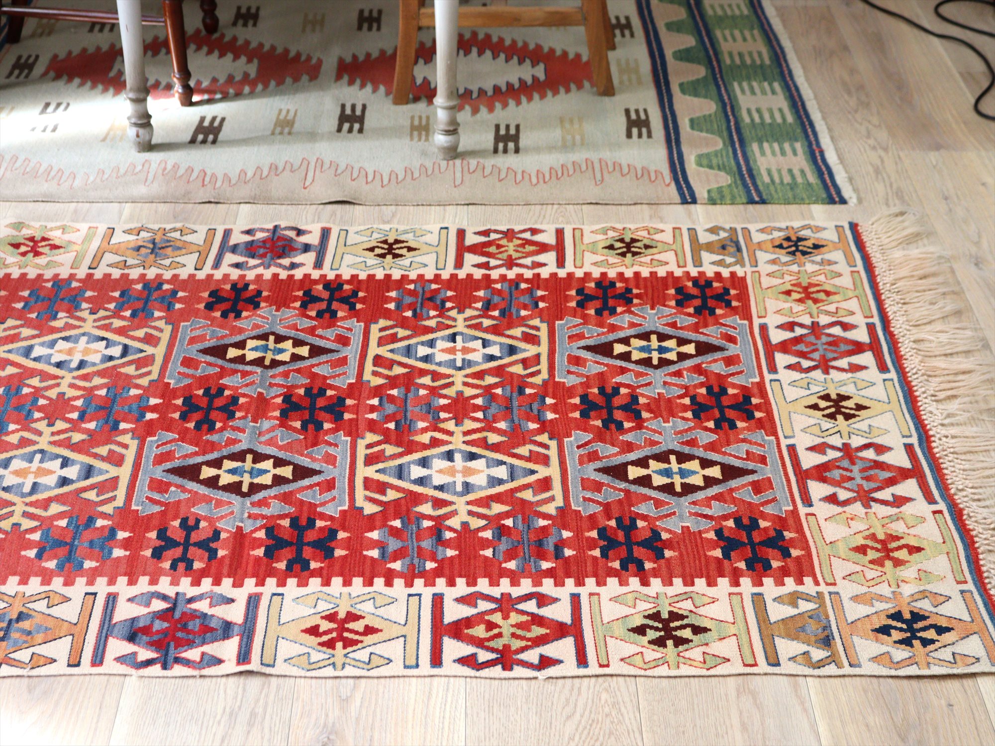 雄羊の角や、狼の口、イーブルアイなど様々なモチーフが一面に織り込まれたカイセリ産のキリムです。色使いも華やかで、とてもあたたかみの感じられる1枚です。