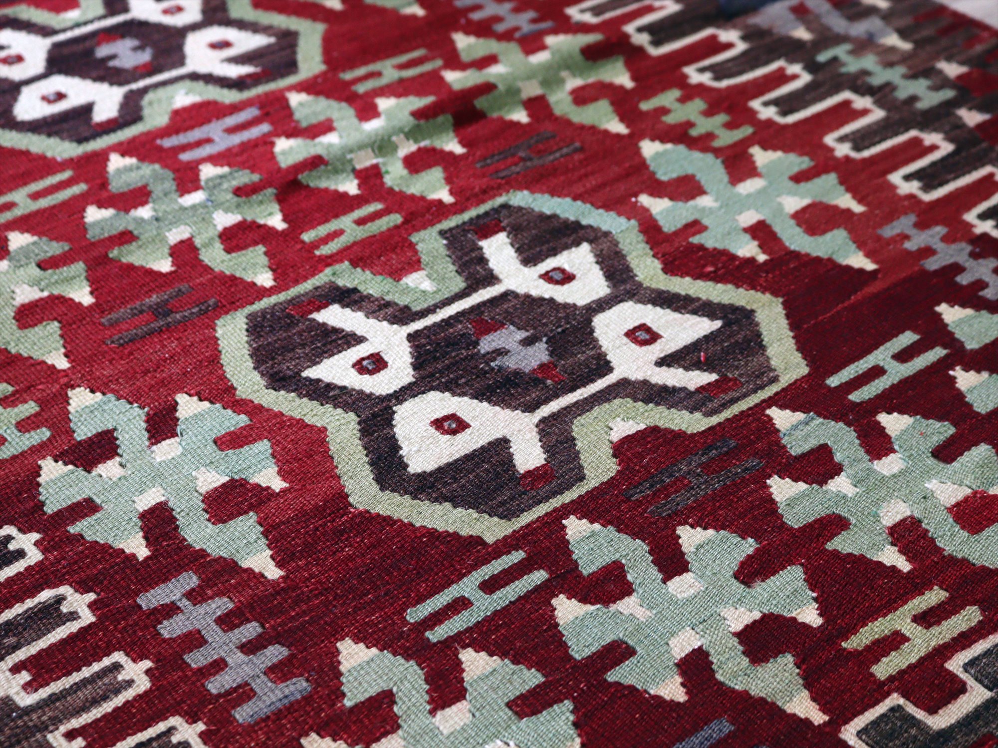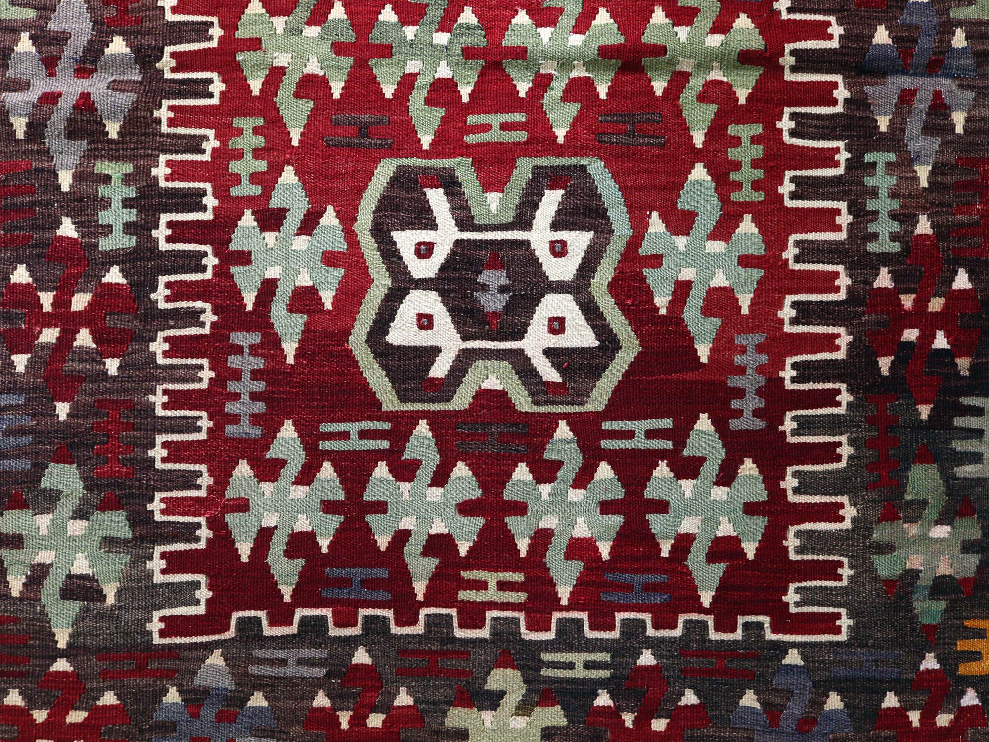 濃いレッドとブラウンをメインとした色使いで織られたエシュメキリム。一言にレッド、ブラウンと言ってもそれぞれの色に濃淡があり、色が僅かに切り替わりながら織られていてユニークです。