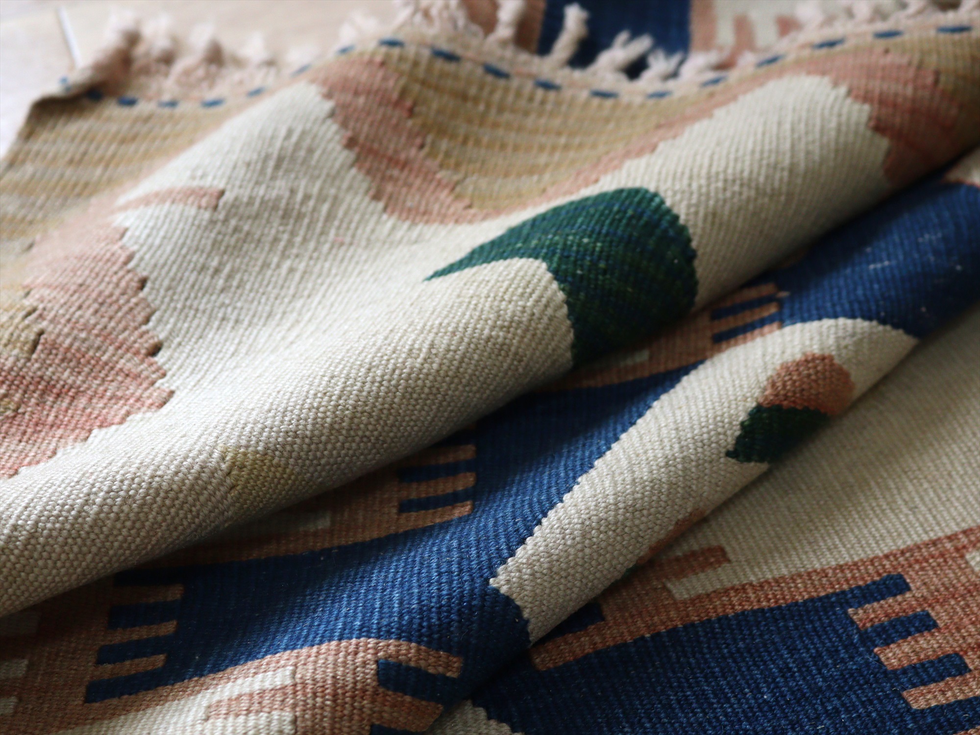 ベージュベースに、ブルーやグリーンで曲線も取り入れながらモチーフが表現されたデザイン。大きすぎるサイズでもなく、アクセントに取り入れたい1枚です。