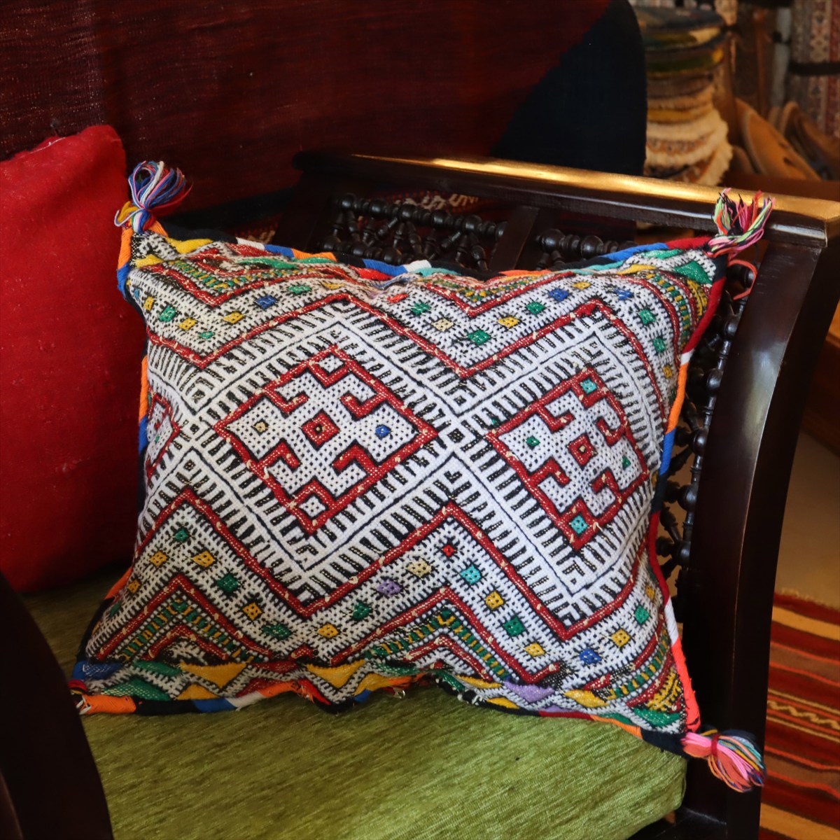 もともとクッションとして使うために織られたもので、四隅にはポンポンもつけられています。表面は刺繍のようにも見えますが、ベルベル族の伝統的な技法の織りです。(スマック織りのグループ)