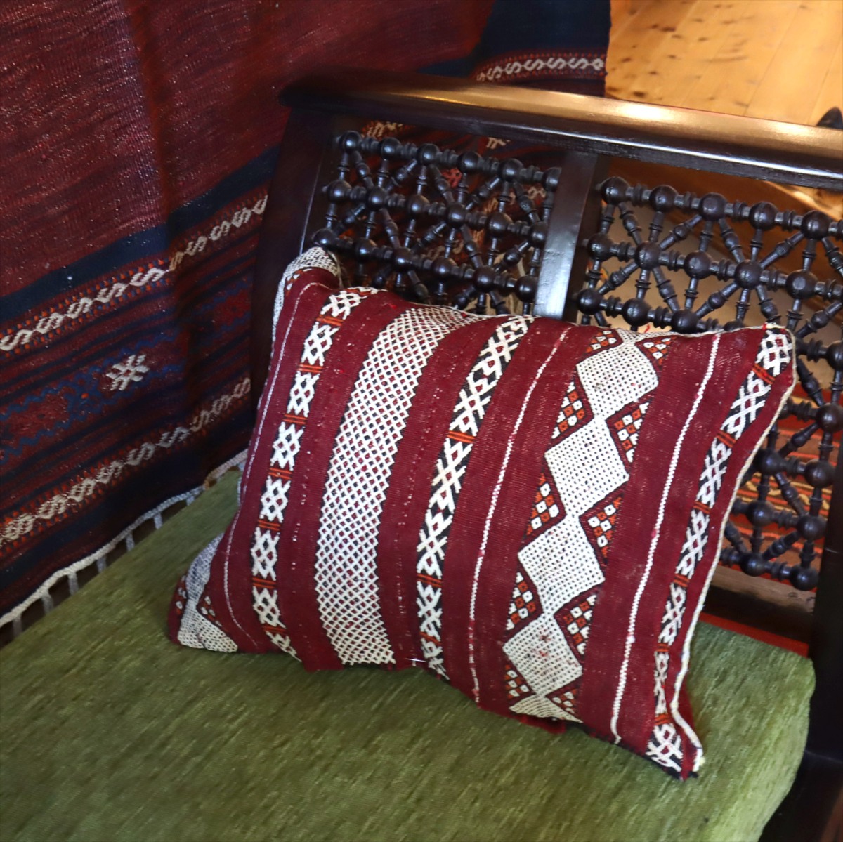 ゼンモール族の伝統的な色使いで織られた赤と黒のキリムが使われ、クラシックなモロカンスタイルにぴったりのクッション。裏面はカジュアルなストライプで、また違った雰囲気が楽しめます。