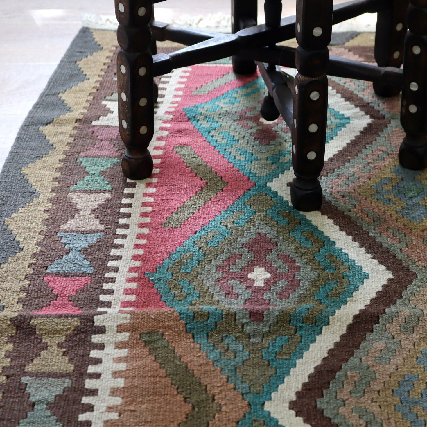 グリーン系とブラウンを基調とした色使いのキリム。全体的には落ち着いた色使いながら、赤茶がった色糸を取り入れることで程よいアクセントになっています。
