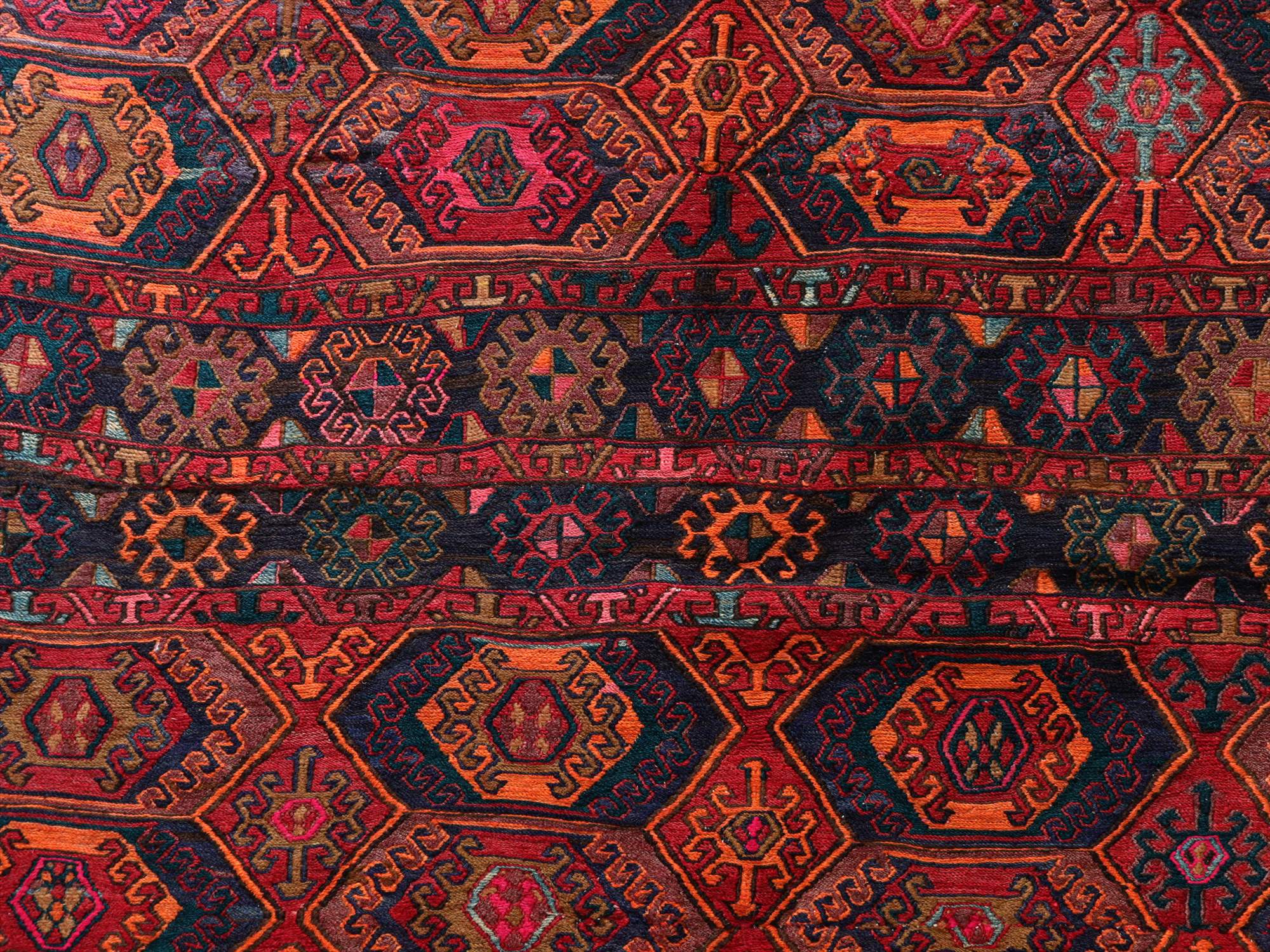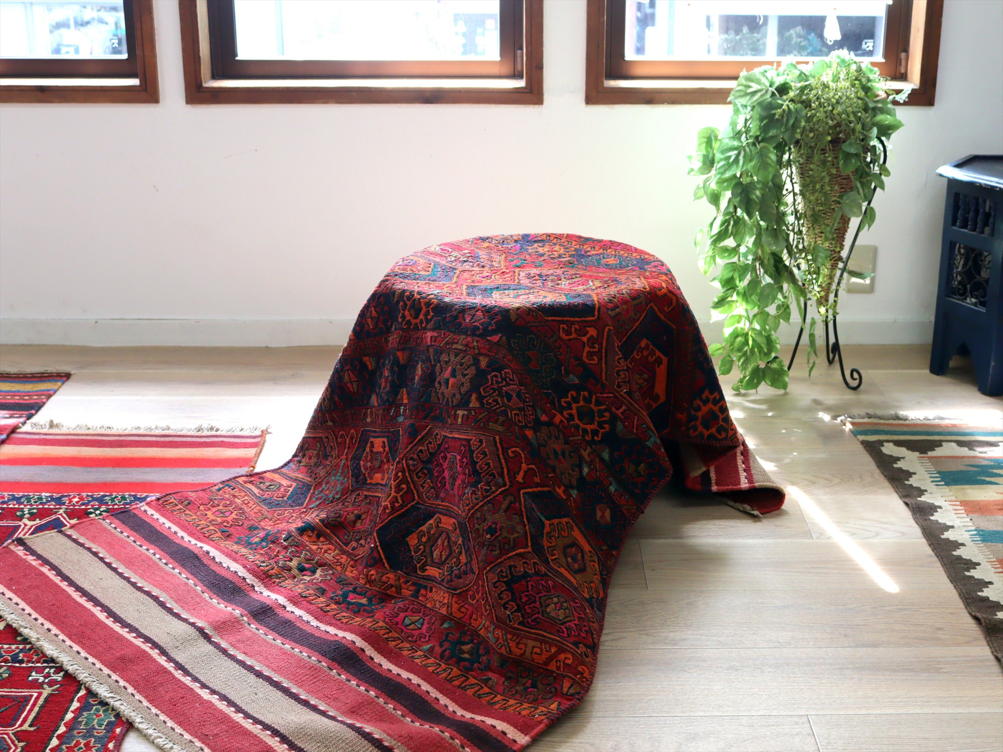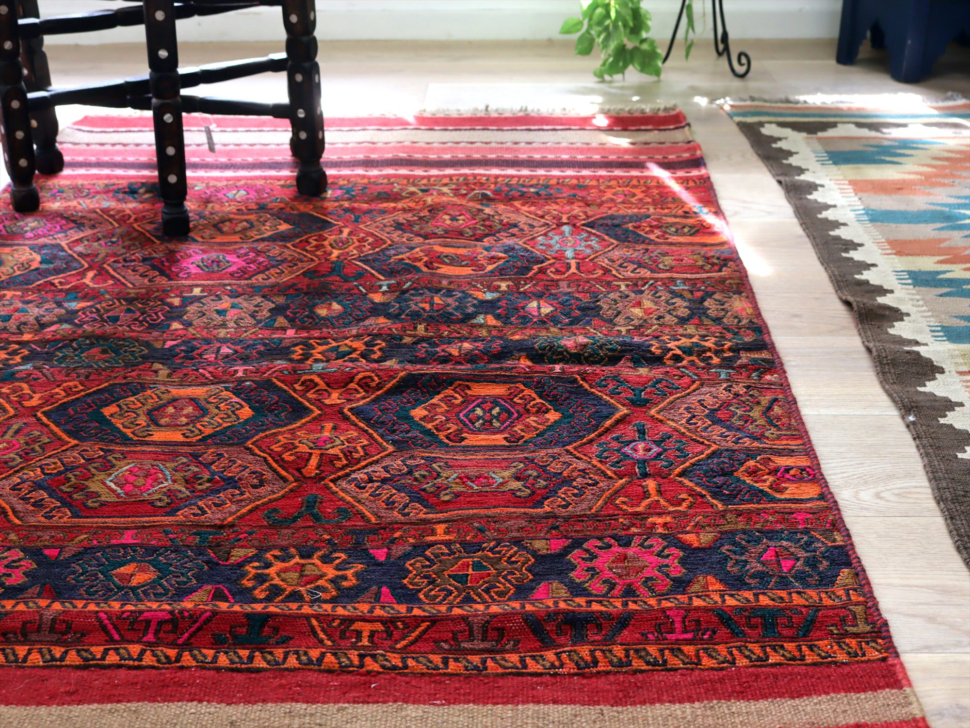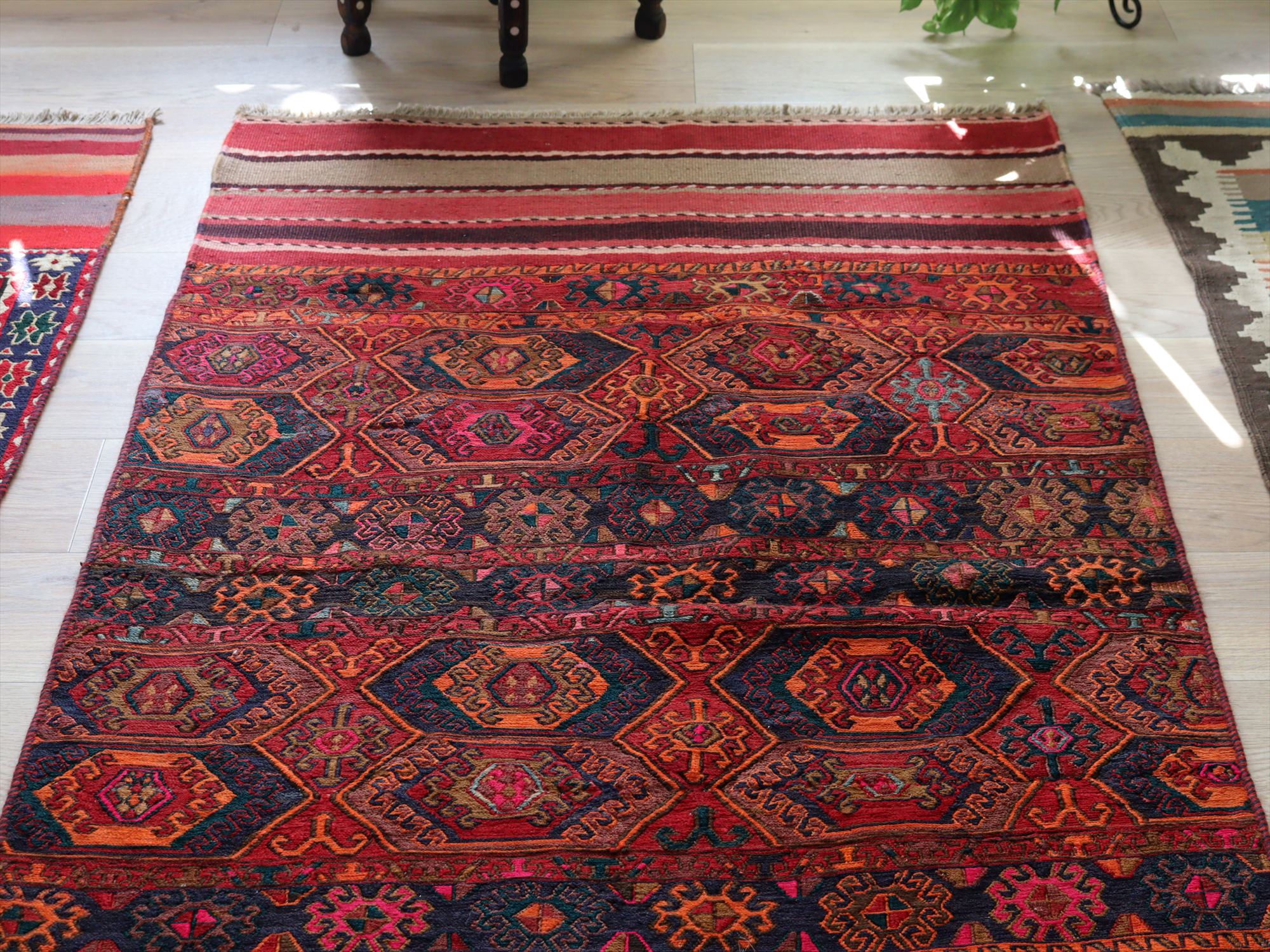 レッドやオレンジなど明るい色をベースとした、ゆりかごのような箱型の収納ケース(マフラッシュ)として織られたキリム。ピンクやグリーンを使ってメダリオンが並んで華やかな雰囲気です。実際には縫い合わせて家財道具として使われていた様子はなく、大切に保管されていたもののようです。