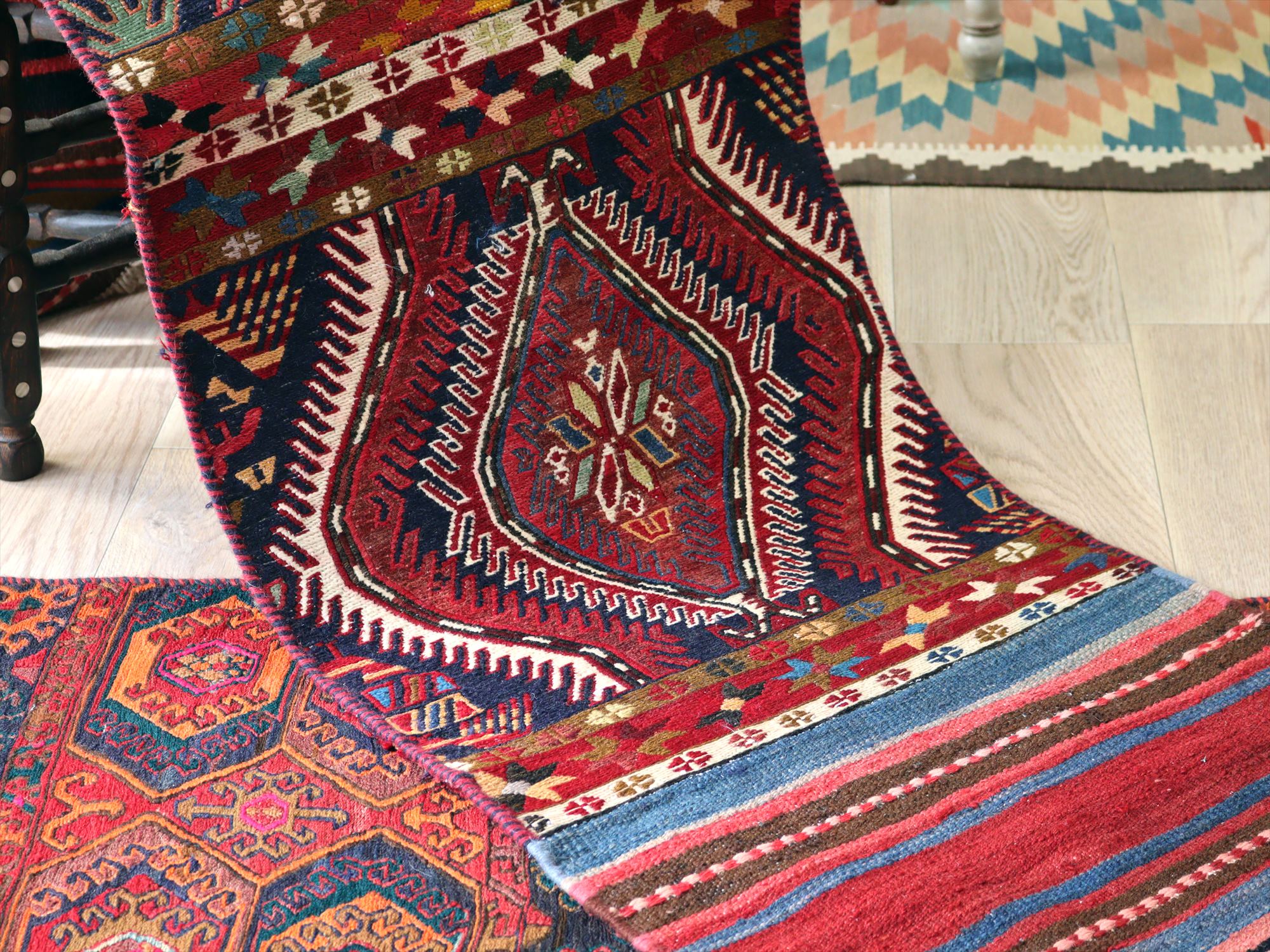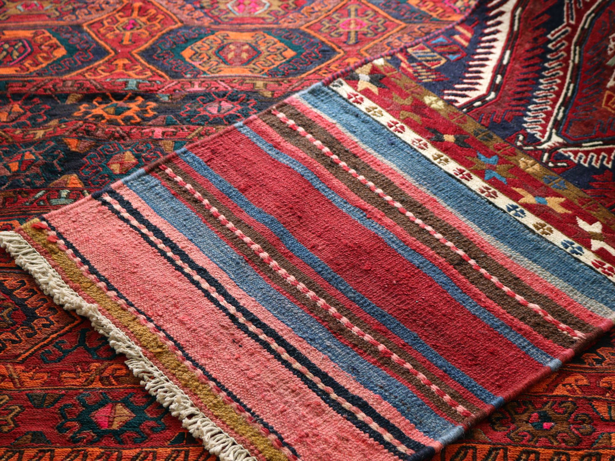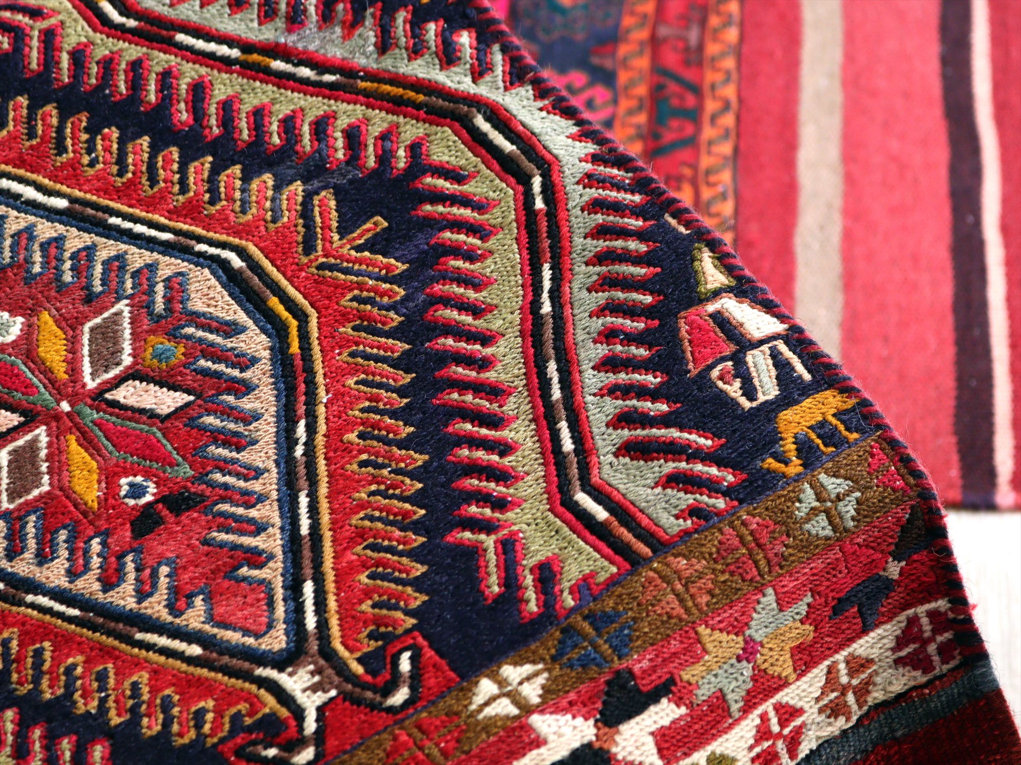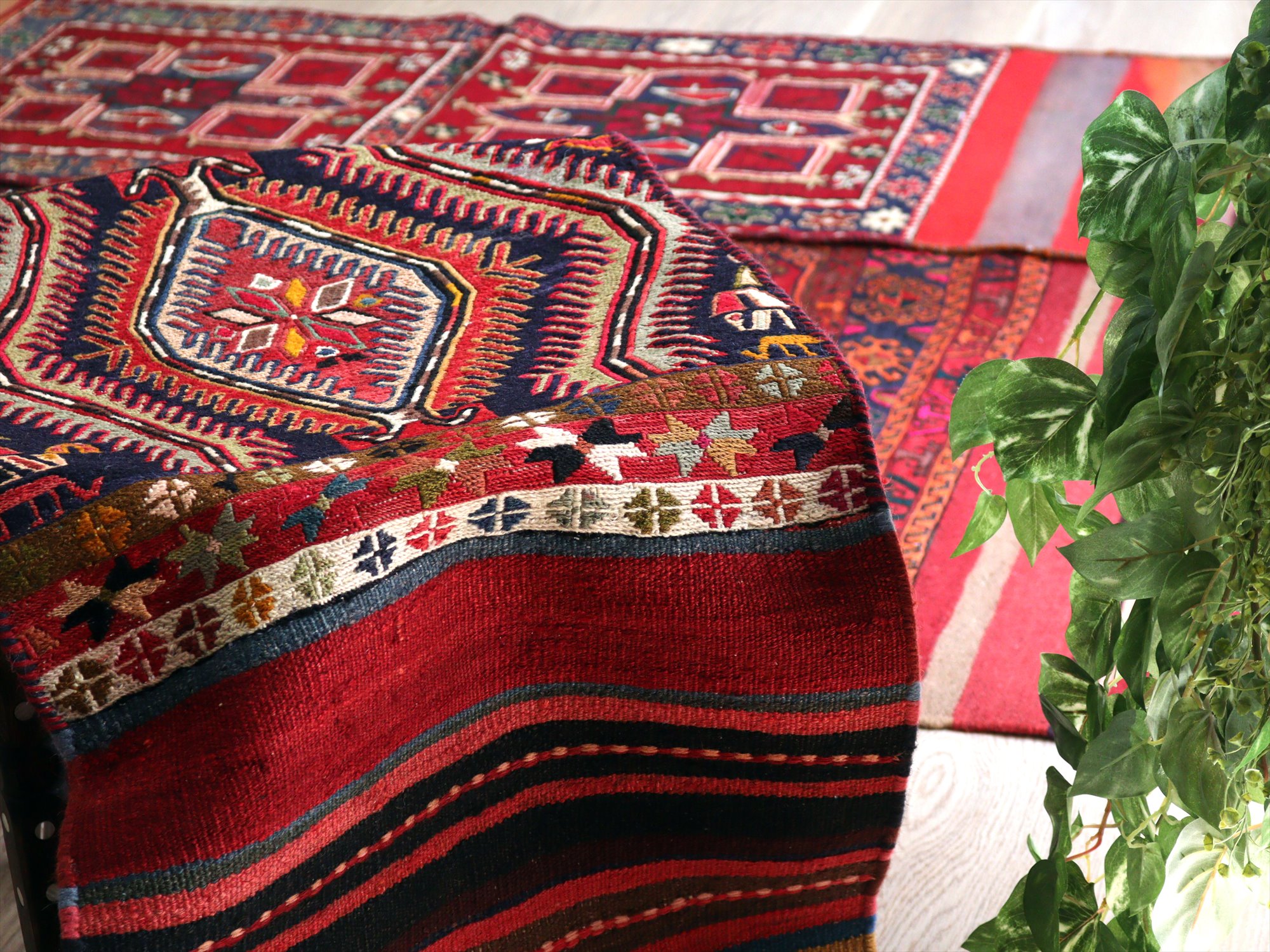レッドやオレンジなど明るい色をメインとした、家財道具などを収納する袋(サドルバッグ)として織られたキリム。実際には縫い合わせて家財道具として使われていた様子はなく、大切に保管されていたもののようです。