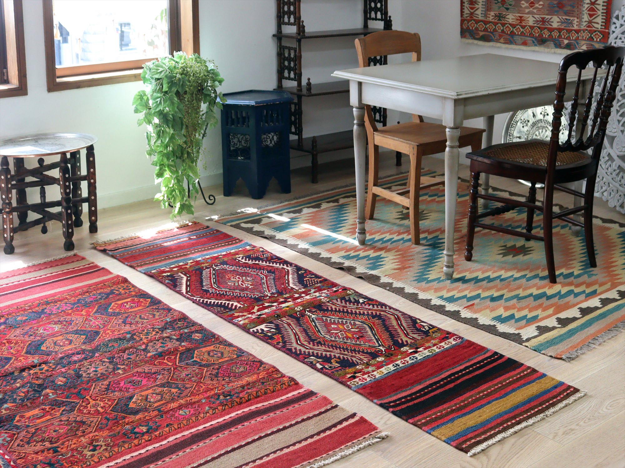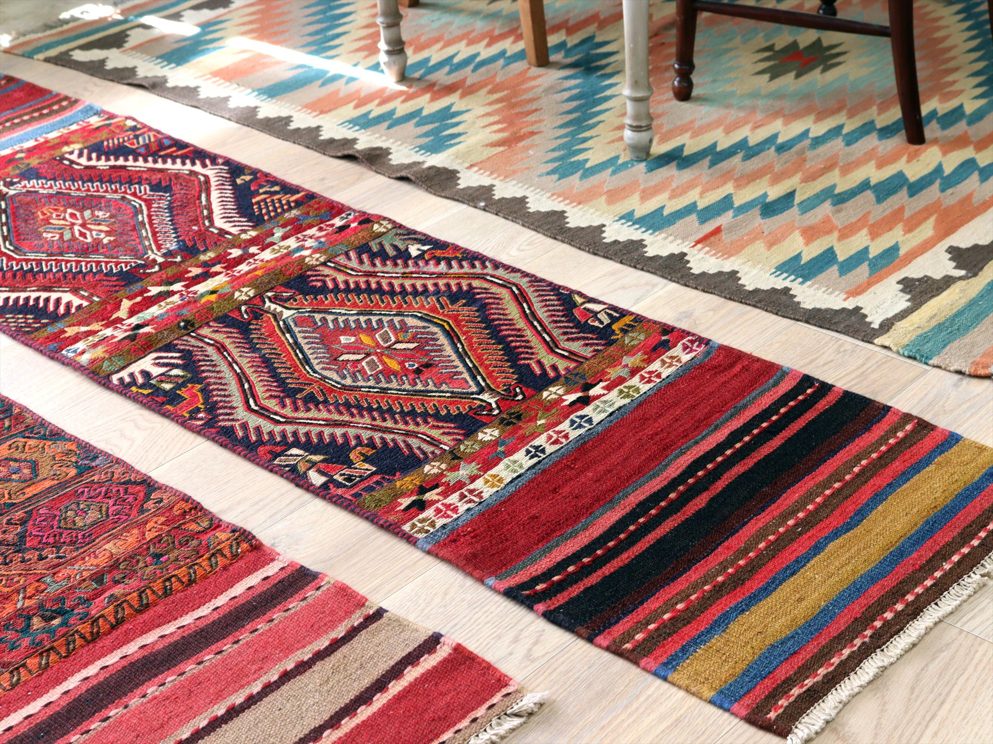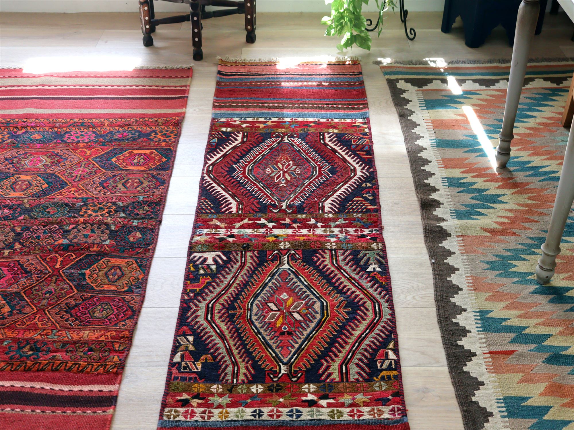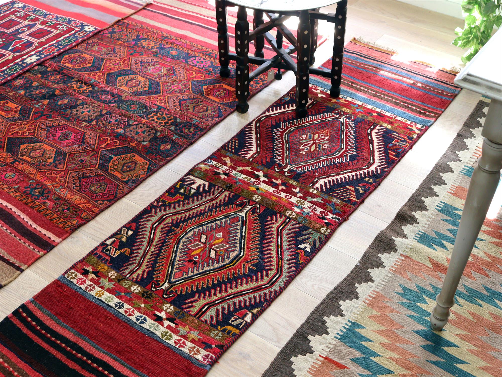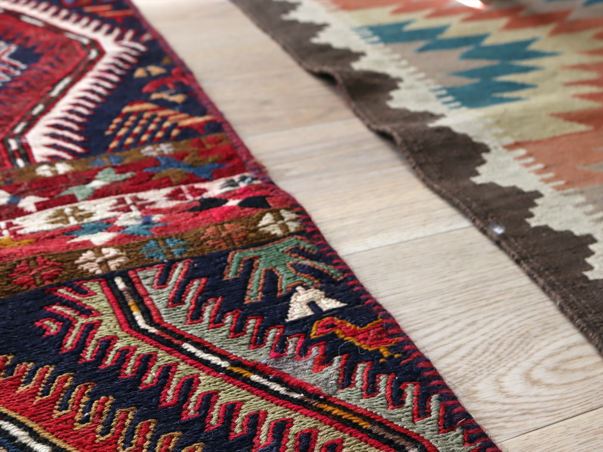 レッドやオレンジなど明るい色をメインとした、家財道具などを収納する袋(サドルバッグ)として織られたキリム。実際には縫い合わせて家財道具として使われていた様子はなく、大切に保管されていたもののようです。
