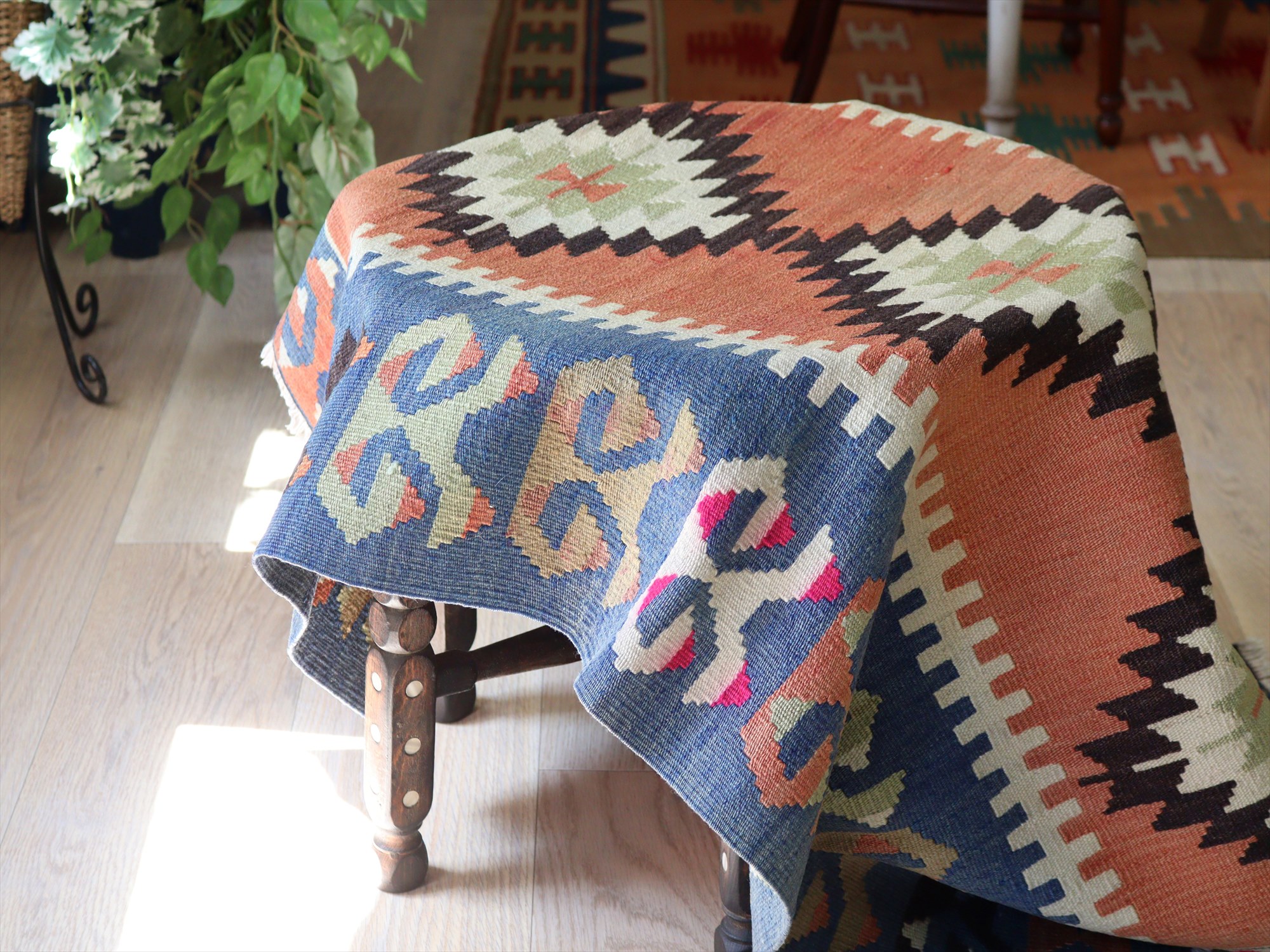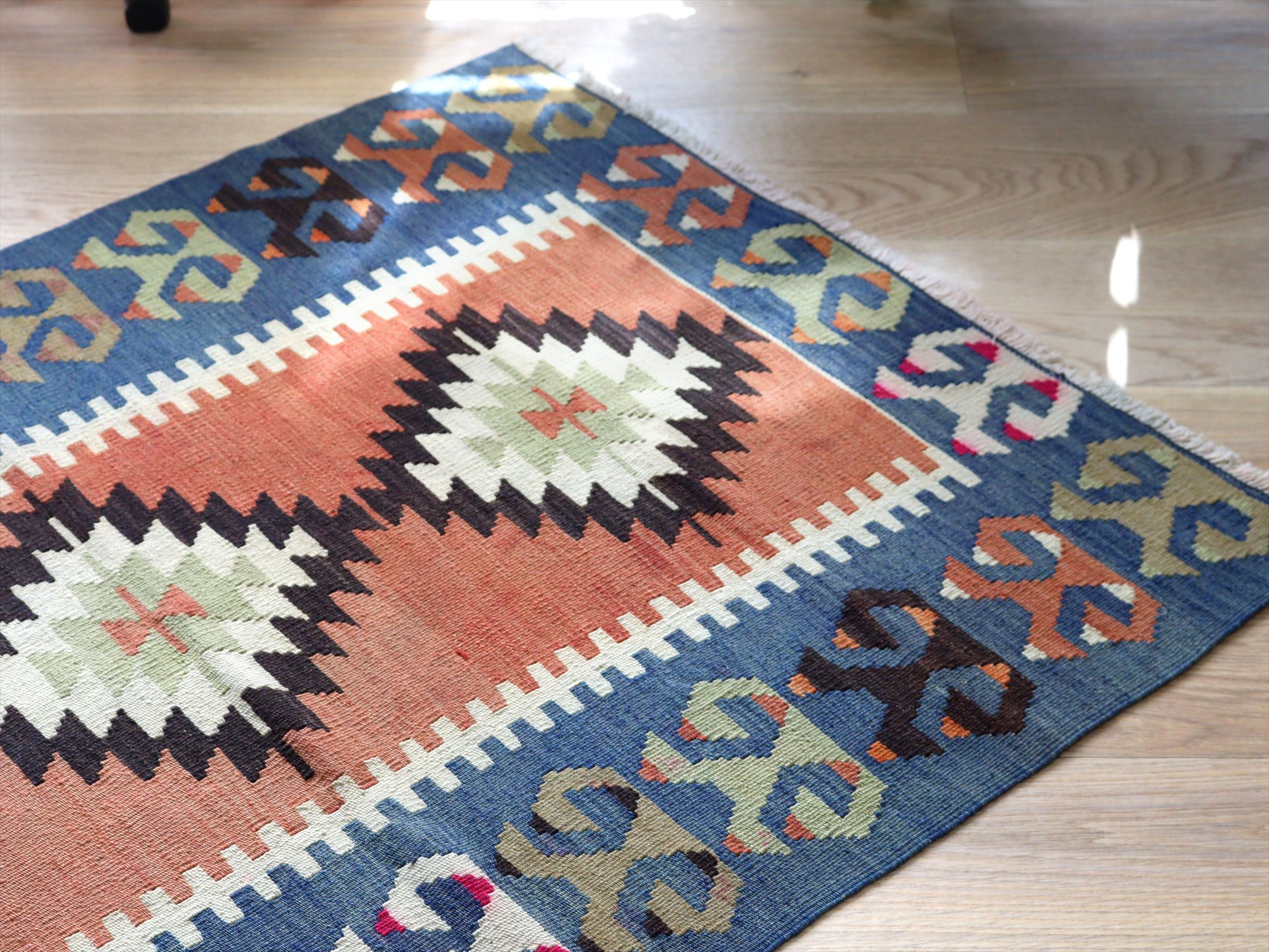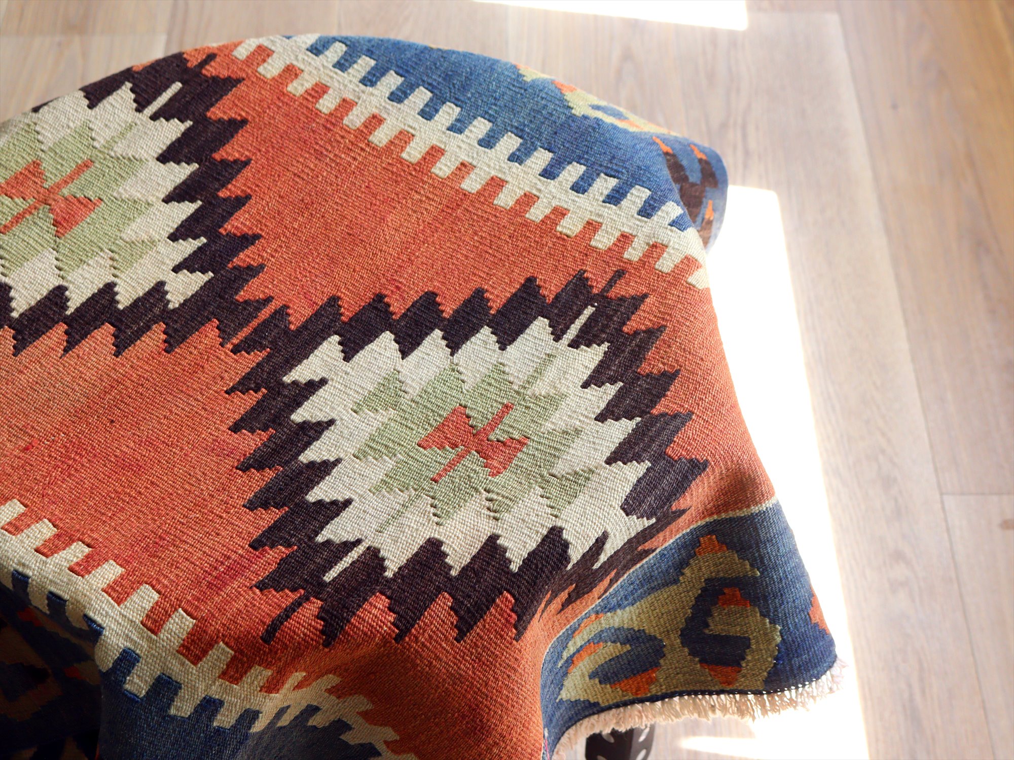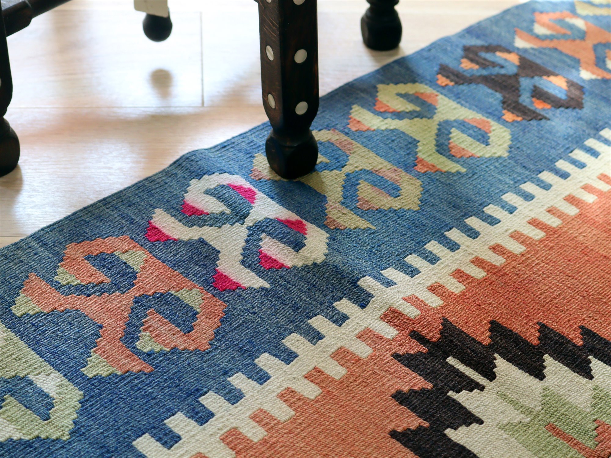 レッドとネイビーをベースとしたフィールドに、魔除けを意味するイーブルアイと、勇猛さの象徴である雄羊の角(コチボユヌズ)が織られたデザイン。もともとは鮮やかな色だったと考えられますが、日焼けしてだいぶ落ち着いた色となっています。