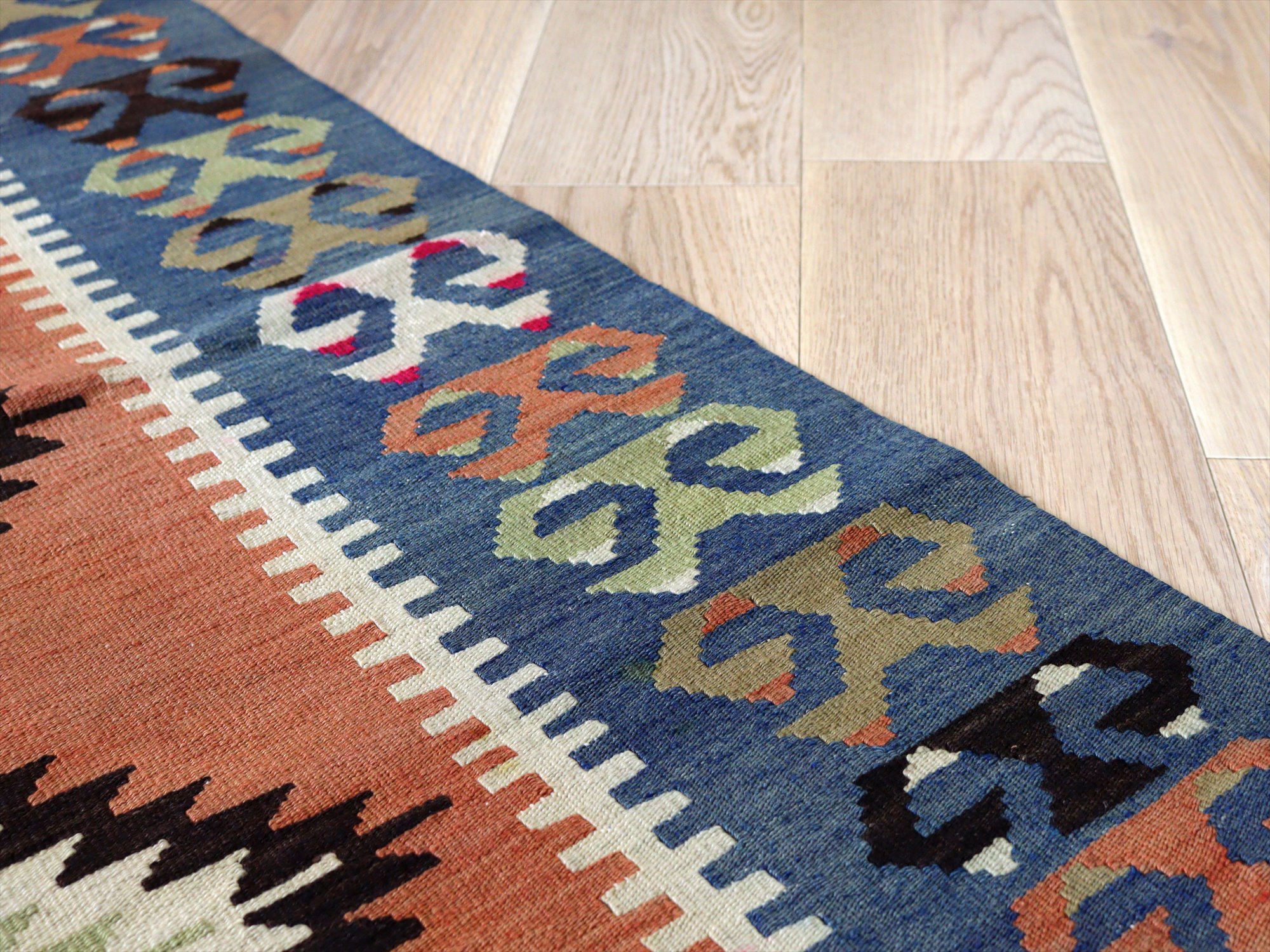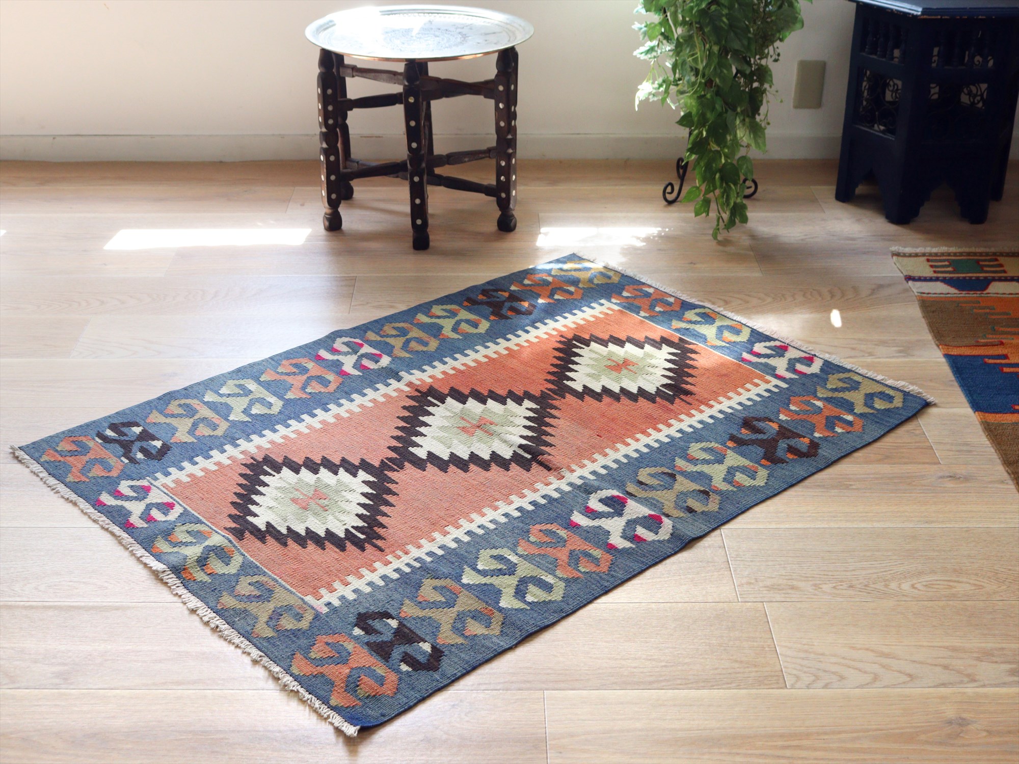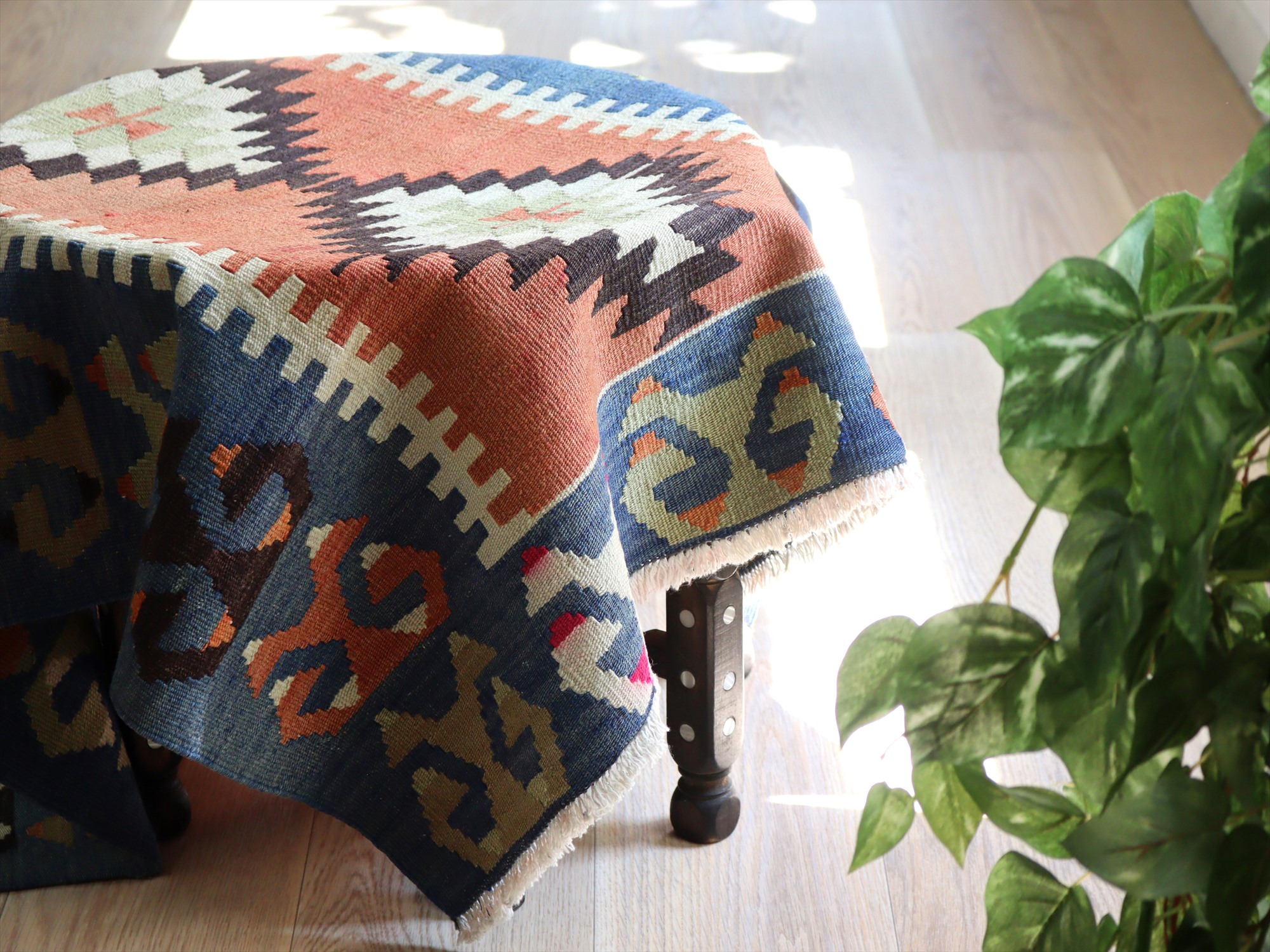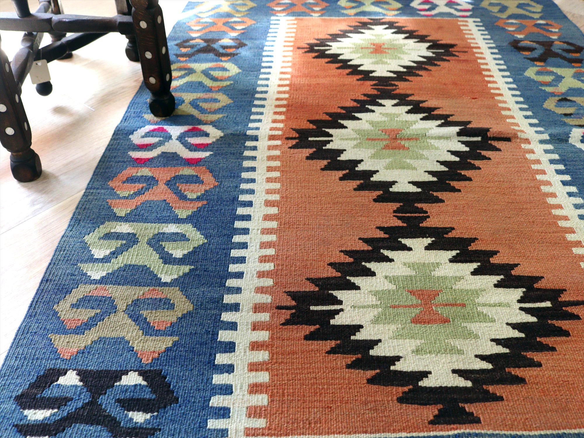 レッドとネイビーをベースとしたフィールドに、魔除けを意味するイーブルアイと、勇猛さの象徴である雄羊の角(コチボユヌズ)が織られたデザイン。もともとは鮮やかな色だったと考えられますが、日焼けしてだいぶ落ち着いた色となっています。