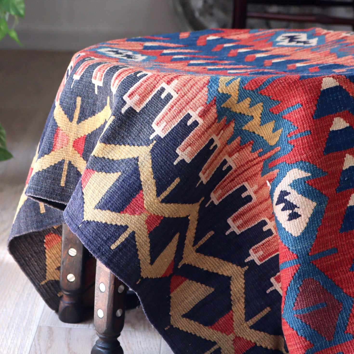 グラデーションのあるレッドと深いネイビーのコンビネーションで織られたキリム。中央にはブルーの生命の樹、ネイビーの地には強さの象徴である雄羊の角(コチボユヌズ)が織られています。