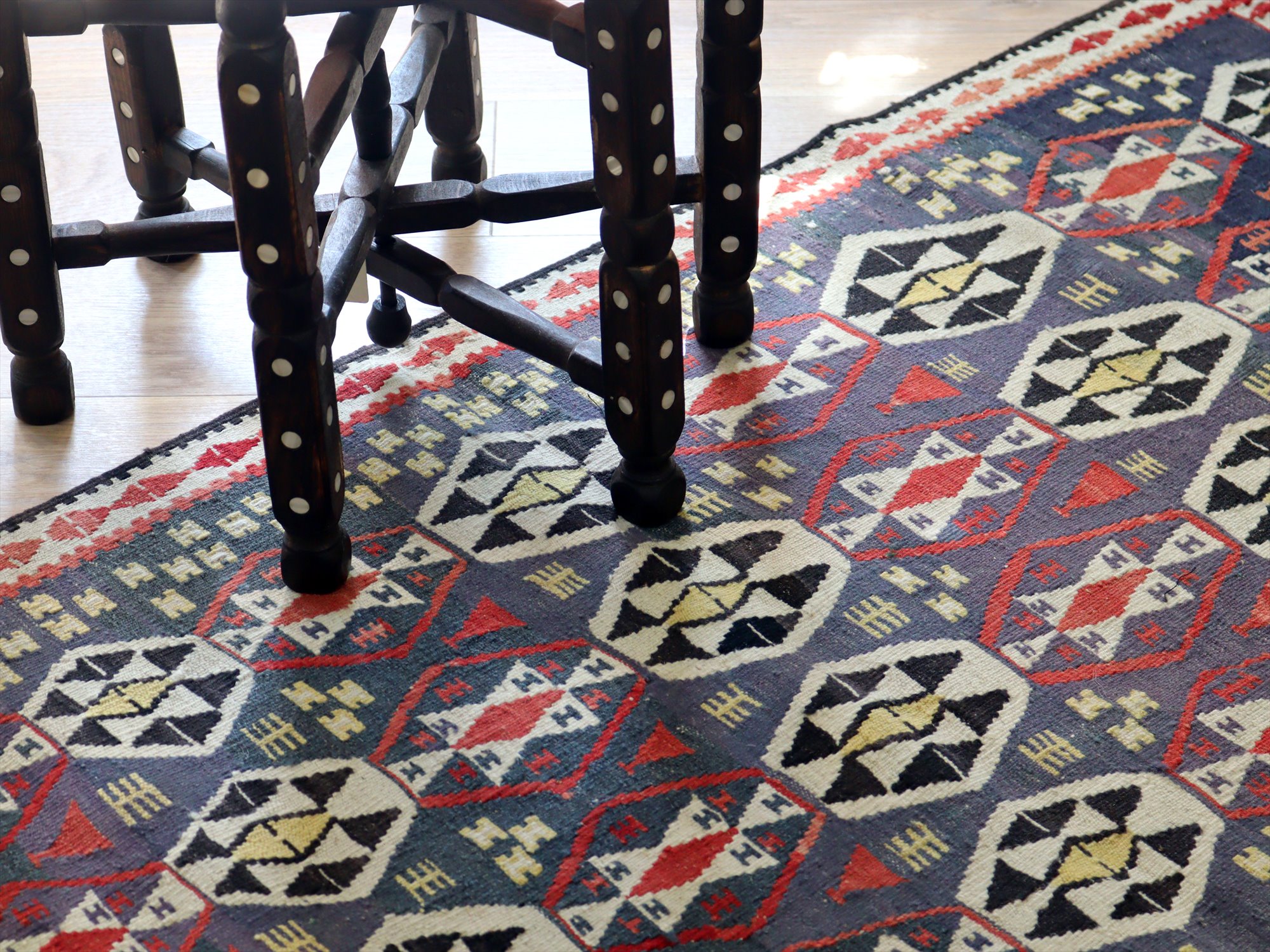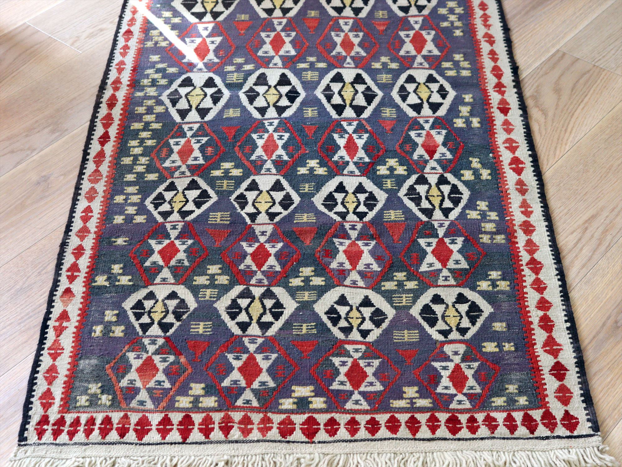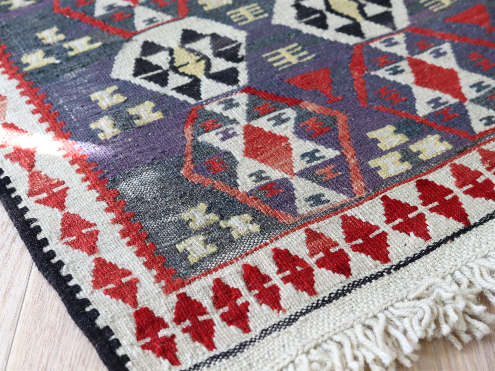 トルコ南東部、イランとの国境に近いエリアで織られたワン地方のキリム。グラデーションのあるムラサキベースに、幾何学模様が連なるように織られたデザイン。全体的にだいぶ色褪せているのがわかります。
